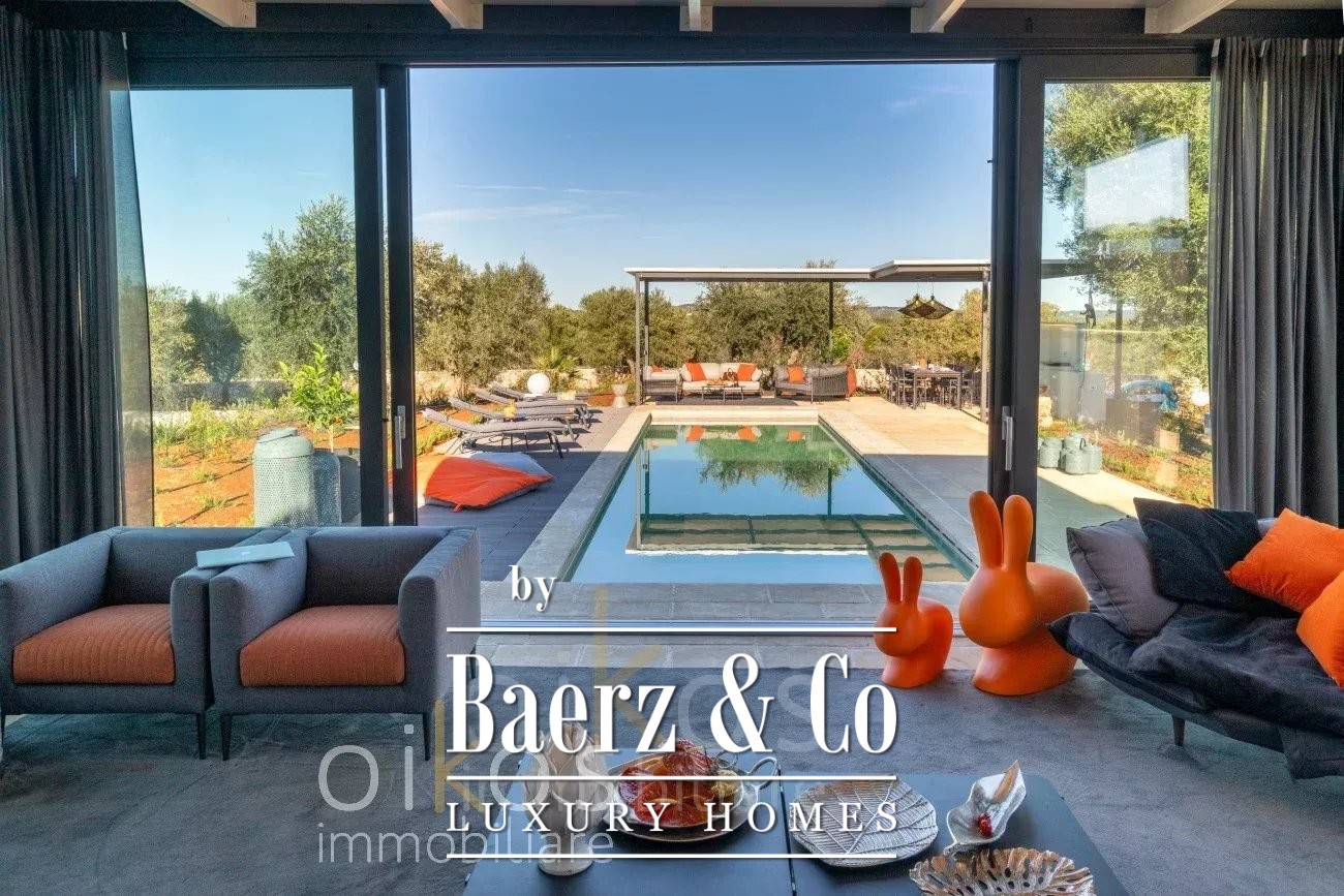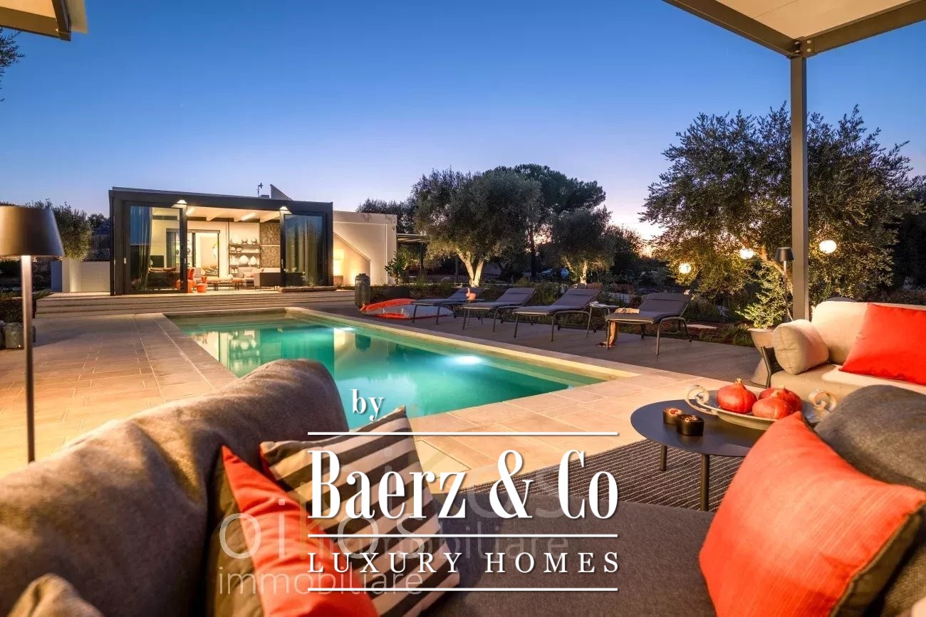 Nestled between the rolling hills of Ostuni and Cisternino, in one of the most sought-after areas of the Valle d’Itria, this villa Ostuni Puglia is a perfect blend of contemporary design, advanced technology, and the unique charm of the Apulian countryside. Built on a fully fenced private plot of 7,000 square meters, this property offers a serene oasis in a prime location with breathtaking panoramic views.