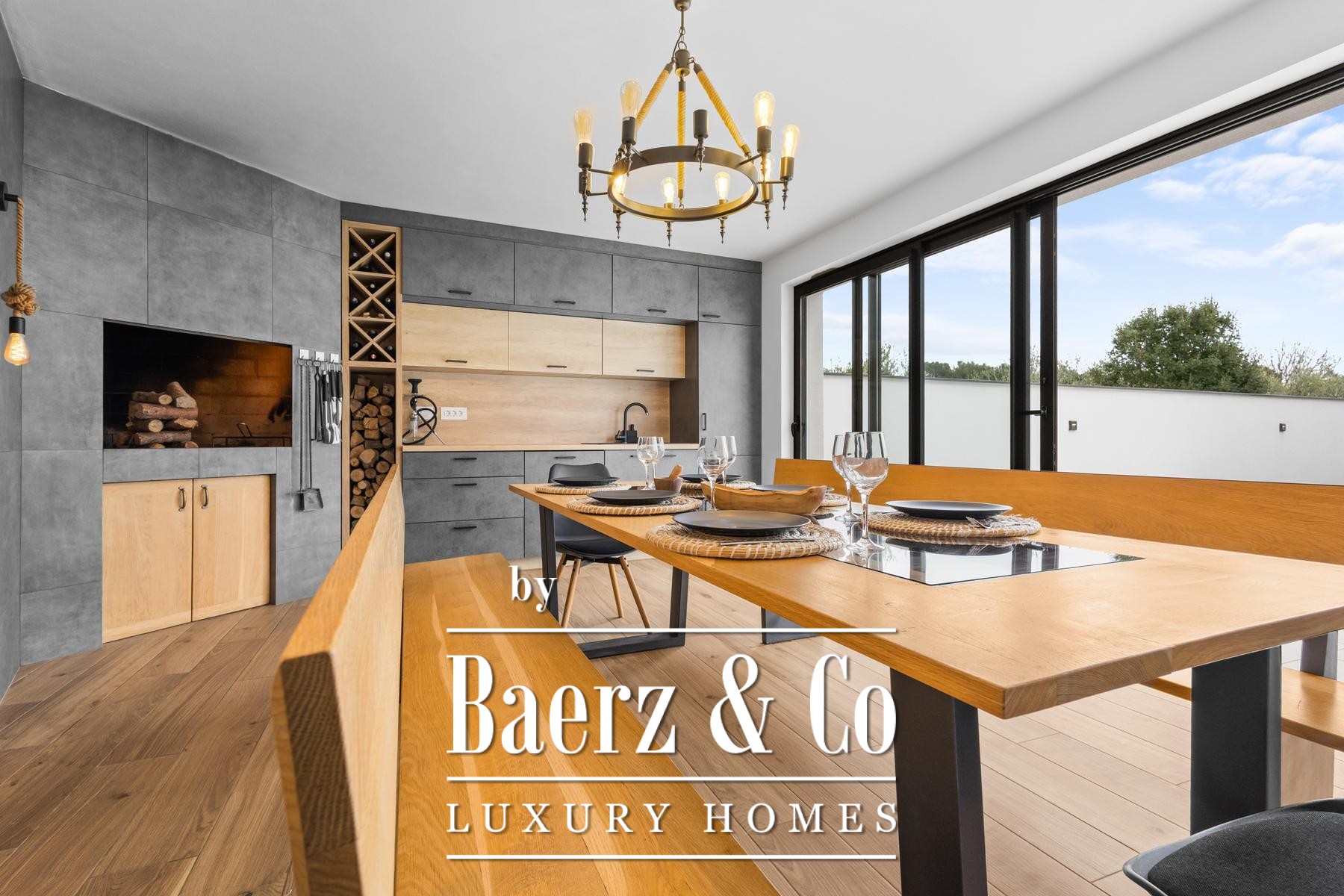 Outdoors, a heated 32 m² pool with saltwater system sits alongside a landscaped sun terrace and a 25 m² tavern with fireplace, creating a private domain for reflection or quiet gatherings. Further ease is ensured by a 35 m² garage, three additional parking spaces, video surveillance, and alarm. Technical precision is seen in underfloor heating, air conditioning throughout, and bespoke furnishings. This luxury villa for sale in Pula distills contemporary design and true comfort within its tranquil setting.