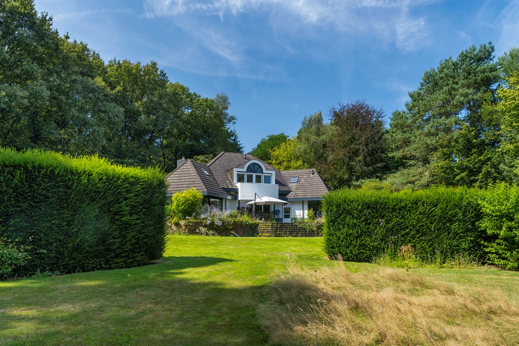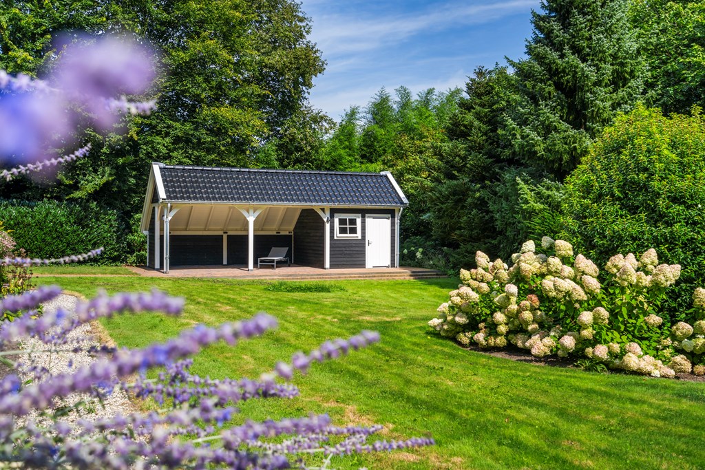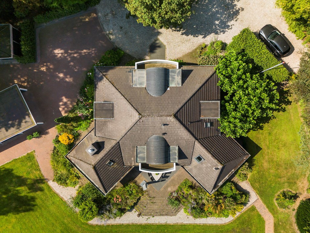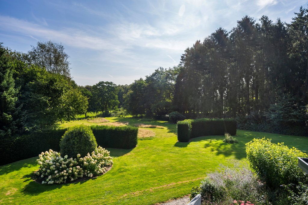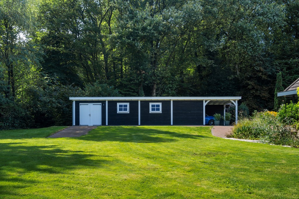 The driveway brings you onto the beautiful plot, bordered by plants and trees. The lush southeast-facing rear garden offers a green, open landscape. With a large lawn, there is ample space for children to play—or simply enjoy the peace, sun, and privacy. A paved terrace at the house provides a wonderful view over the garden. There is also a second, covered terrace where you can relax in the shade on warm days—this forms part of the new (2022) barn-style shelter with storage for garden tools, chairs, etc.