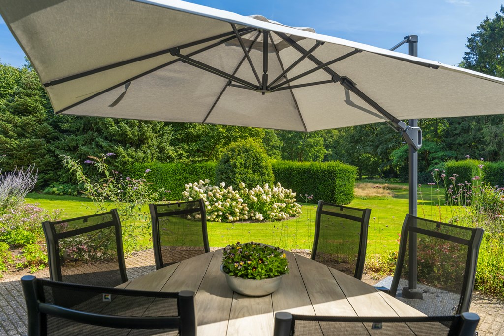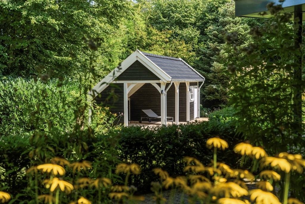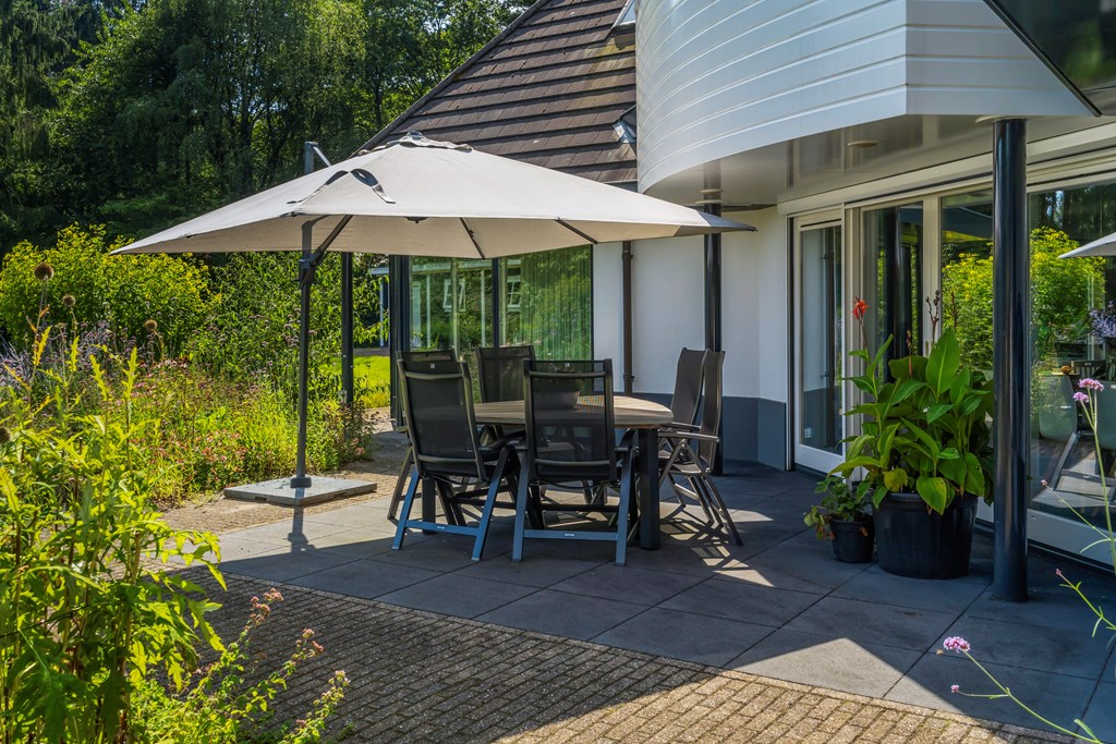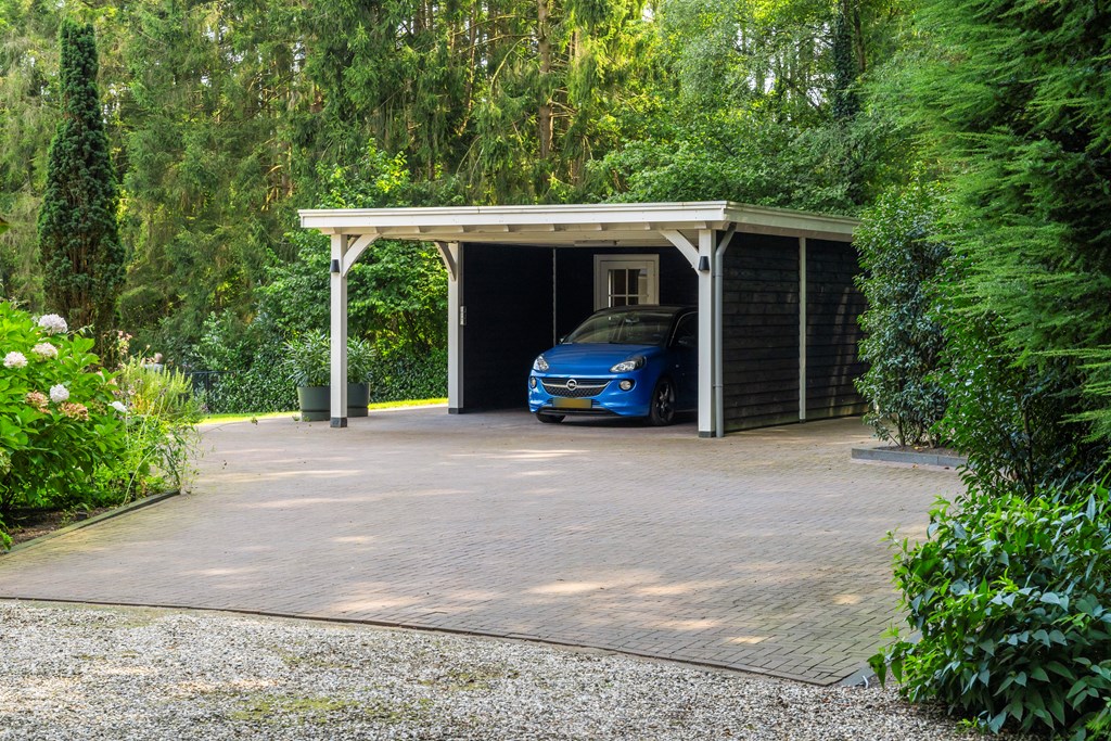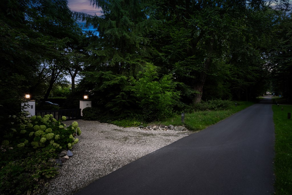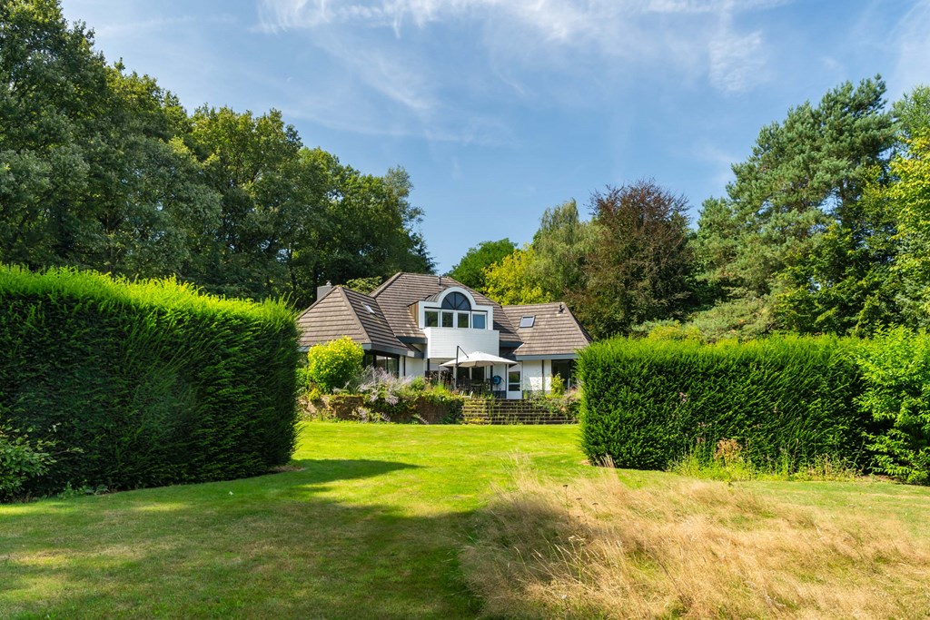 The driveway brings you onto the beautiful plot, bordered by plants and trees. The lush southeast-facing rear garden offers a green, open landscape. With a large lawn, there is ample space for children to play—or simply enjoy the peace, sun, and privacy. A paved terrace at the house provides a wonderful view over the garden. There is also a second, covered terrace where you can relax in the shade on warm days—this forms part of the new (2022) barn-style shelter with storage for garden tools, chairs, etc.