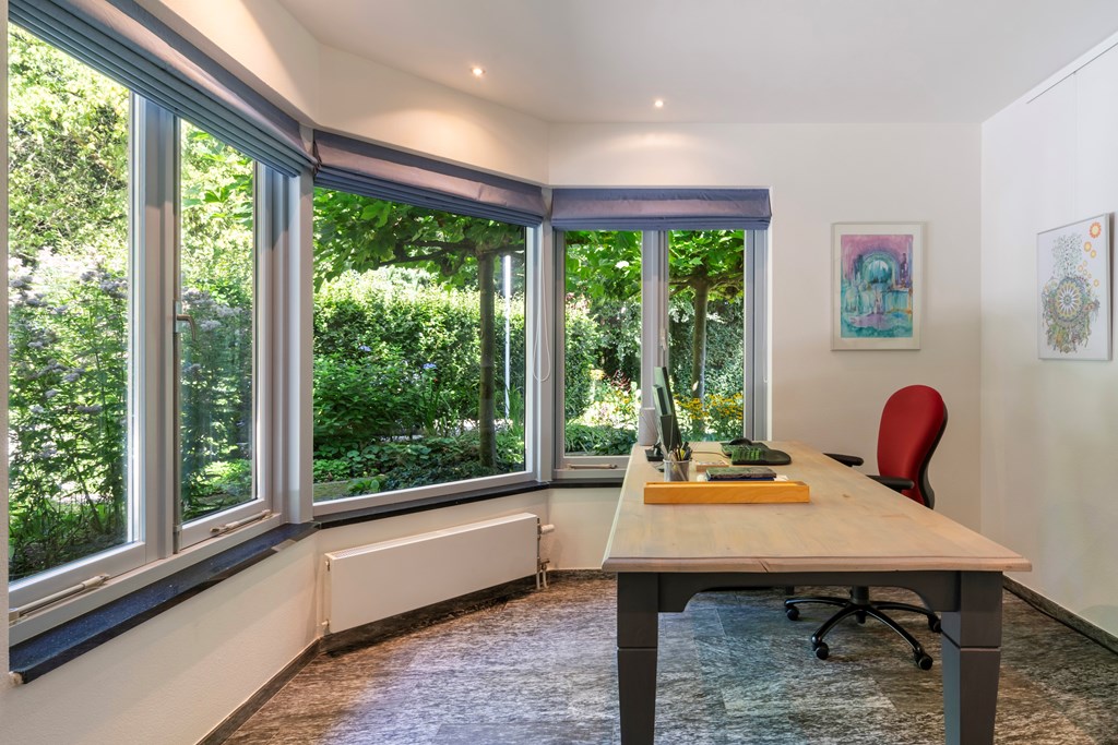 You enter a spacious, bright hallway giving access to the living room, a study, WC, meter cupboard (21 circuits + fiber), and the staircase. The study is ideal—perfectly placed for receiving clients, for example. The generous living room has a distinctive layout, making it easy to create multiple seating areas. Large windows all around provide beautiful garden views and abundant light; a cosy gas fireplace adds warmth. Twin sliding doors open directly onto the sunny rear garden. On the sunny side, external screens provide extra comfort.