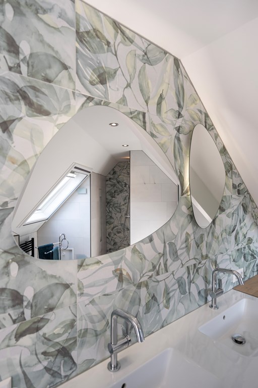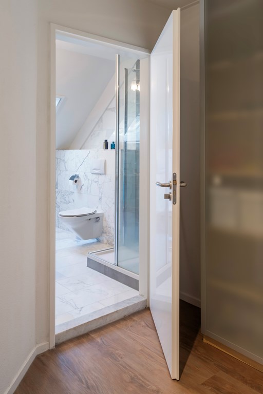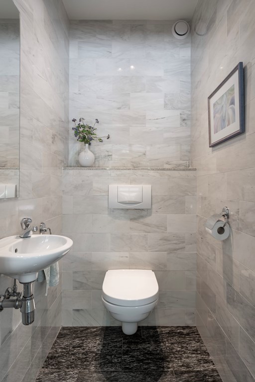 On the ground floor, the hall includes a separate WC with small washbasin. On the first floor there are two bathrooms. The en-suite bathroom to the primary bedroom was fully renewed in 2020 and finished to a luxury standard with a walk-in shower, Sunshower, designer radiator, double washbasin, and toilet; the tiled floor has underfloor heating for extra comfort. The second bathroom, finished with white marble tiles, includes a shower, washbasin, toilet, and designer radiator.