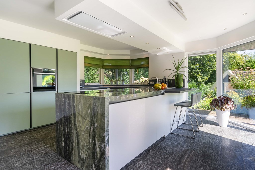 The generous U-shaped kitchen (installed in 2020) is fitted with high-quality appliances. Thanks to its ample size and practical layout, it has everything you need: a large natural-stone worktop, five-burner hob, baking oven, ceiling-mounted extractor unit, dishwasher, tall refrigerator, tall freezer, and extensive cabinet storage. This modern kitchen offers plenty of space for serious cooking. From here you have a lovely view of the side and rear garden and direct access to the terrace.
