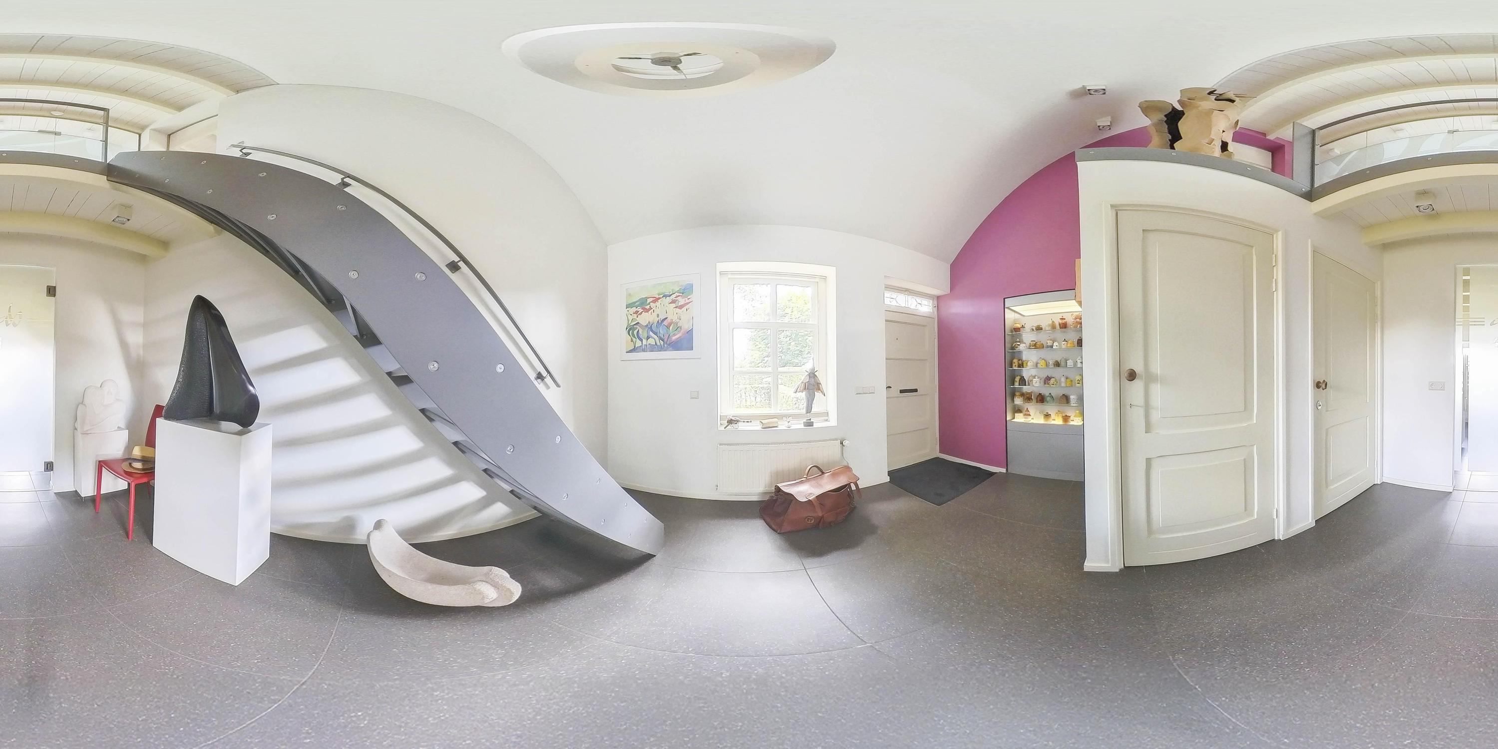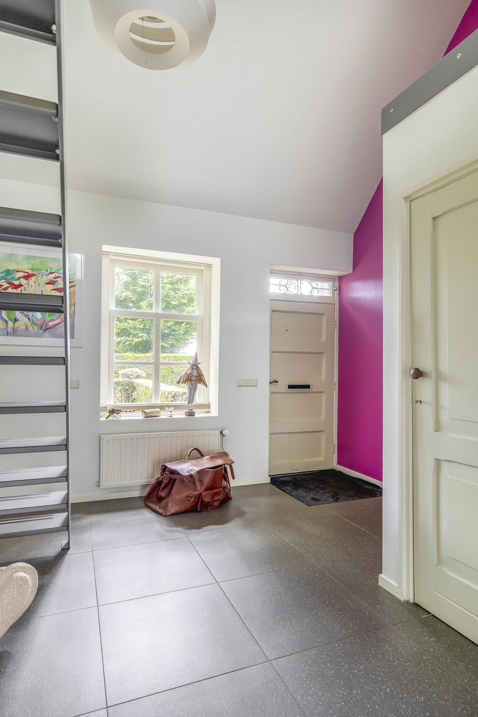 Upon entering the entrance hall, you will immediately notice the tiled floor with underfloor heating in combination with the sleek plastered walls and plastered ceiling. The beautiful view of the first floor through the loft and staircase to the upper floor is particularly striking. In the hall, you will also find the meter cupboard with a completely renovated interior, equipped with an extensive group layout and three-phase power. The hall also contains a fully tiled toilet with wall-mounted toilet, washbasin, urinal, and mechanical ventilation.
