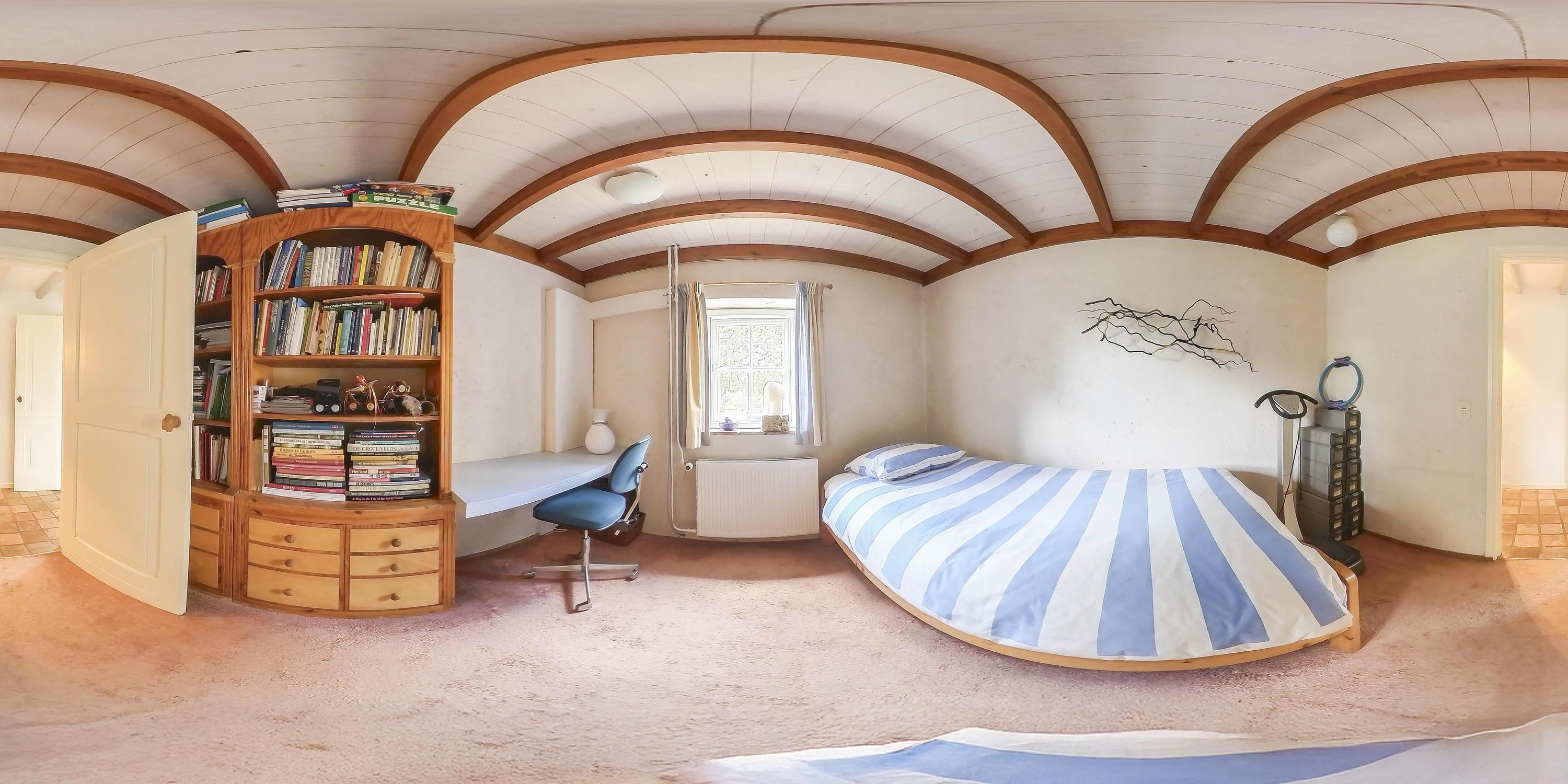 The first bedroom on this floor, located entirely on the left side of the farmhouse, is finished with carpet, stucco walls, and a beamed ceiling. This room has a large Velux skylight at the rear and a beautiful high window that extends into the kitchen on the ground floor. This spacious bedroom also has a built-in bookcase in the wall. Bedroom two, located in the middle of the house, has a similar finish and three large skylights that provide plenty of light.
