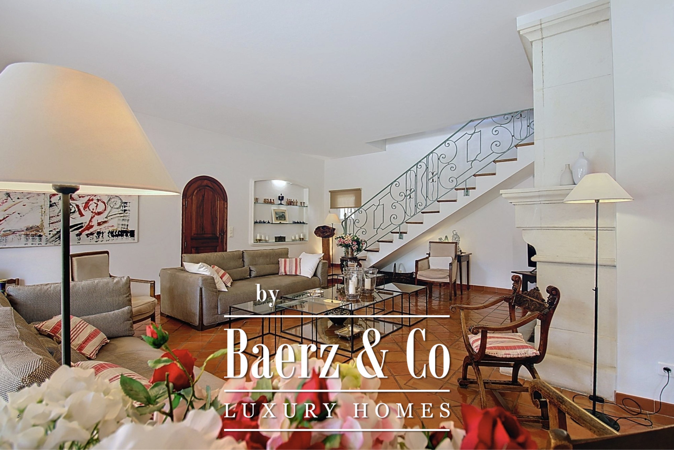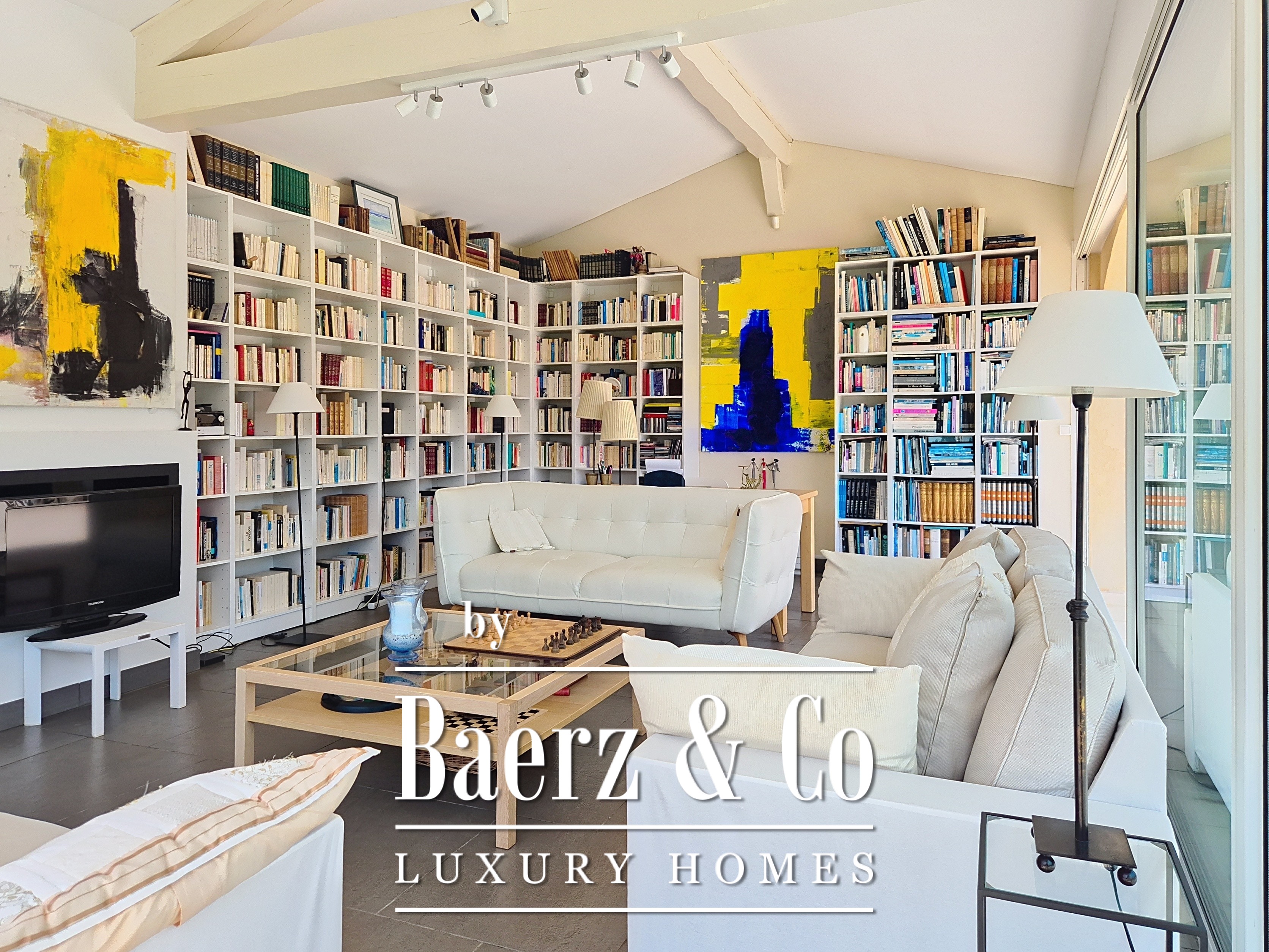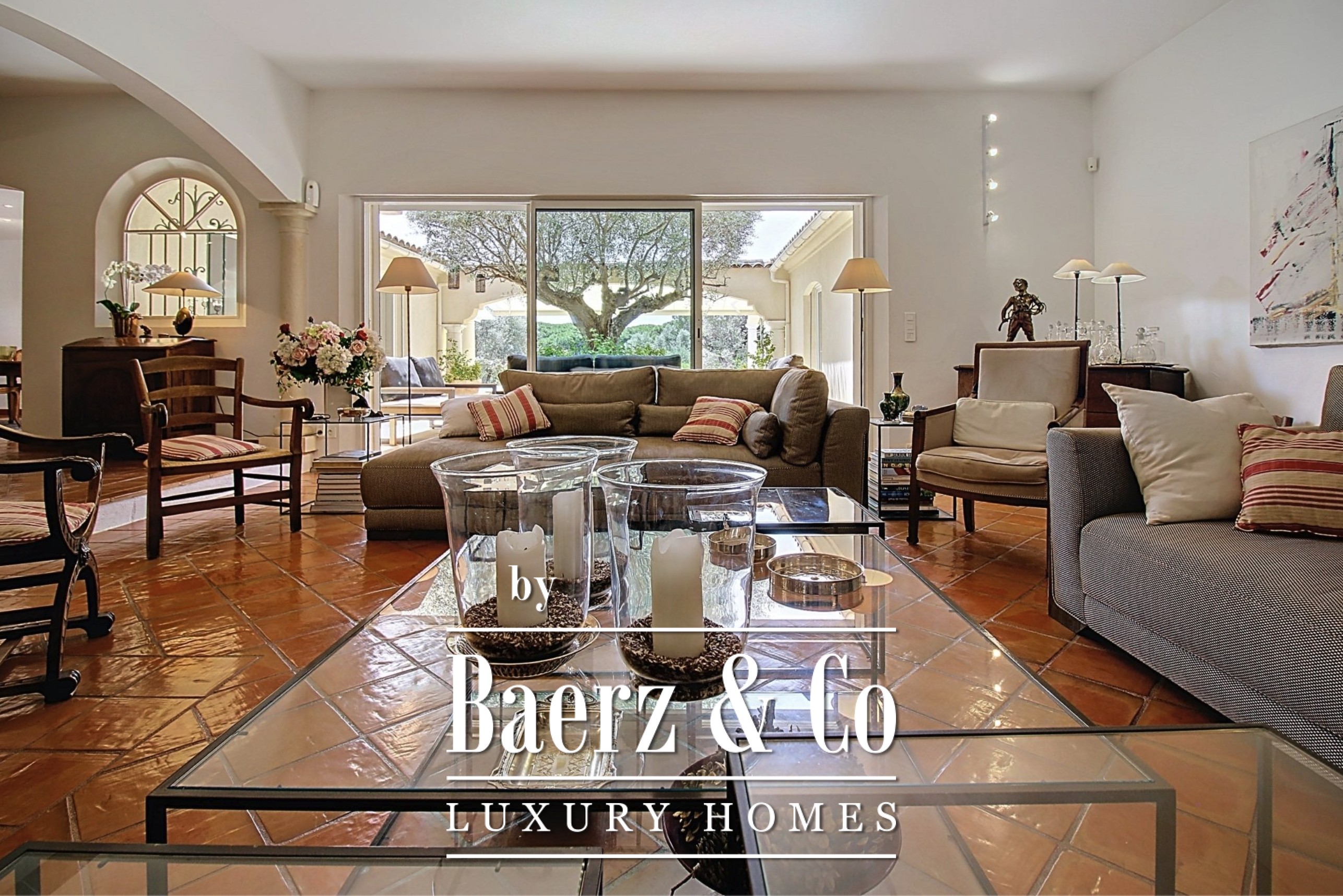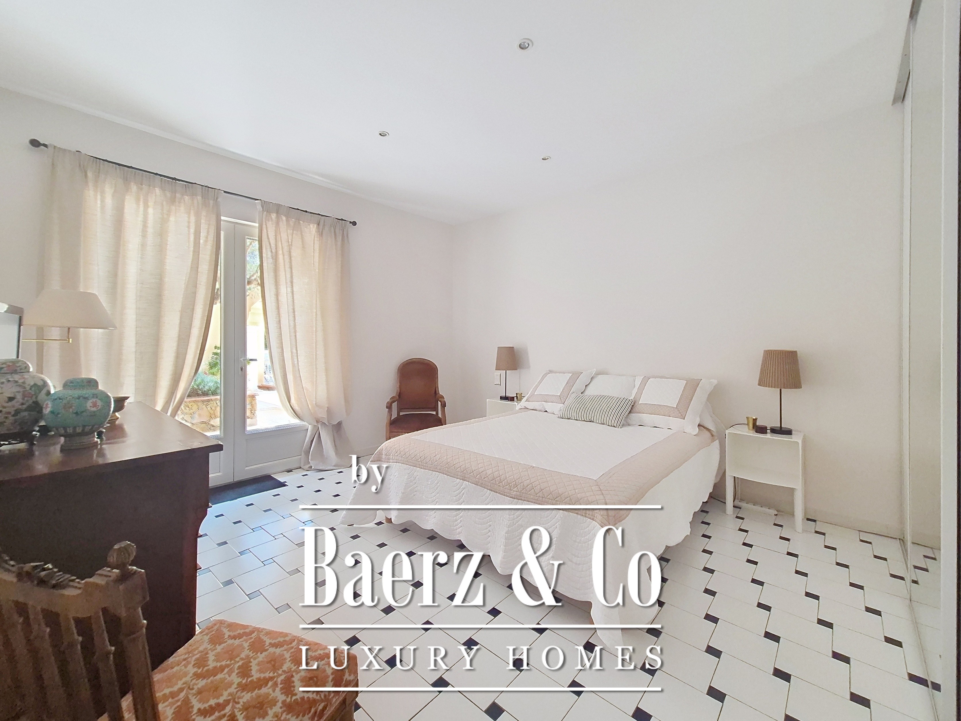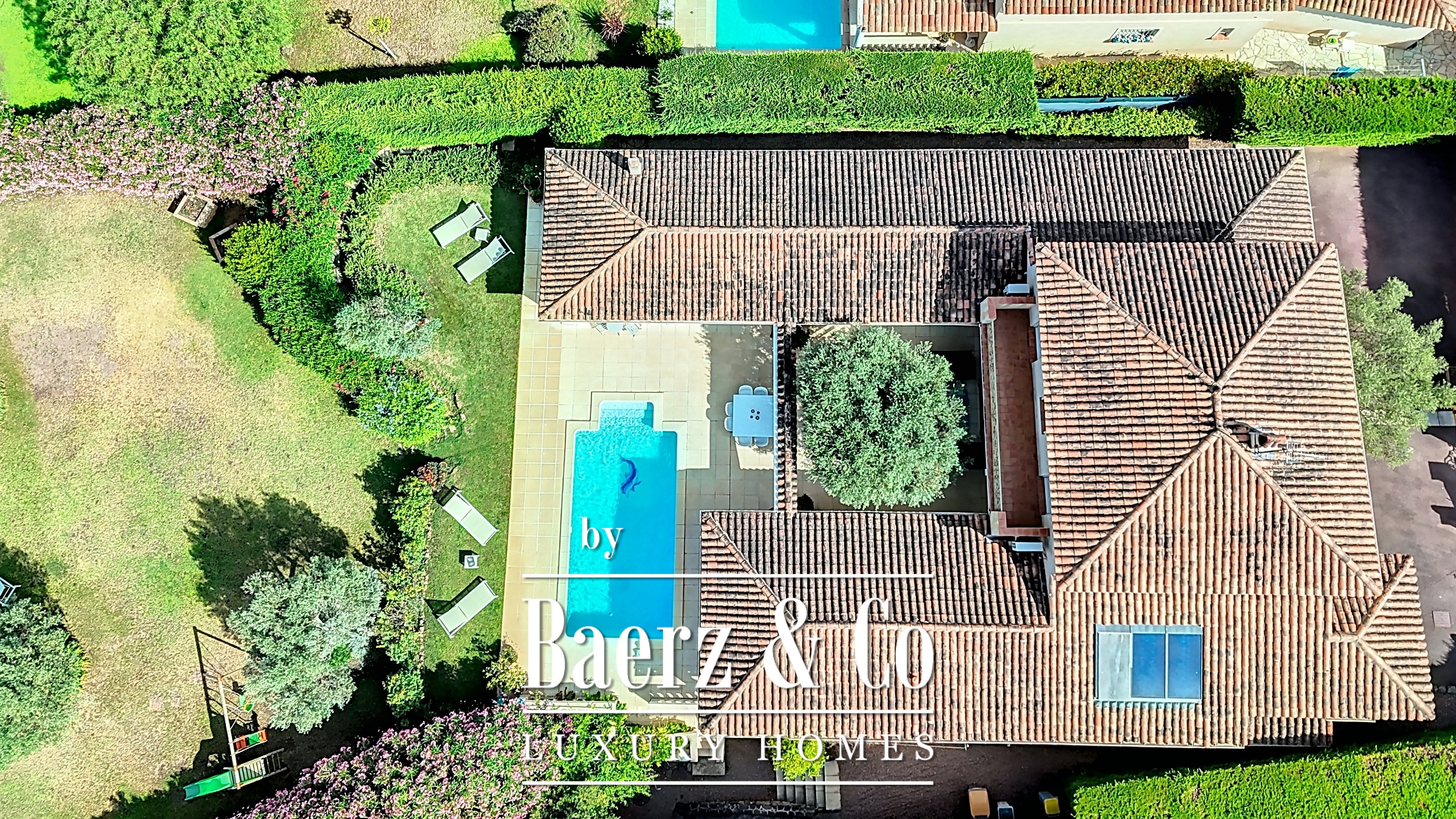 Mostly on one level, it features a unique U-shaped design around a peaceful patio with a century-old olive tree. The property includes 5 bedrooms, a stunning library-office, heated pool, fruit garden, pétanque court, and direct access to the pine forest bordering the Valescure golf course.