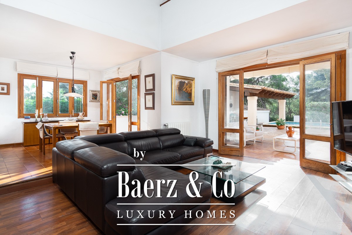 Quality materials—parquet floors, air conditioning, gas central heating—create a quietly refined atmosphere. Outside, a large freshwater pool, summer kitchen with barbecue, and thoughtfully tended gardens set the stage for relaxed Mediterranean living. The villa includes a garage and terraces, all within Santa Ponça, a coastal enclave offering a refined promenade, reliable infrastructure, and swift access to Palma in twenty minutes and the airport in thirty. This property articulates location and potential in one of Mallorca’s most desirable addresses.