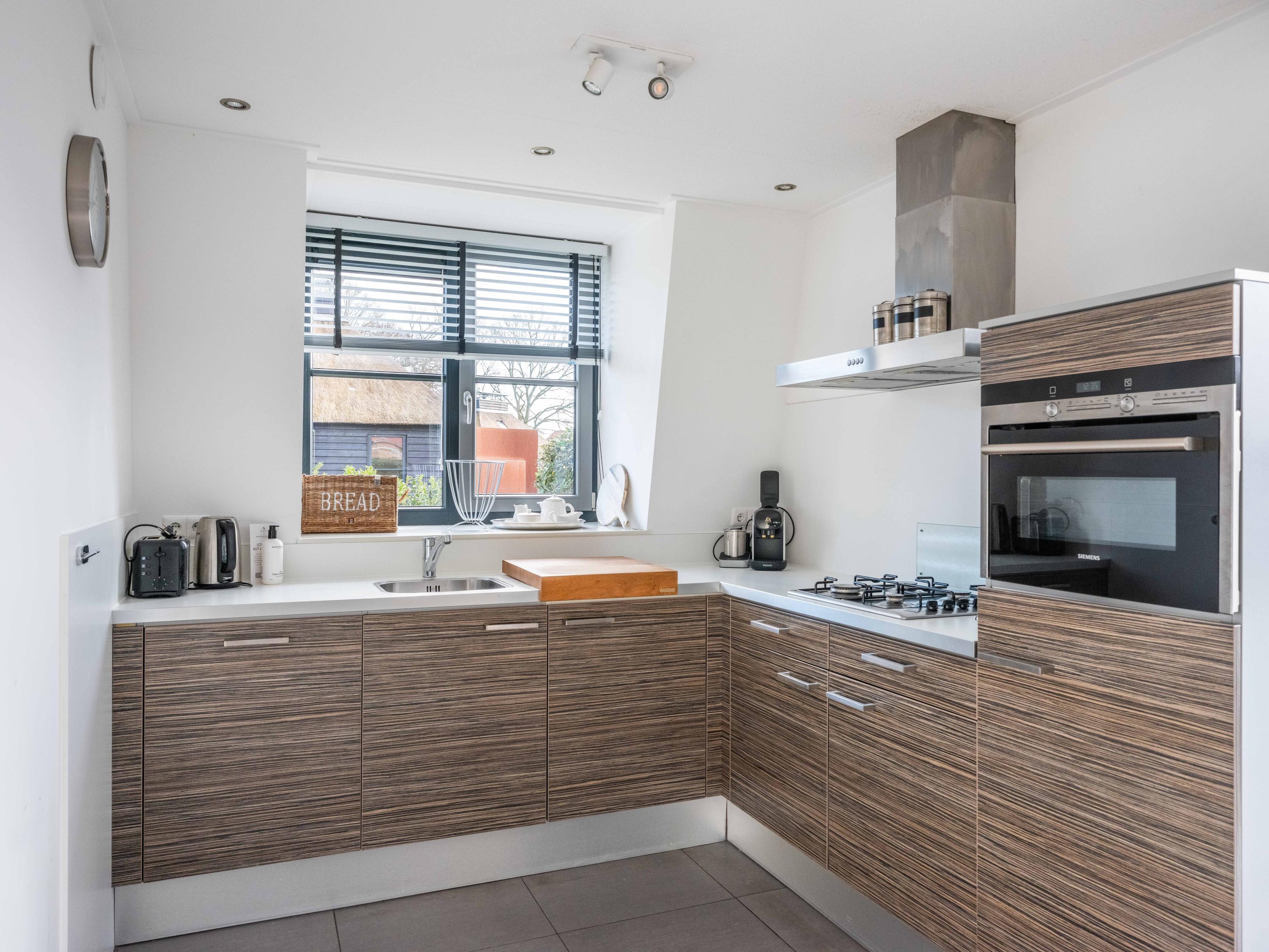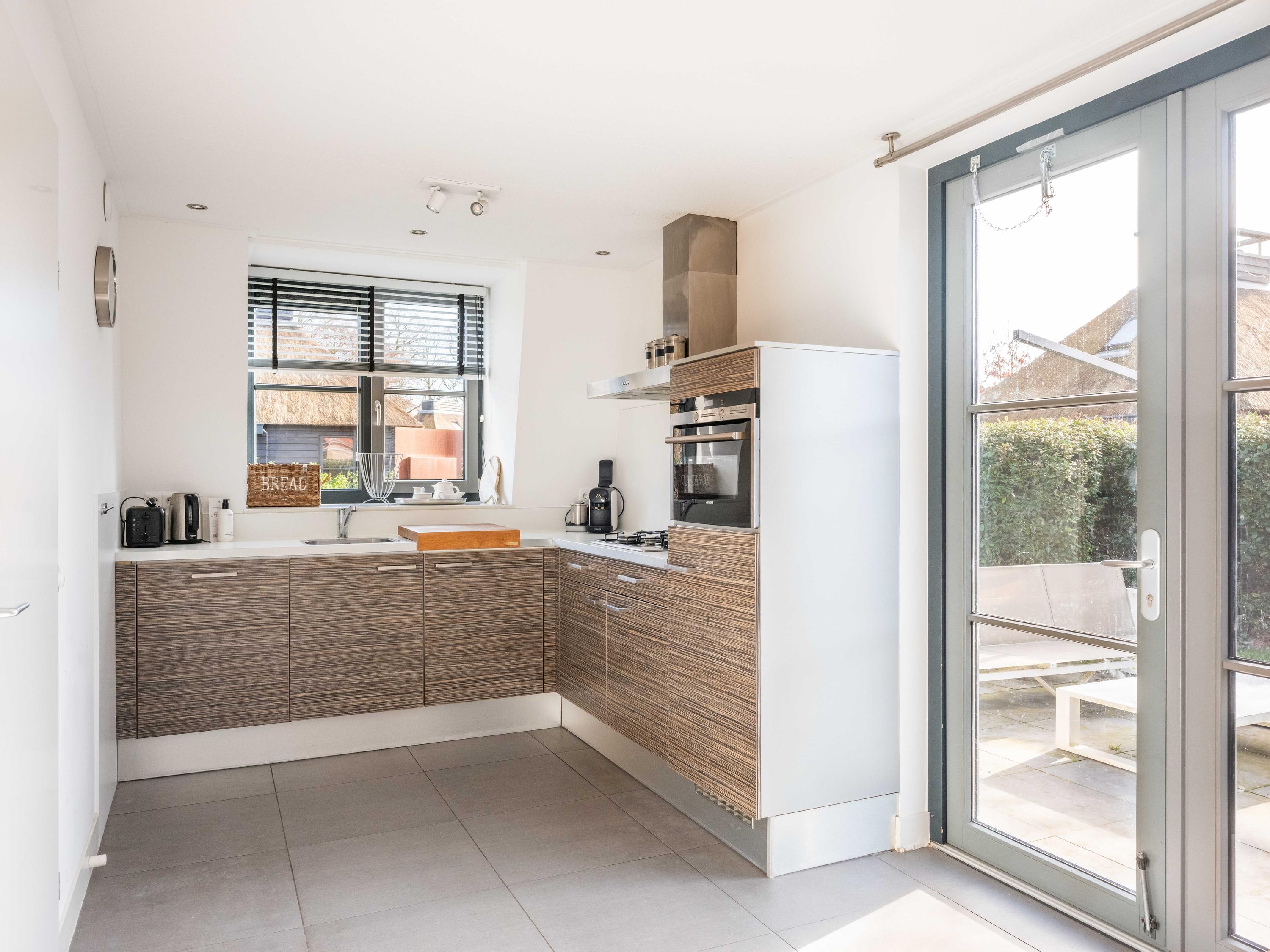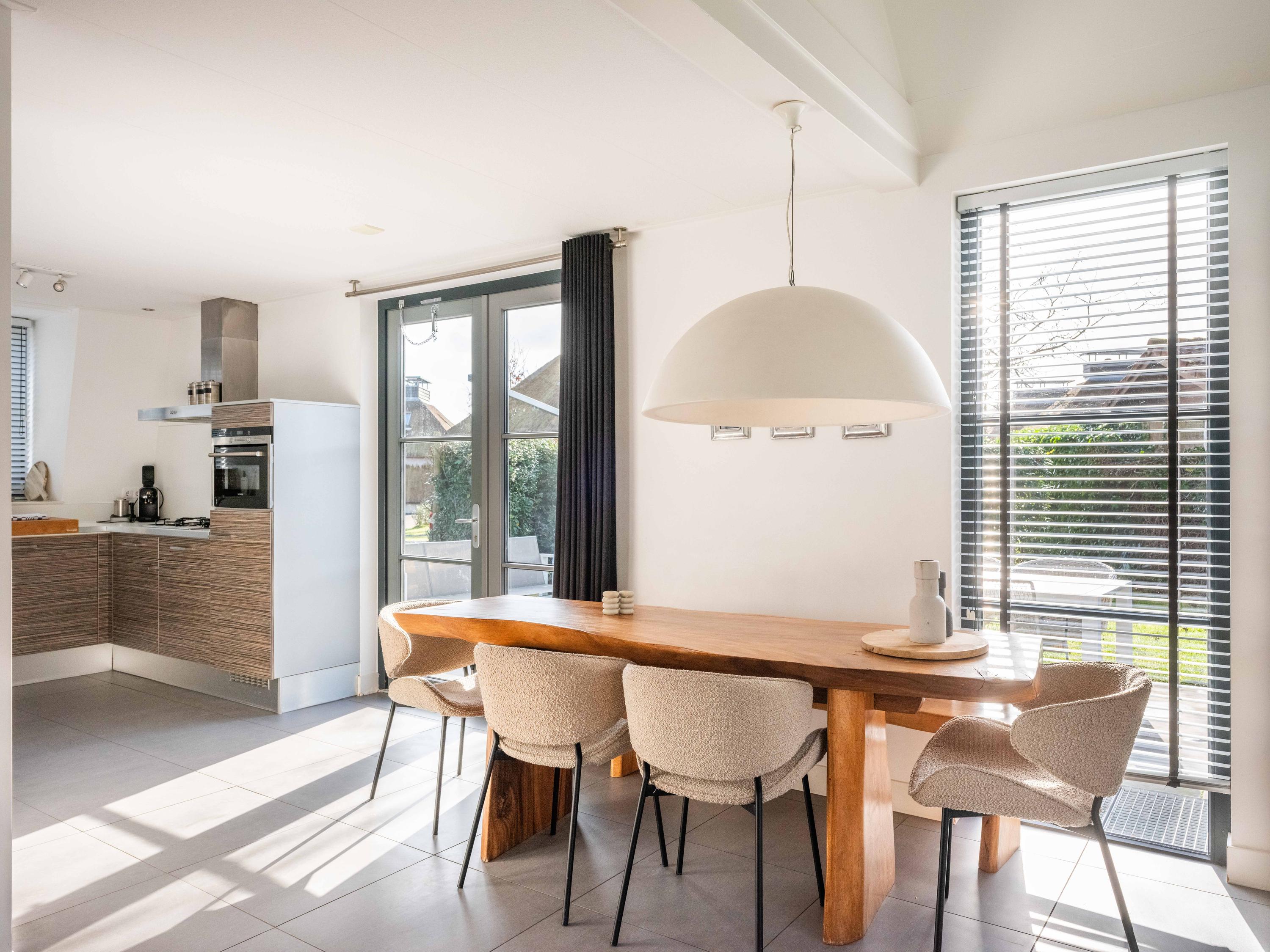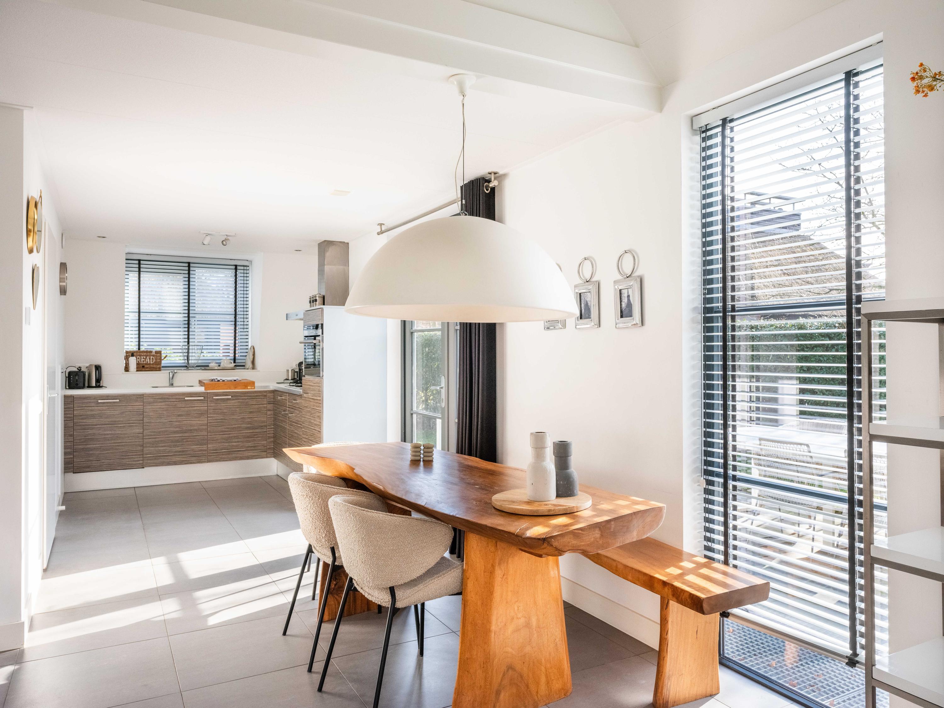 De lichte woonkamer met open keuken is ruim opgezet en biedt zowel een eetgedeelte als een zithoek met een sfeervolle gashaard. De keuken is uitgerust met o.a. een 4-pits gasfornuis, een vaatwasser, een combimagnetron en een afzuigkap. Vanuit de woonkamer leiden openslaande deuren naar de tuin en het terras. Zowel de begane grond als de kelder zijn voorzien van vloerverwarming en er ligt een plavuizen vloer.