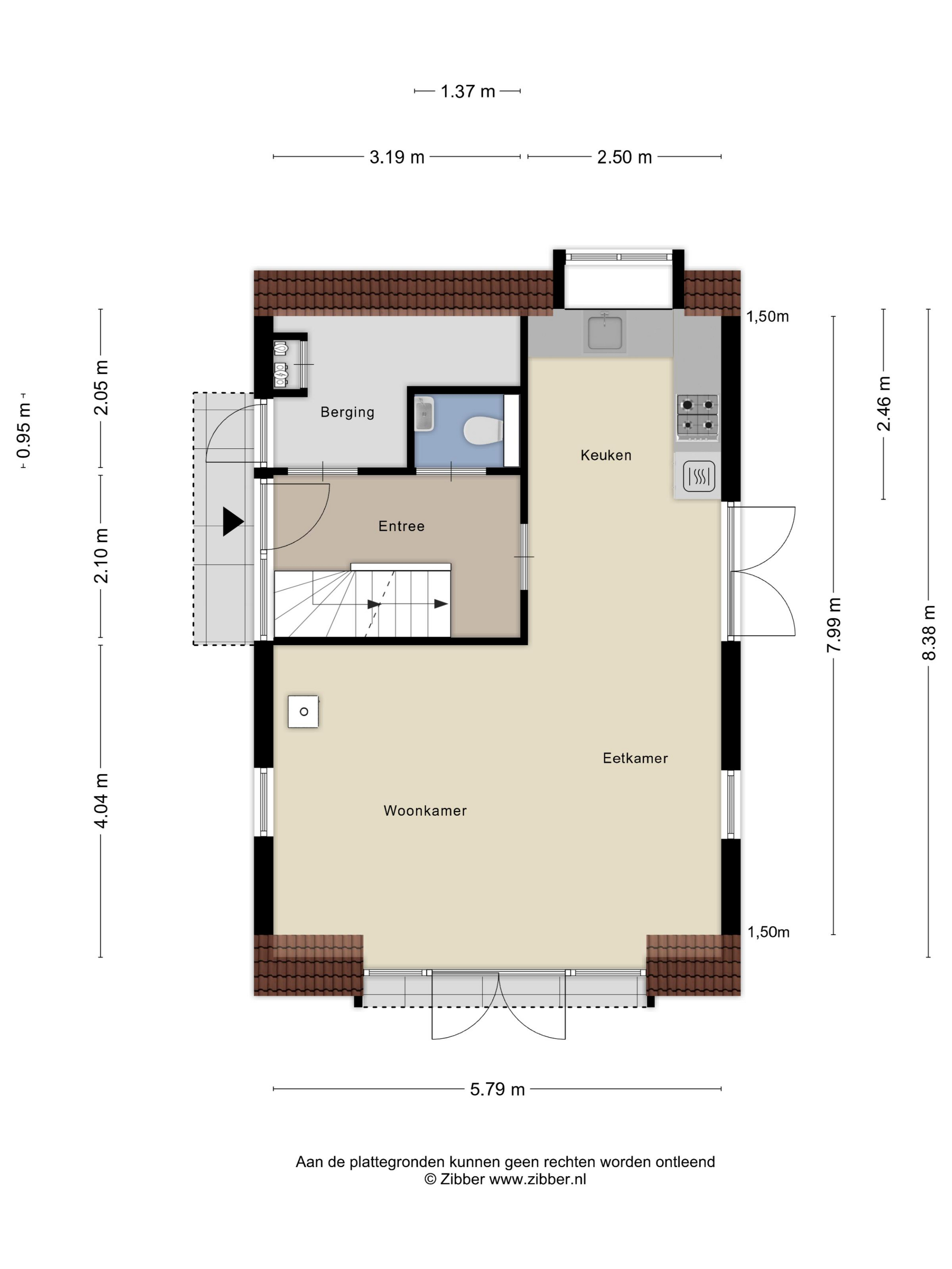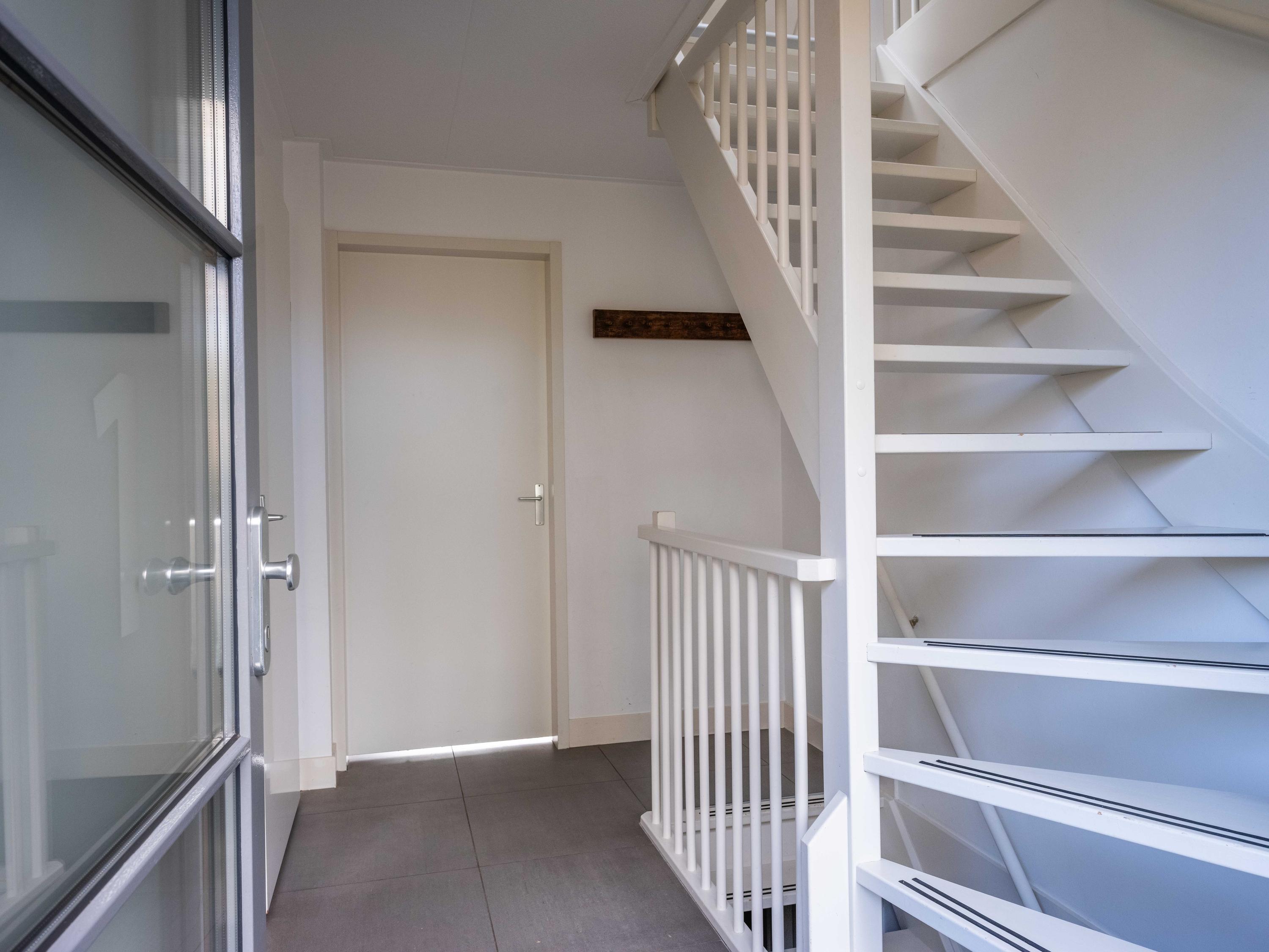 Via de entree betreedt u de hal, waar zich een berging, een wasruimte met aansluitingen voor wasmachine en droger, de meterkast, een toilet en de trappen naar zowel de boven- als benedenverdieping bevinden.