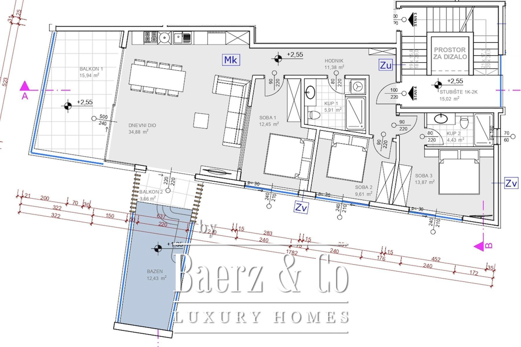 private bathroom, one separate bathroom, and a spacious terrace with a swimming pool and sea view. Each room has air conditioning, and the apartment also has underfloor heating. The building is equipped with an elevator.The building is located only 40 meters from the sea. This is a luxury project consisting of two buildings, with a total of 9 apartments, where each apartment has a private pool.We are at your disposal for all other information.