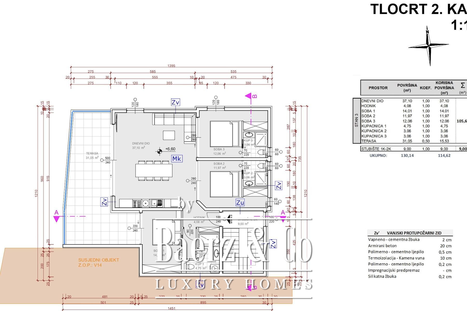 Grebaštica, luxury penthouse with a sea view NKP 105.62 m² and a roof terrace with a swimming pool. The apartment is located on the second floor of a modern building, second row to the sea. It comes with two parking spaces in the garage and a large storage room in the basement. The area of the closed space is 90.09 m², and the area of the terrace is 31.05 m².The apartment consists of a living room with kitchen and dining room, three bedrooms, each with a private bathroom,