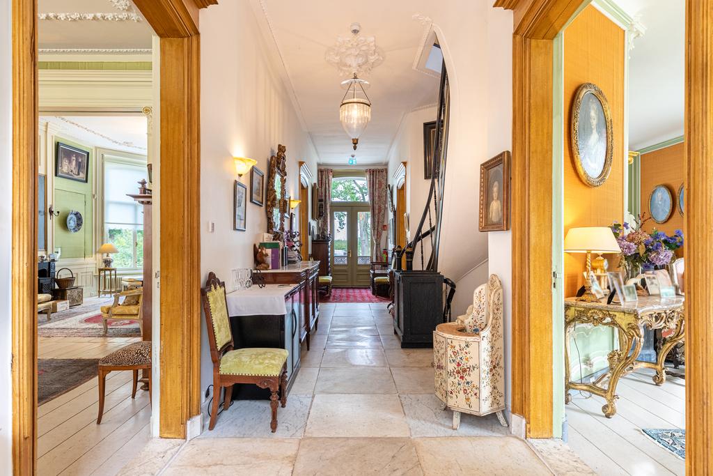 The interior is rich in period details, including ornate fireplaces, damask wall coverings, refined staircases and bespoke finishes.