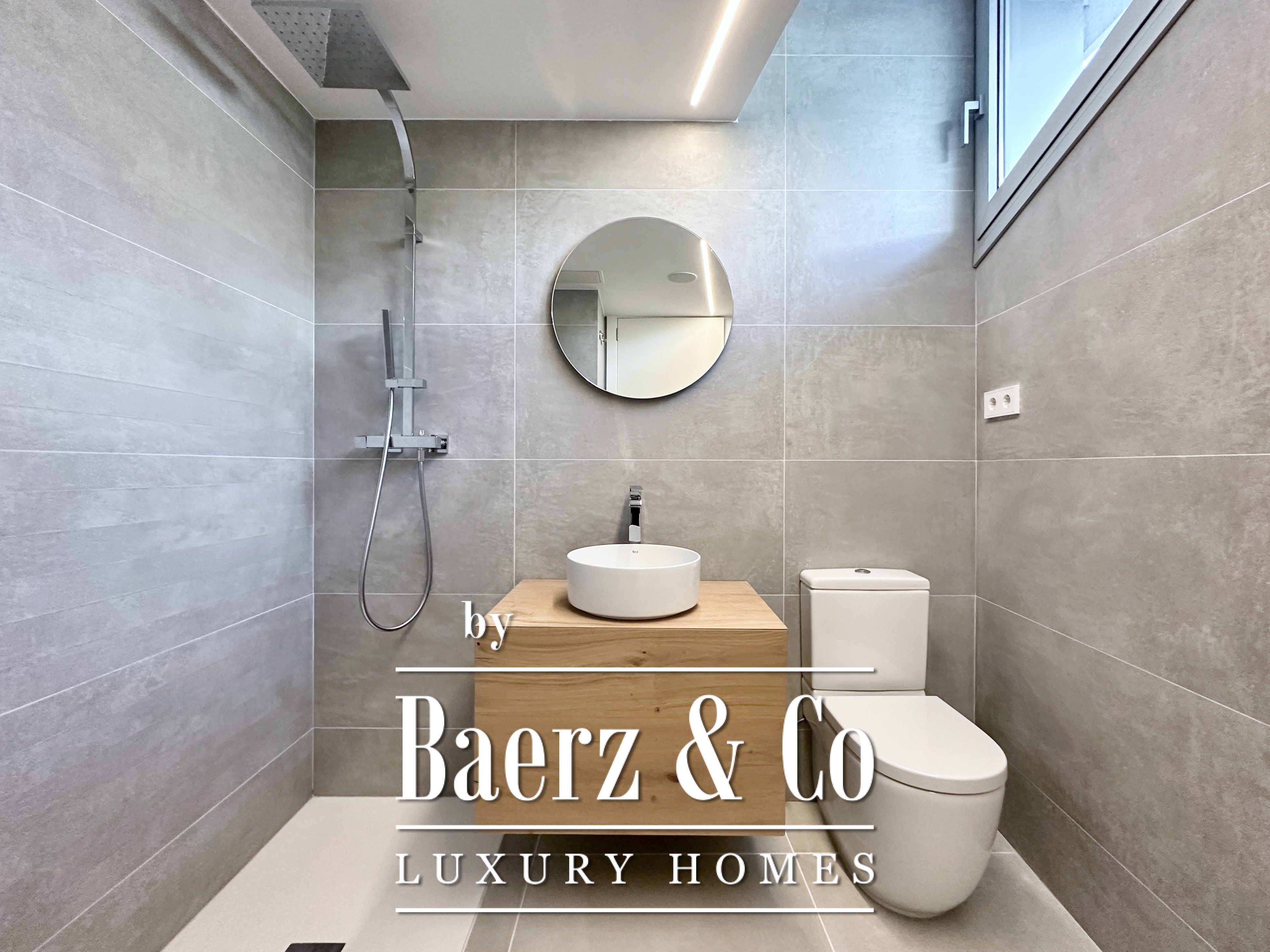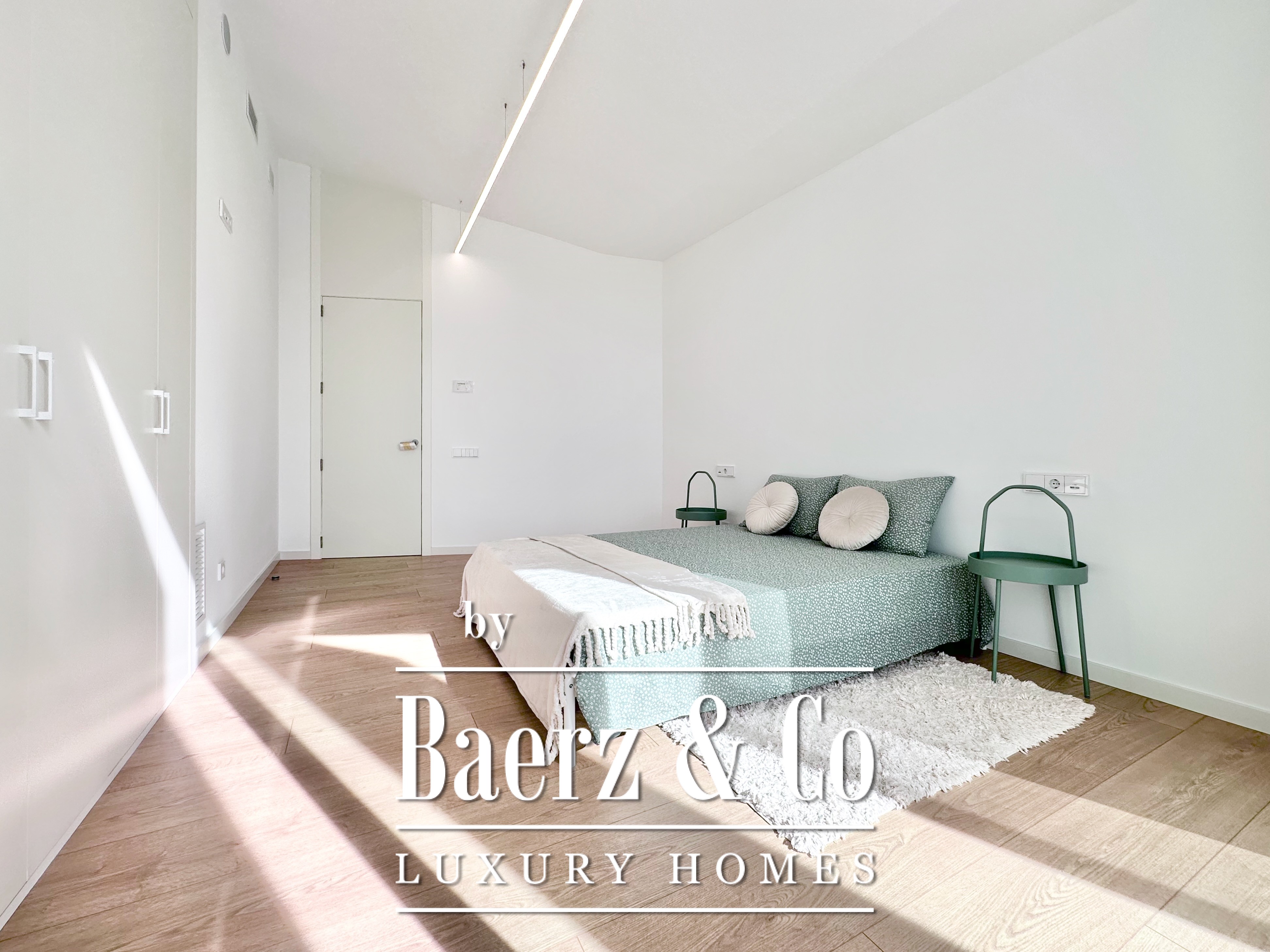 Ascending above the living space, a suspended walkway leads to three double bedrooms, two with private bathrooms. Each room connects to a terrace filtered by metal latticework, balancing openness with privacy. This contemporary villa for sale in Sitges merges architectural precision with an elevated coastal experience.