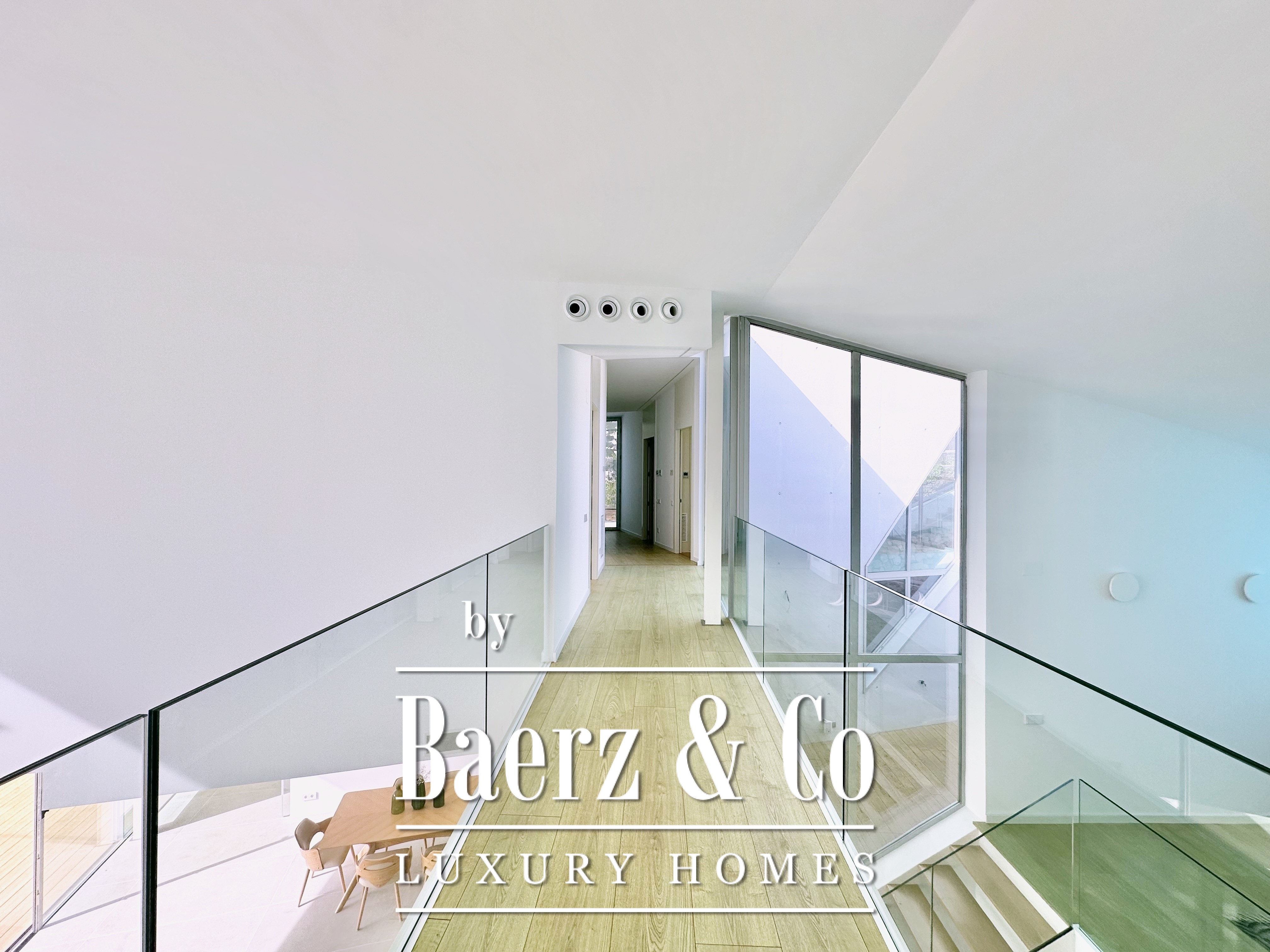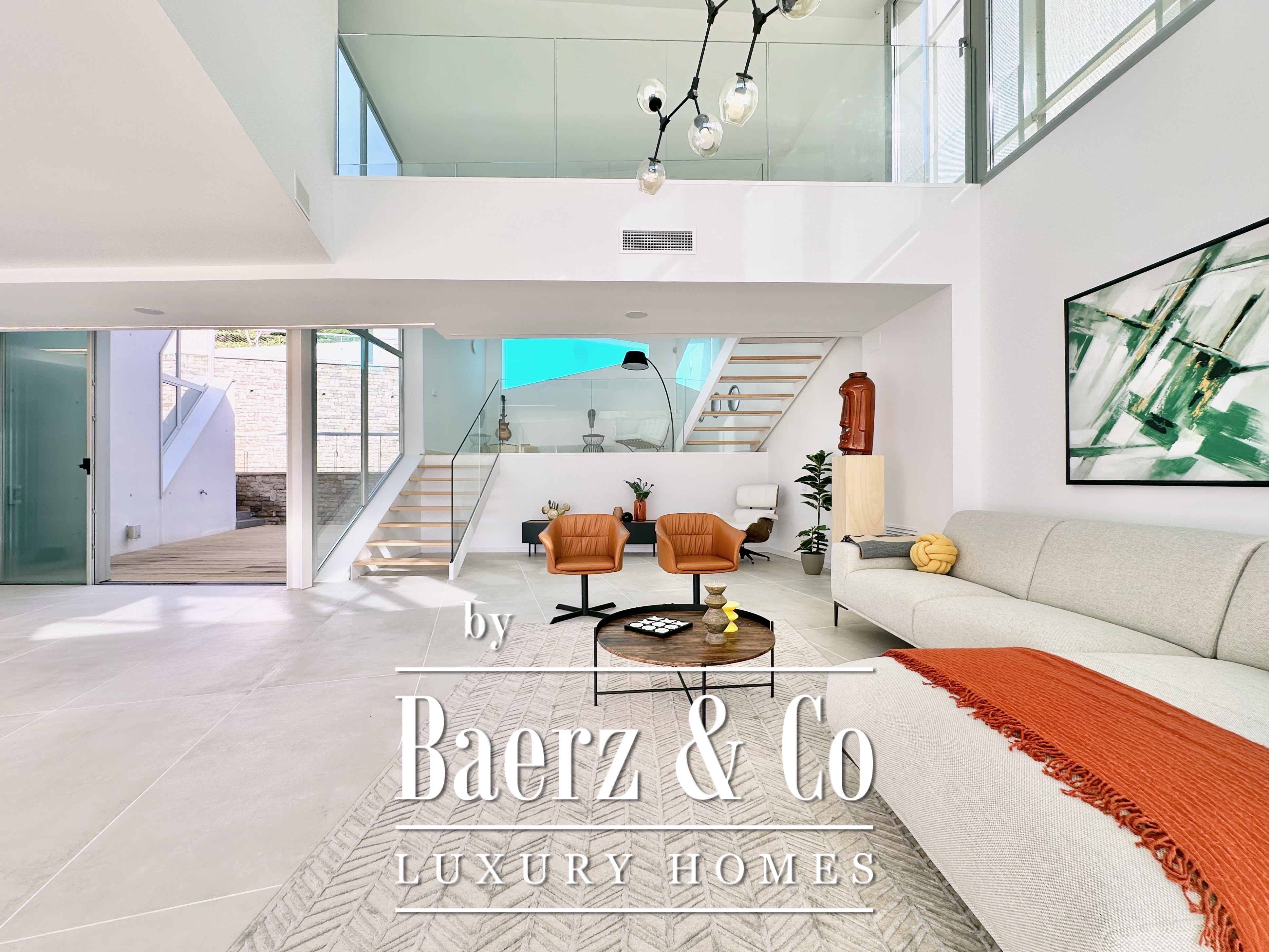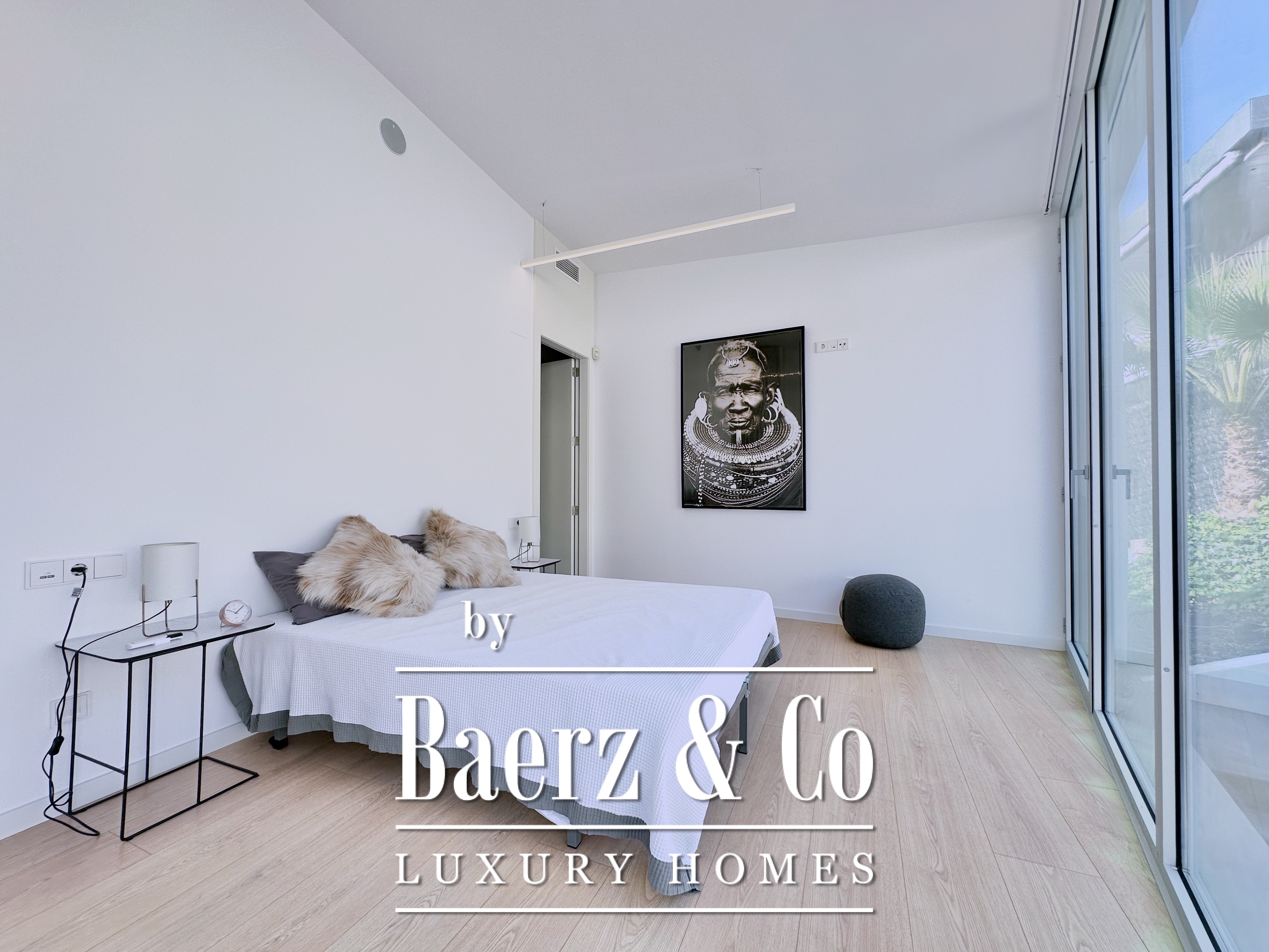 The home spans two principal levels above a versatile basement, connected by a private lift. On the lower ground, a garage accommodates four vehicles, complemented by a wine cellar, storage, laundry, and technical rooms. The main floor, anchored by an 80 m² living-dining area beneath double-height ceilings, is framed by floor-to-ceiling glazing, offering generous natural light and direct access to a covered sea-facing terrace. The kitchen is finished with contemporary white cabinetry, a central island, and integrated Siemens appliances, adaptable via a sliding glass partition. A guest suite with en-suite bathroom and a guest toilet complete this level.