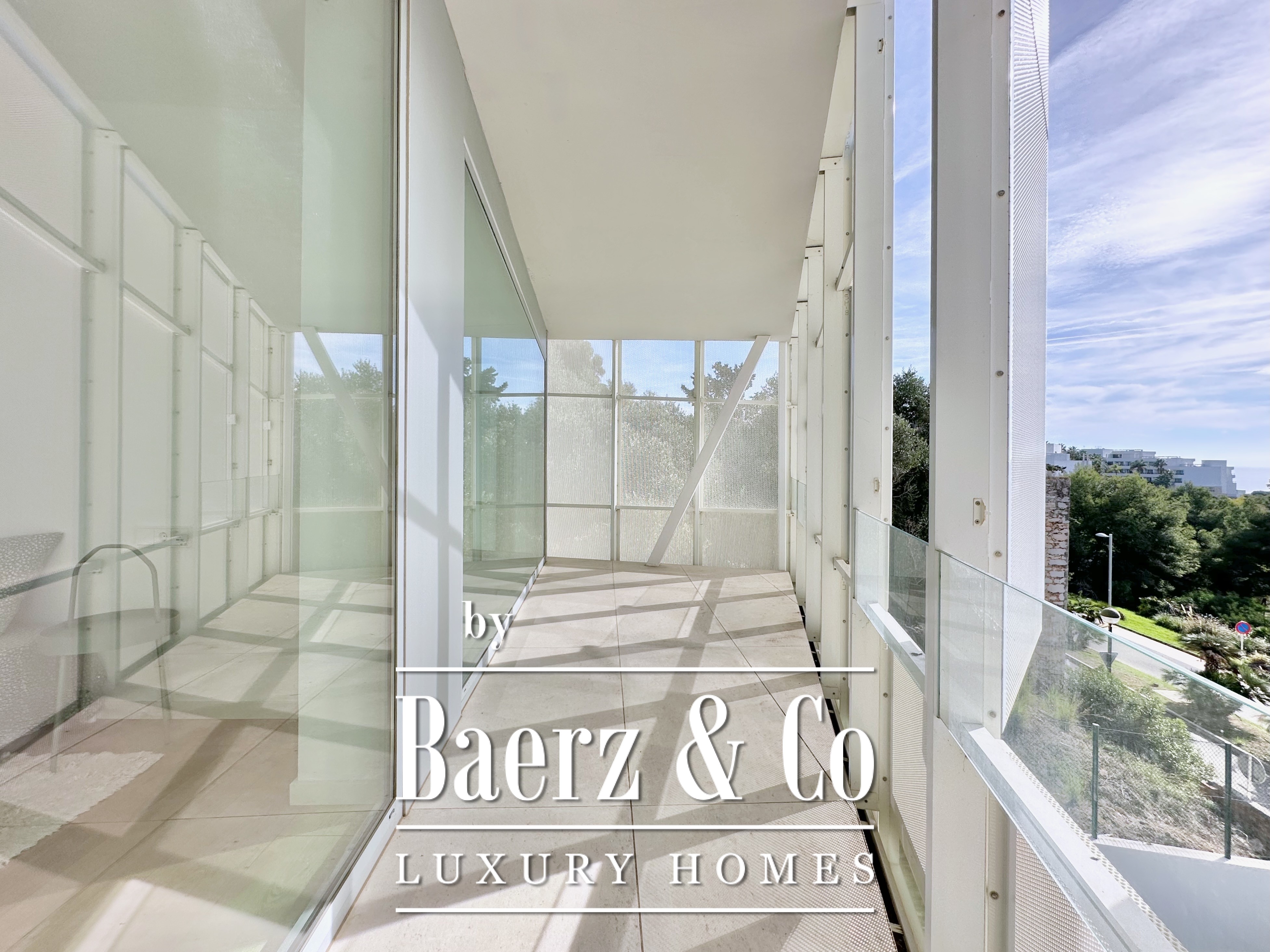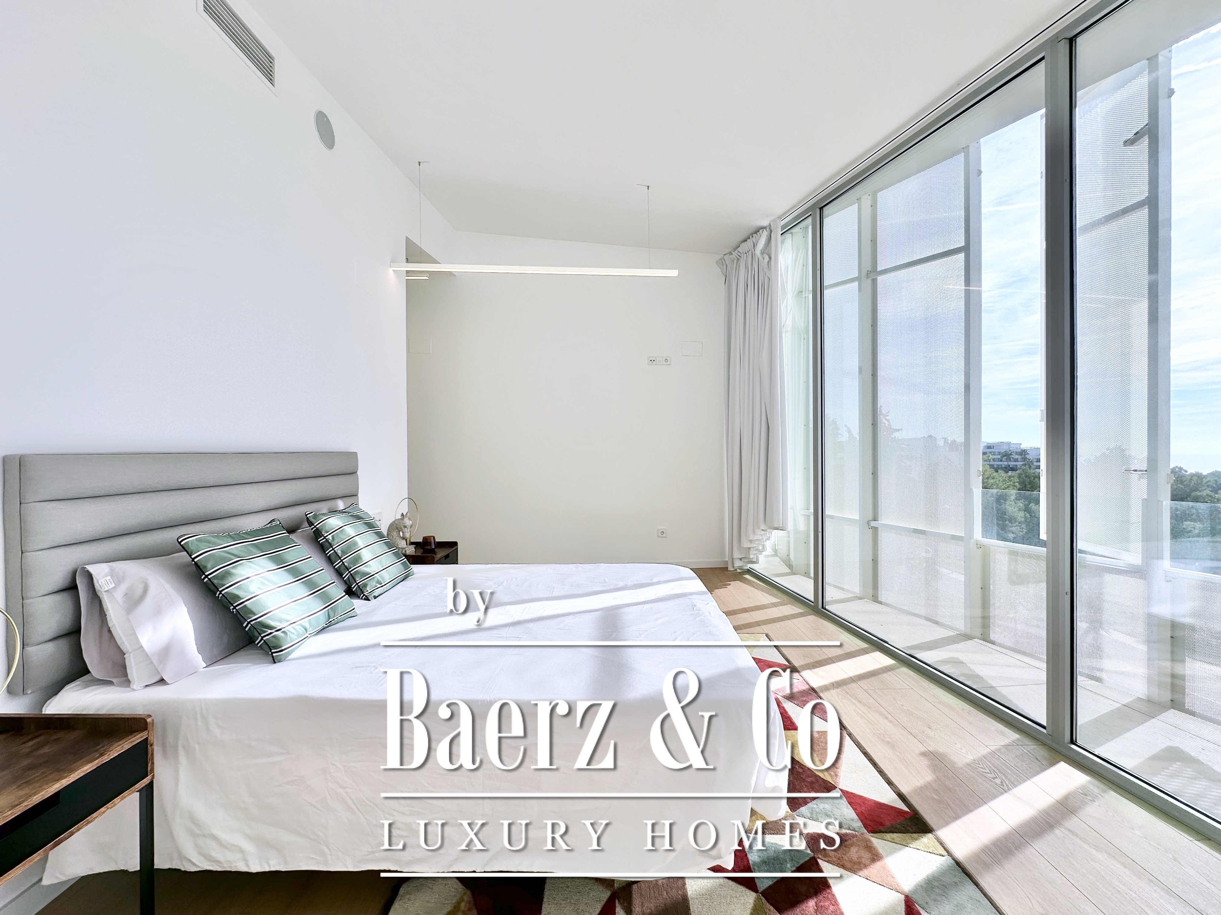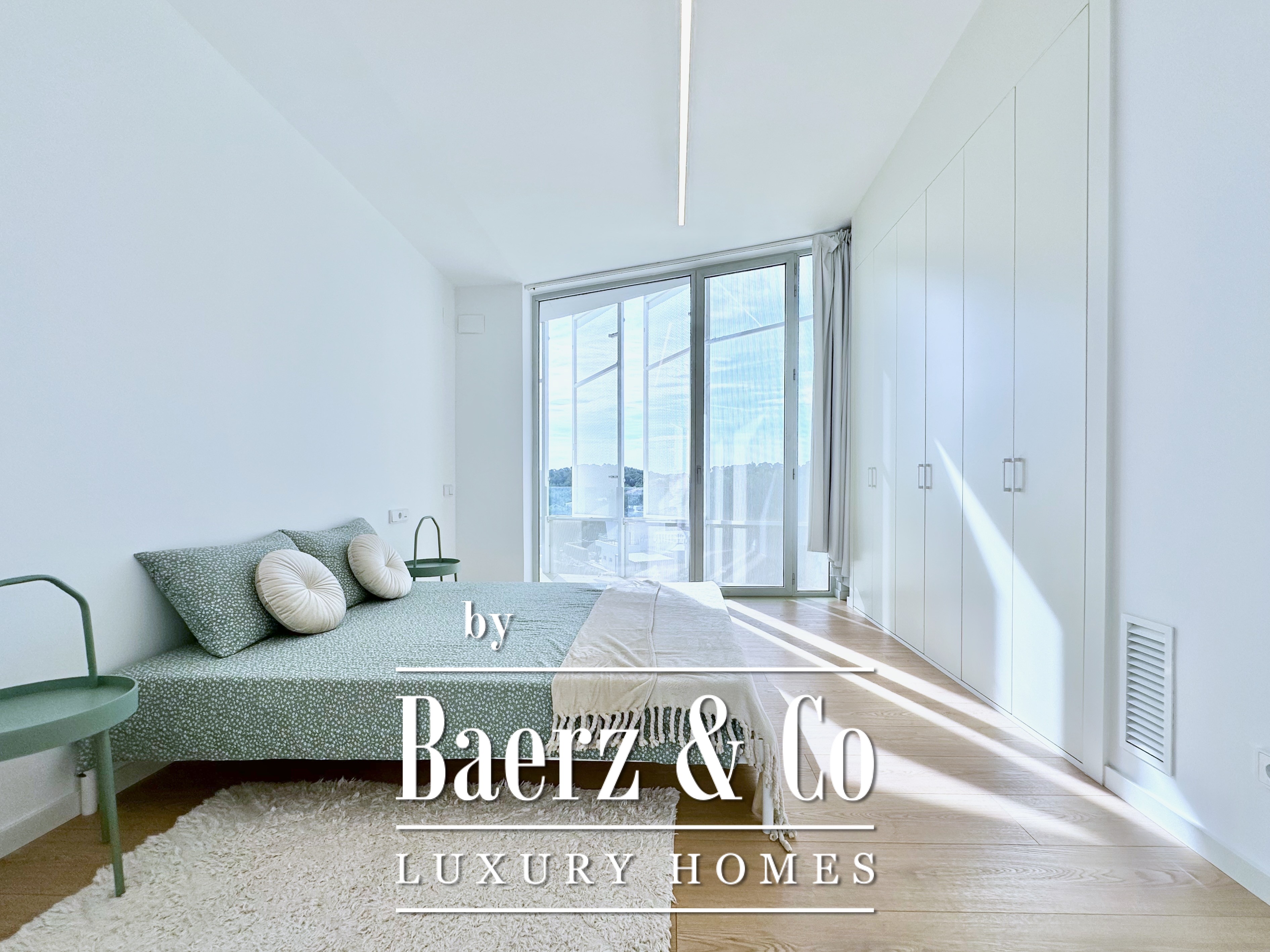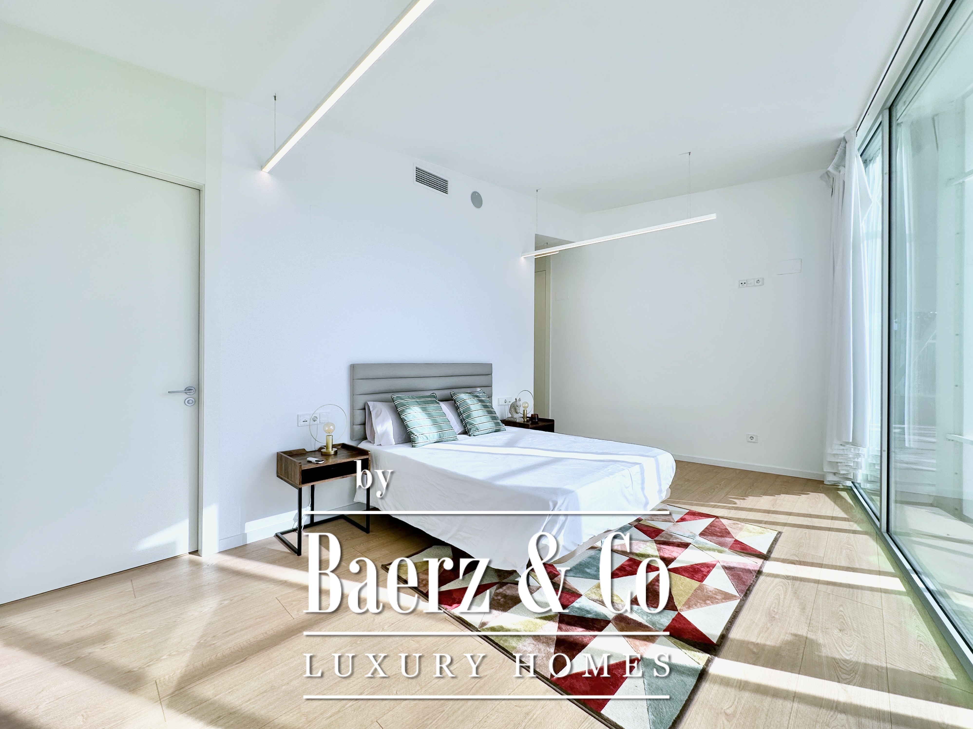 The home spans two principal levels above a versatile basement, connected by a private lift. On the lower ground, a garage accommodates four vehicles, complemented by a wine cellar, storage, laundry, and technical rooms. The main floor, anchored by an 80 m² living-dining area beneath double-height ceilings, is framed by floor-to-ceiling glazing, offering generous natural light and direct access to a covered sea-facing terrace. The kitchen is finished with contemporary white cabinetry, a central island, and integrated Siemens appliances, adaptable via a sliding glass partition. A guest suite with en-suite bathroom and a guest toilet complete this level.