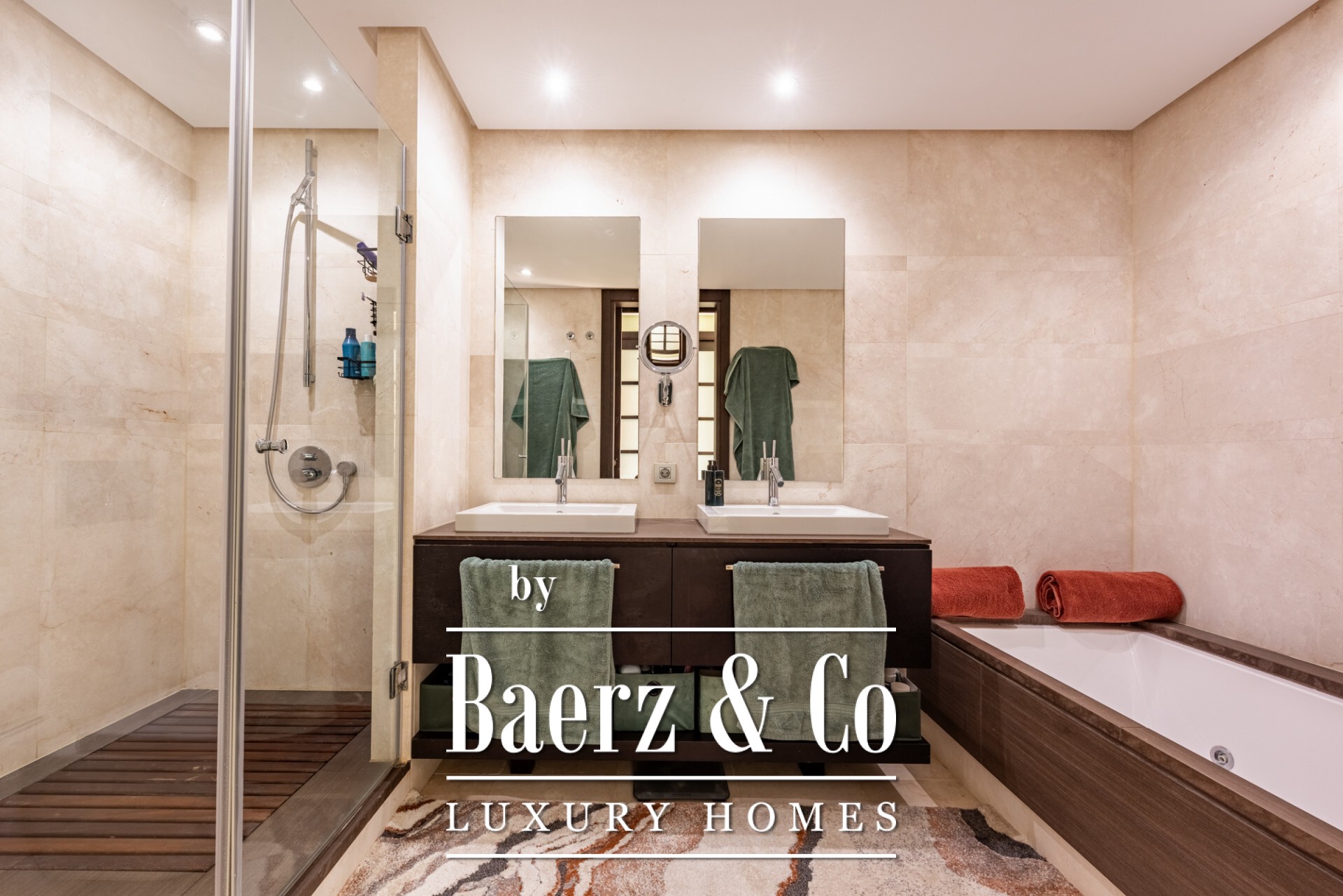 Throughout, marble floors and underfloor heating provide year-round comfort, complemented by air conditioning and double glazing. The main living areas open to south-facing terraces totaling 170 m², drawing in natural light and offering tranquil panoramic views over landscaped communal gardens.