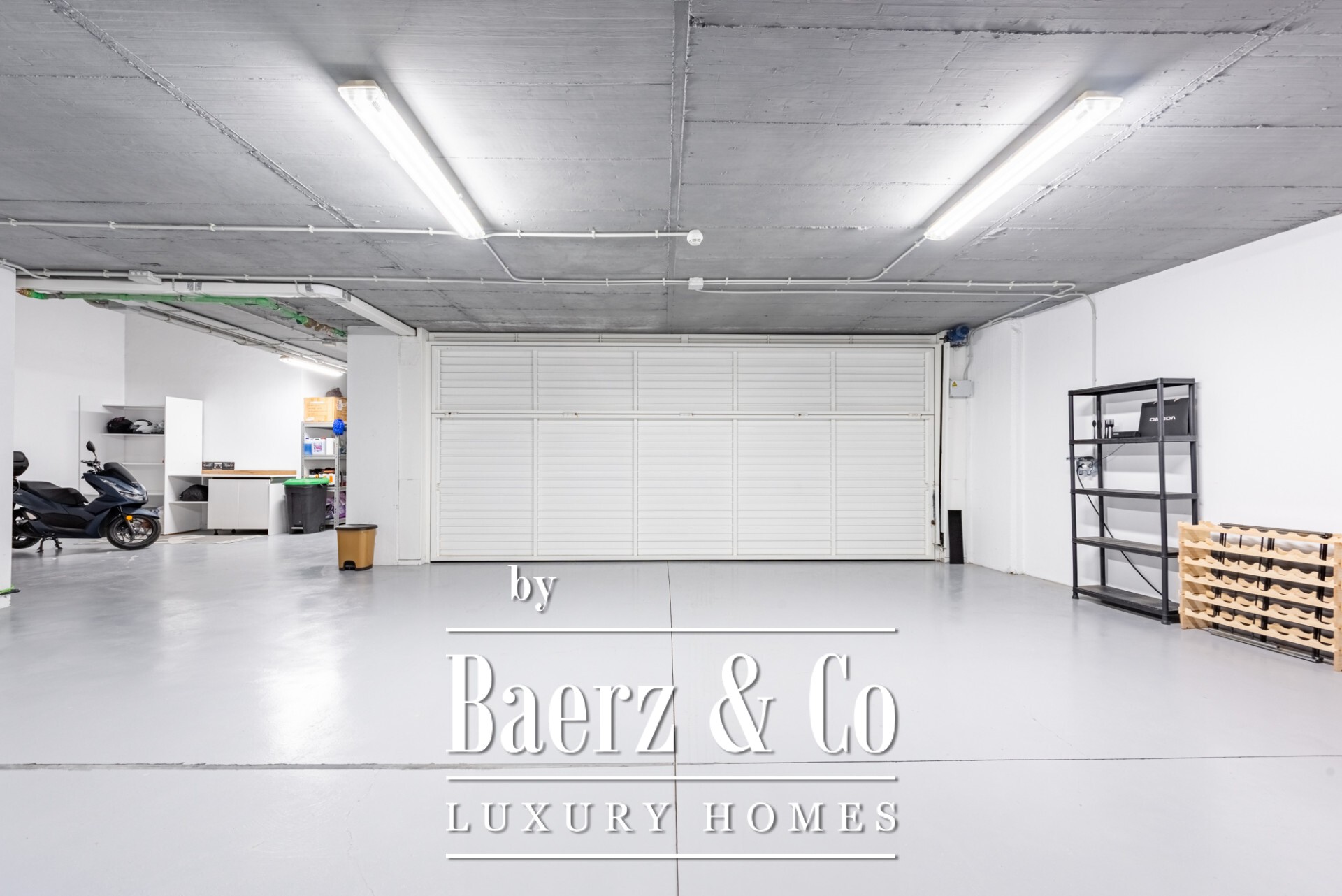 Spanning 548 m² across multiple levels connected by a private lift, this penthouse offers three bedrooms—two arranged as suites on the main and upper floors, and a particularly private en-suite room with direct lower-level access, generous storage, and a large private garage suitable for guests or staff.