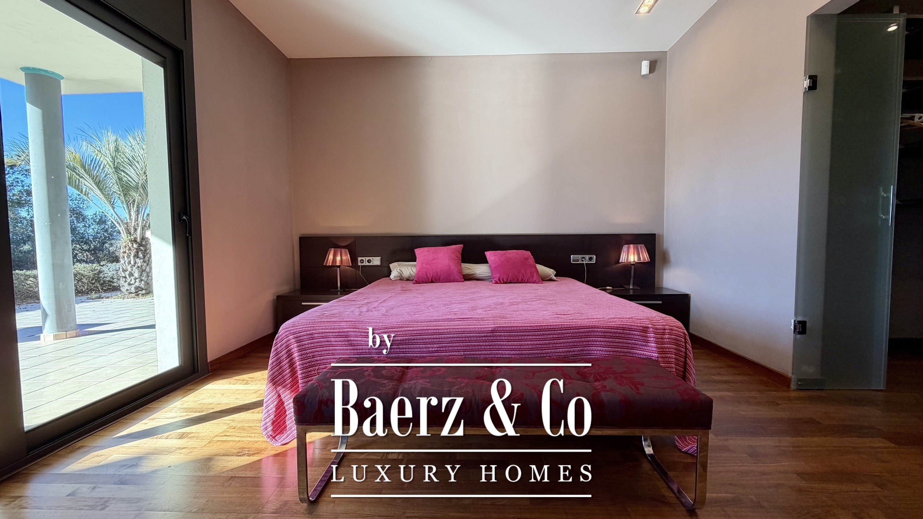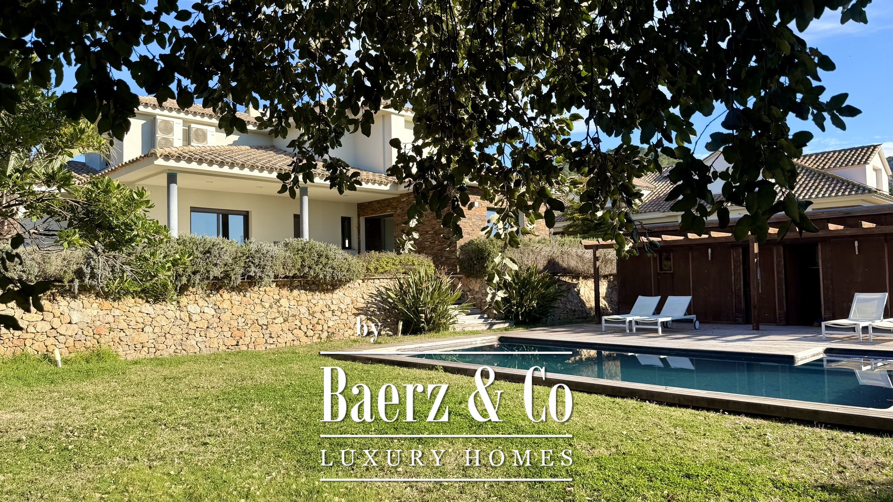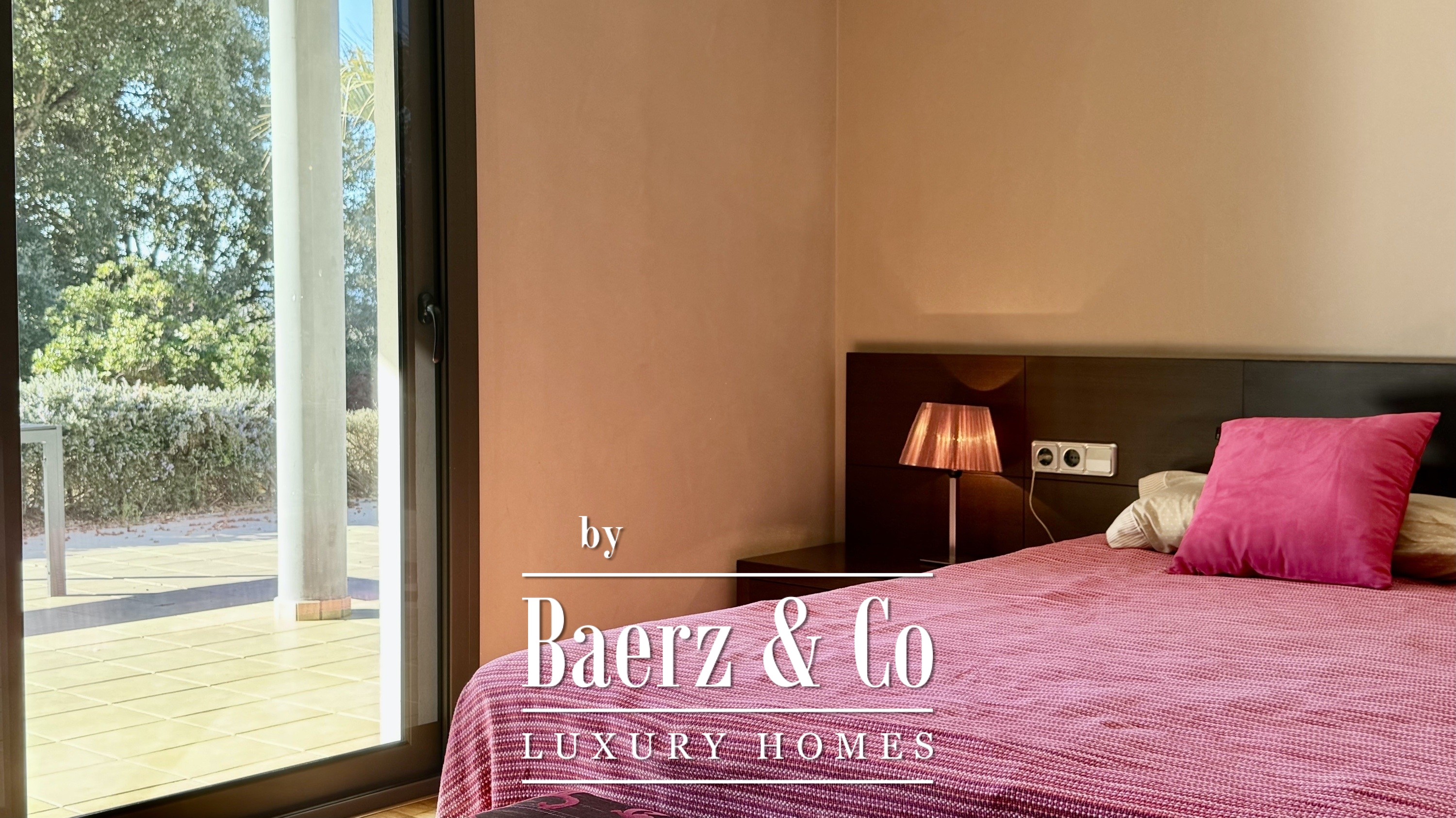 Upstairs, three further bedrooms—two en suite—and an additional bathroom ensure privacy for family and guests. Every room benefits from light, openness and tranquil views, with sea and country outlooks present throughout. Outdoor life centres on the landscaped Mediterranean garden and private pool, framed by terraces and a pavilion with changing facilities.