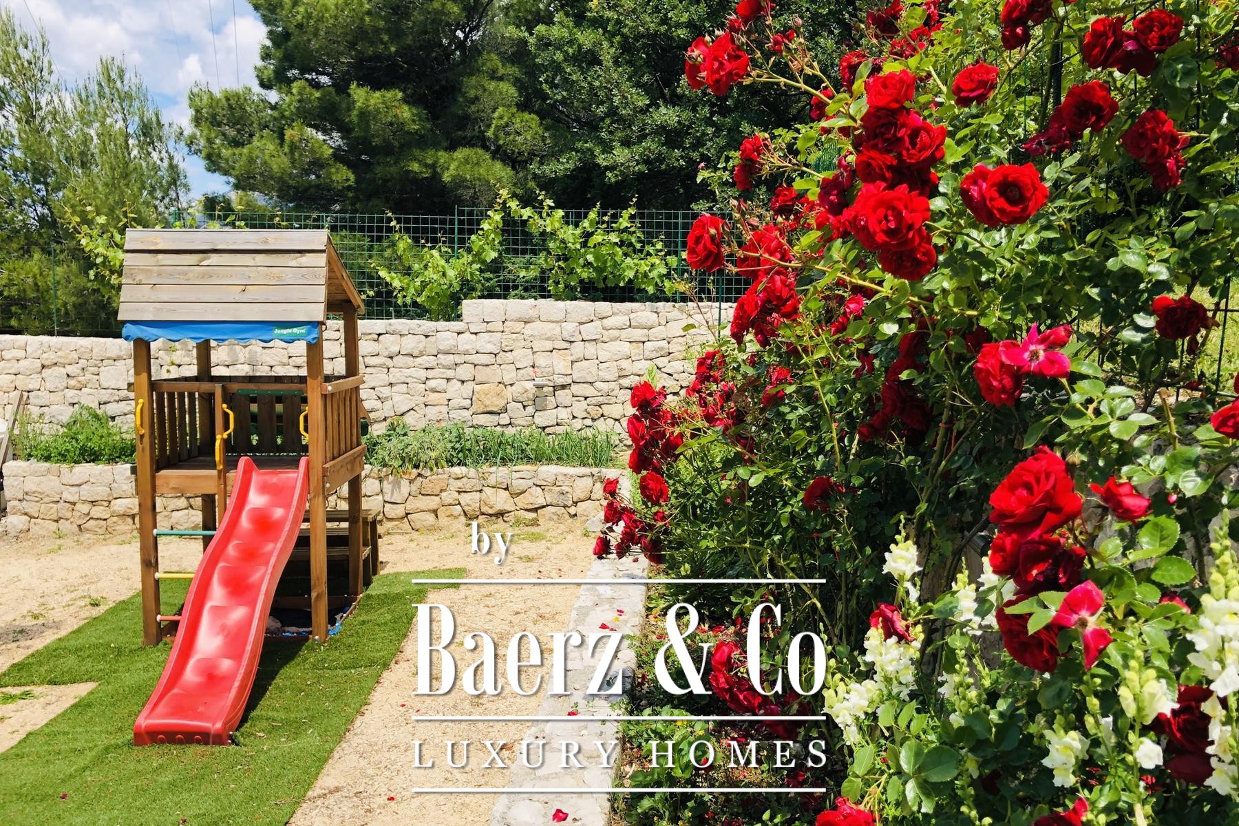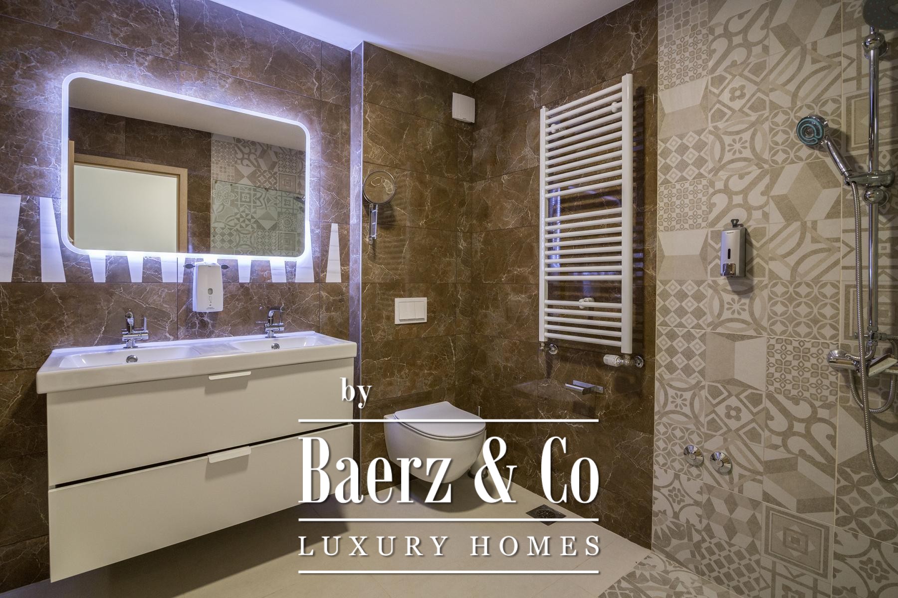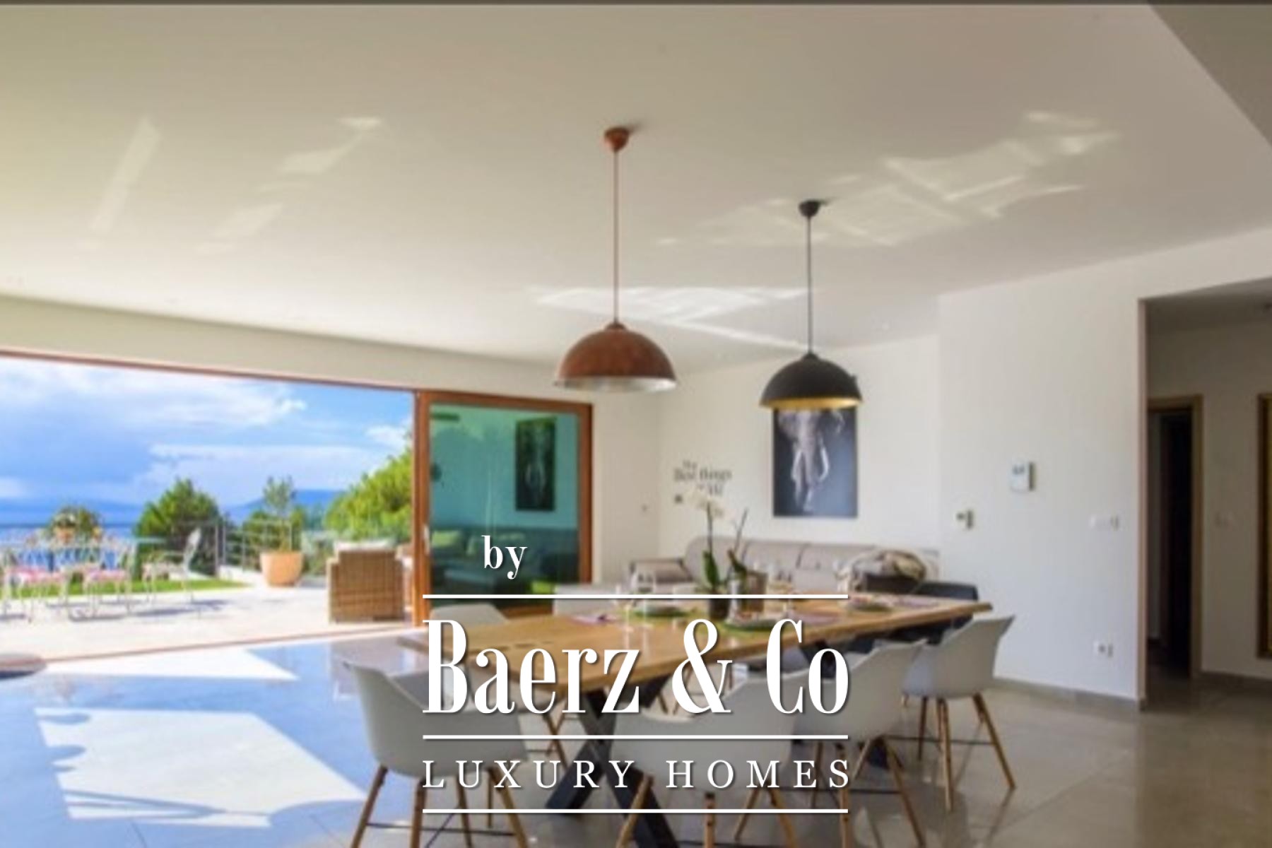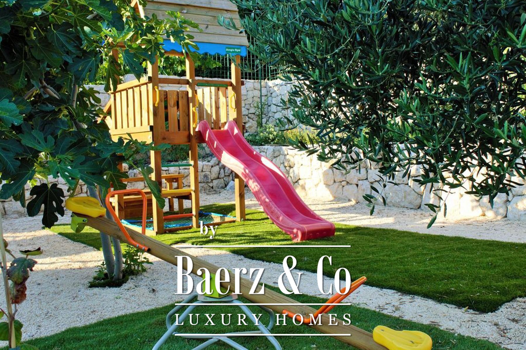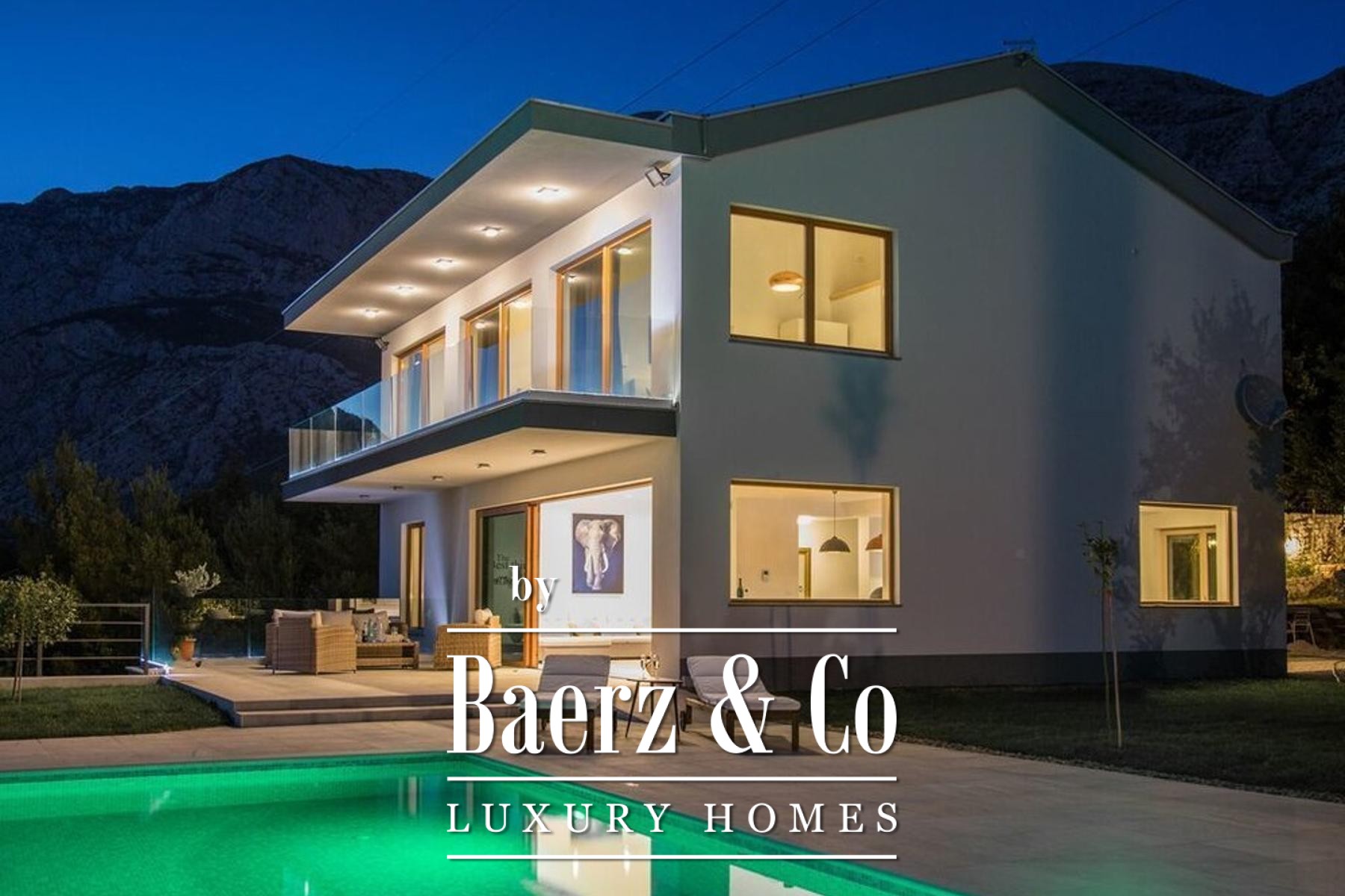 Makarska, Tučepi - modern villa with infinity pool, outdoor jacuzzi and panoramic views of the sea and islands.Situated on the slopes of Mount Biokovo, this property offers its owners complete tranquility, with unobstructed views of the sea and the islands of Brač and Hvar. Although fully immersed in nature and providing maximum privacy, it is only a 5 to 10-minute drive from all essential amenities (shops, restaurants, beaches, etc.).The cultivated estate covers a plot of 1,100 m² and features facilities such as a heated illuminated swimming pool (57 m²), a terrace with garden furniture and jacuzzi, sunbathing area, lawn, small outdoor gym, terrace with table tennis, barbecue, and children’s playground.The villa extends over three floors. The ground floor consists of an entrance hall, guest toilet, one bedroom with an en-suite bathroom, a kitchen with dining area, and a spacious living room. An internal staircase leads to the first floor, where three bedrooms are located. Each bedroom has a bathroom with double sinks and access to a covered terrace.The garage accommodates two cars, while the outdoor parking area provides