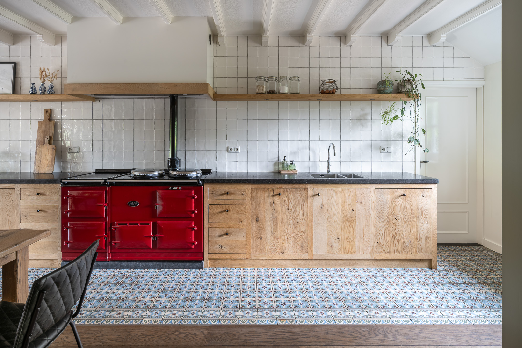 Inside, the residence offers an intelligent layout that supports both luxurious family living and single-level living for long-term convenience. The ground floor alone features a spacious living room with a central wood-burning stove, a refined country kitchen with Aga stove and coffee station, and the primary suite with walk-in closet and a modern bathroom.