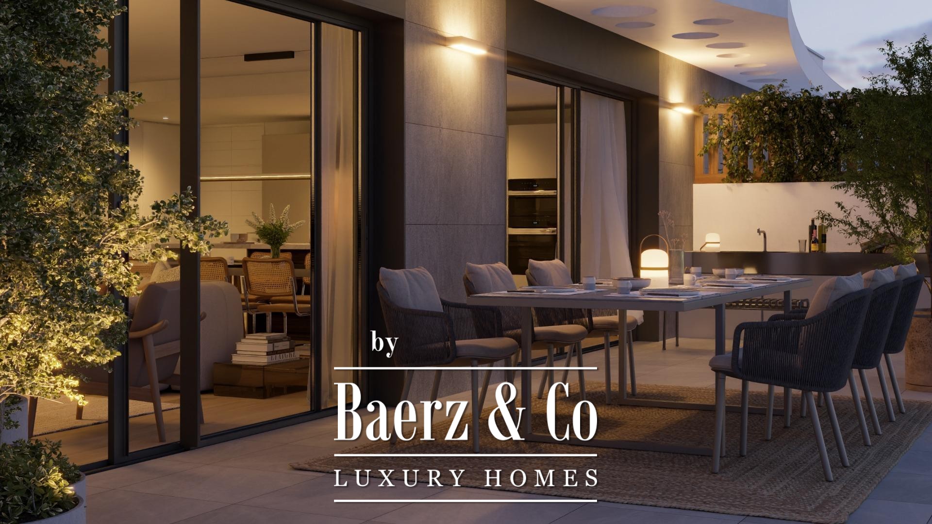 Three bedrooms and two bathrooms are composed with refined materiality, from Porcelanosa coverings to the underfloor heating ensuring year-round comfort. The high-end Santos kitchen integrates appliances discreetly, complementing the consistent quality found throughout. Amenities include a private garage, storage, a gym, adult and children’s saltwater pools, and a social club, supported by a concierge. The BREEAM certification affirms the development’s commitment to sustainability and construction excellence.