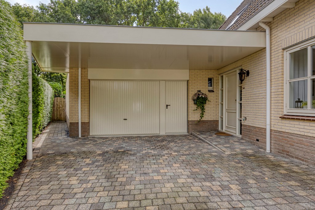 The garden all around is immaculately maintained. At the front, the wide driveway offers parking for multiple cars; under the carport your car is sheltered. From here you also have direct access to the garage, with overhead door and side door—a particularly spacious and multifunctional area of no less than 57 m². Ideal for daily use, safely storing bicycles, carrying out DIY projects, or setting up a large work or hobby room with its own entrance. The rear garden is a delight: a large sun terrace with decorative paving, manicured lawn, a pond, and borders full of color and variety. Thanks to mature hedges, trees, and the woodland to the rear, you’ll enjoy peace and privacy. Whether you want to have breakfast outdoors, read under the tree, or host guests on a summer evening—you can do it all here. With direct access from the living room, utility room, and garage, the garden is also extremely practical in layout.
