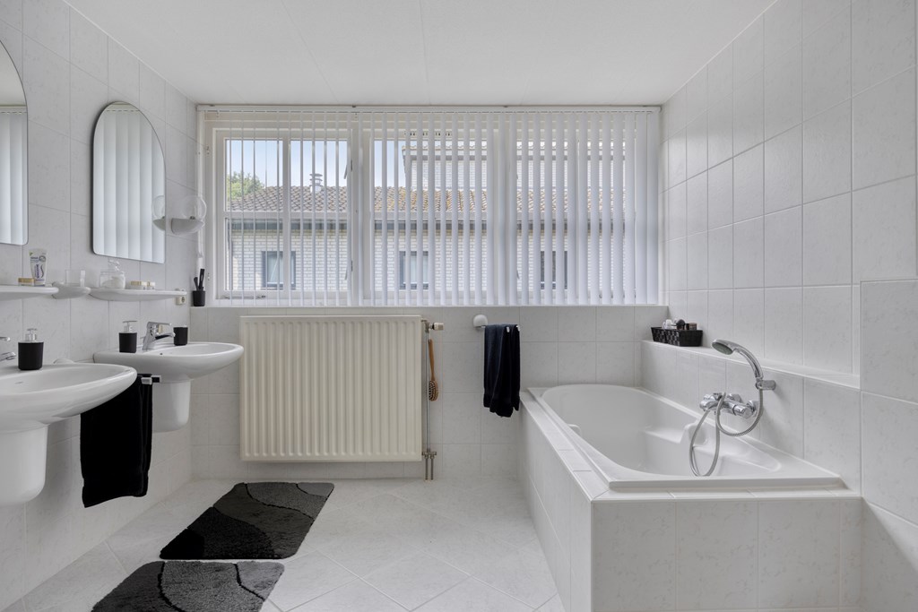 The landing on the first floor is surprisingly spacious and provides access to two comfortable bedrooms. The front bedroom is extra large with a view over the quiet street. At the rear is another full-size bedroom with a built-in wall wardrobe. The bathroom is fresh and functional, fitted with a bathtub, separate shower, double washbasin, second toilet, and a large window for abundant daylight.