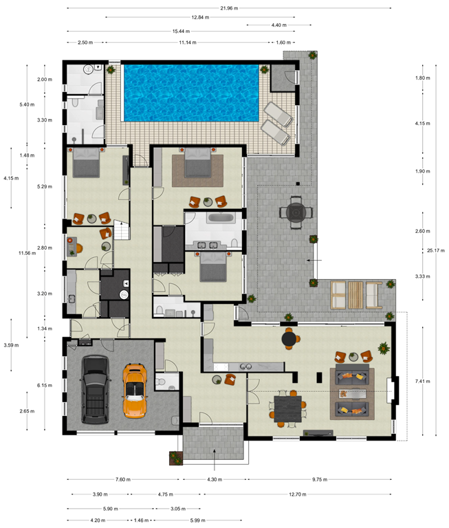 Enjoy a year-round holiday feeling: start the day with a swim and keep going endlessly against the Bosch jet stream. Sliding doors in every bedroom and the pool open directly to the garden and the partially covered terrace—seamlessly blending indoors and outdoors.