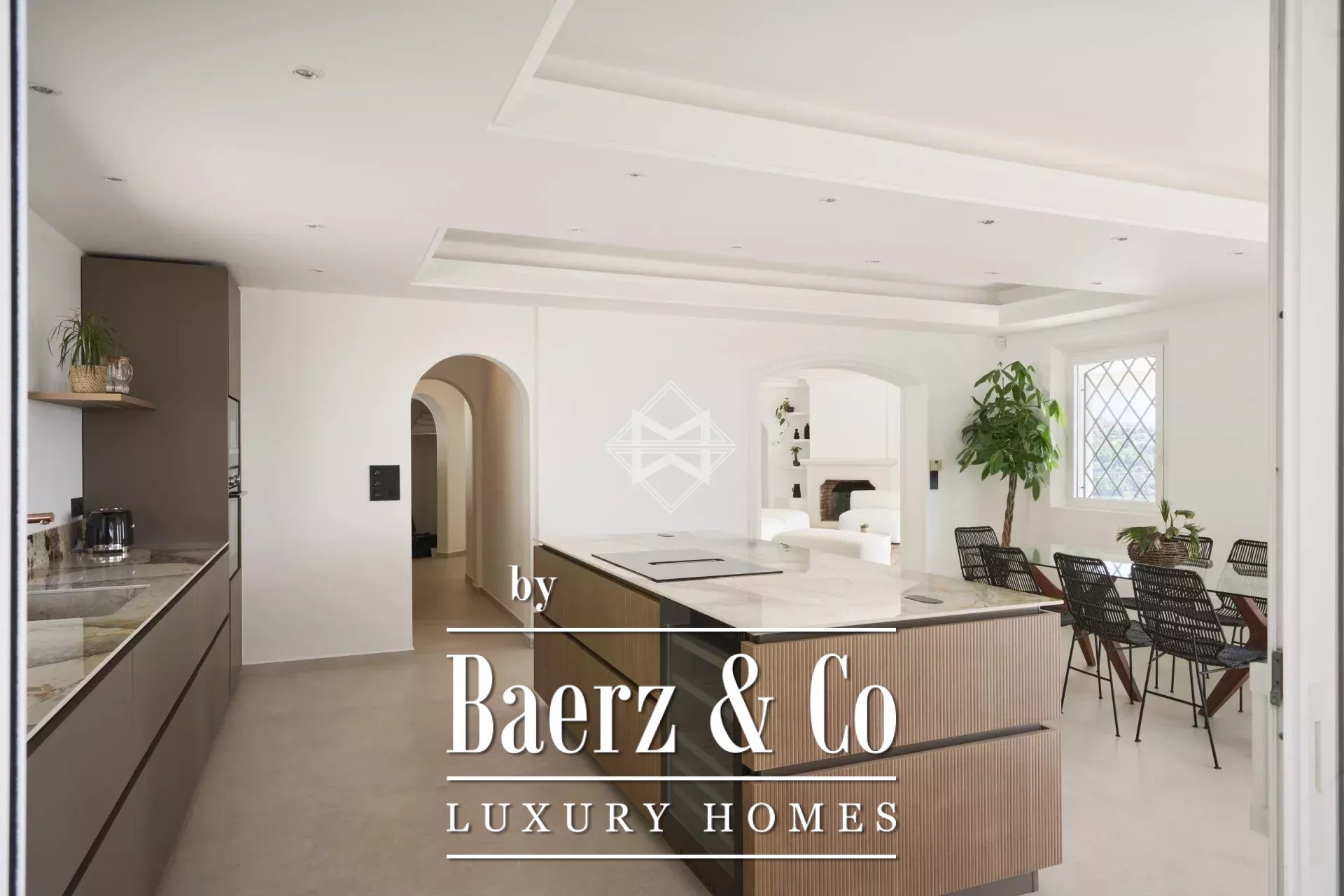Located in one of the most sought-after areas of Vence, in a commanding position, L'Hacienda stands on a preserved hillside and offers an exceptional panorama: the Mediterranean stretching as far as the eye can see, from Cap Ferrat to Cap d'Antibes, with the majestic Baou de Saint-Jeannet as a backdrop. Completely renovated in 2025 with elegance and refinement, the 260 m² villa, bathed in light, is spread over three levels. On the ground floor, a beautiful entrance hall leads to a large living room opening onto a terrace facing the sea, extended by a dining room and a spacious kitchen. Two bedrooms, a bathroom, a cloakroom, a laundry room, and a guest