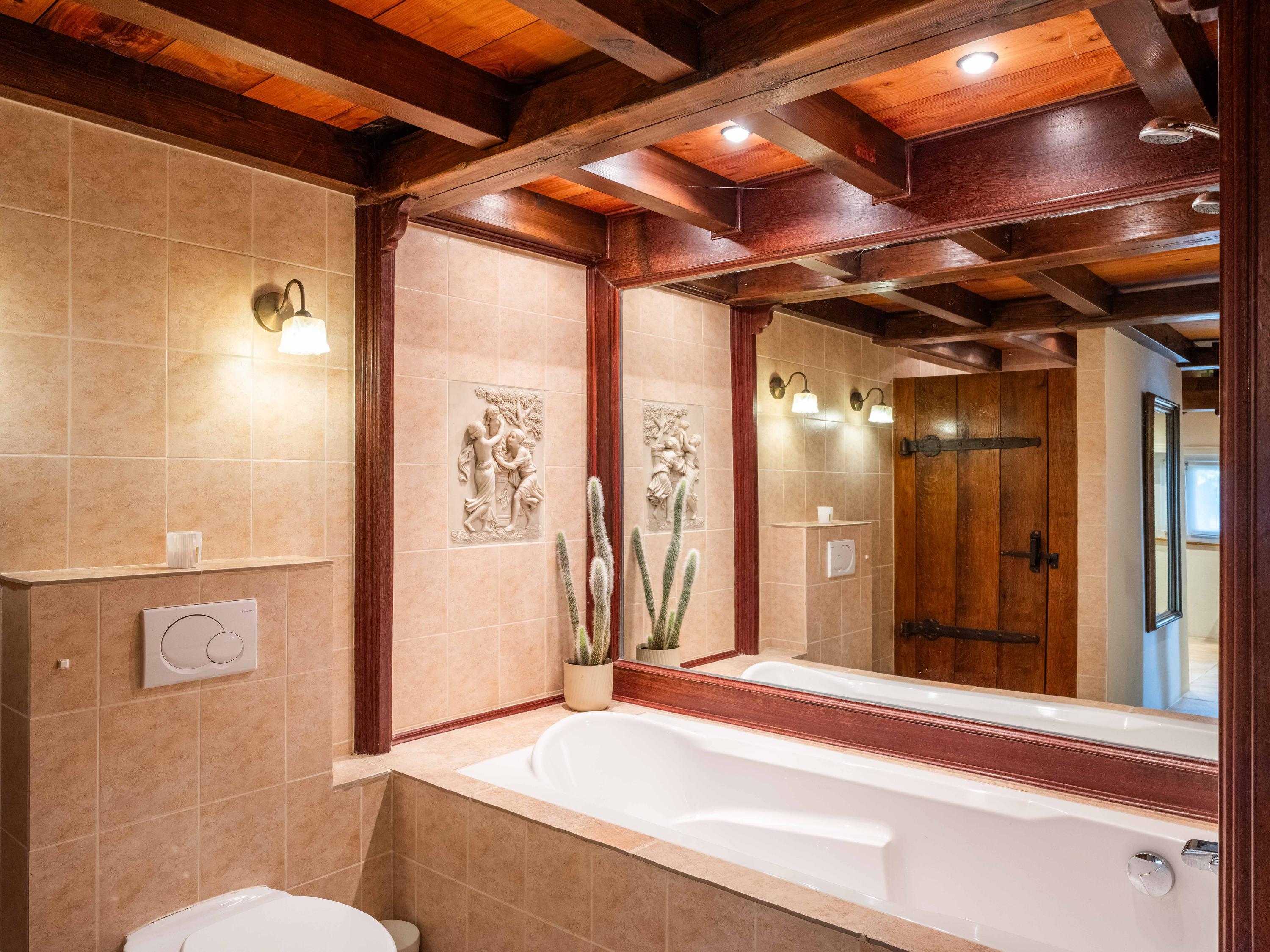In the beautifully landscaped garden, you will find a fully equipped guesthouse with its own wood stove, open kitchen with complete appliances, washer and dryer, dining area, and radiators. The bedroom includes a private shower, and there is also a separate toilet with washbasin. A attic above provides additional storage space.
