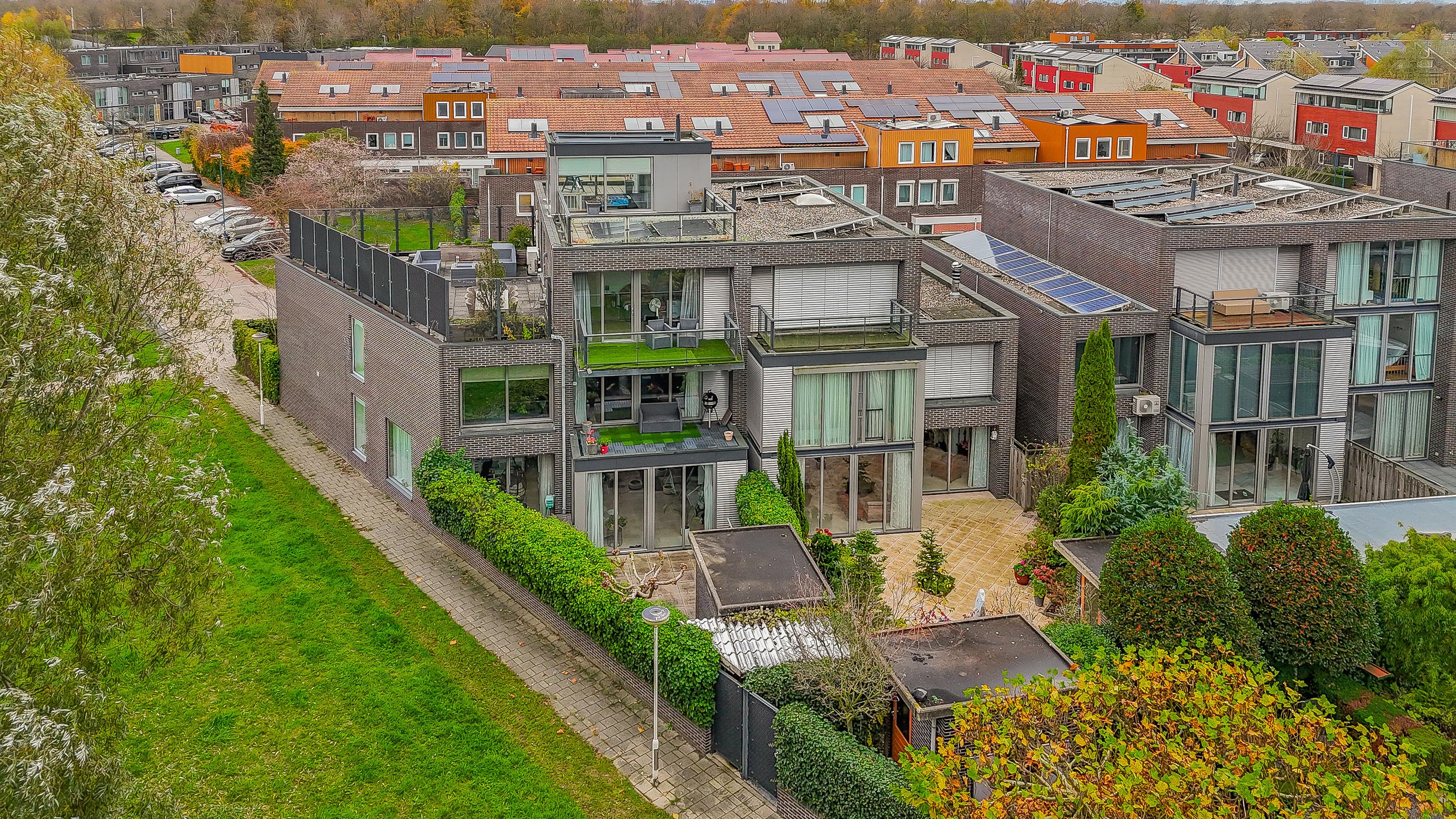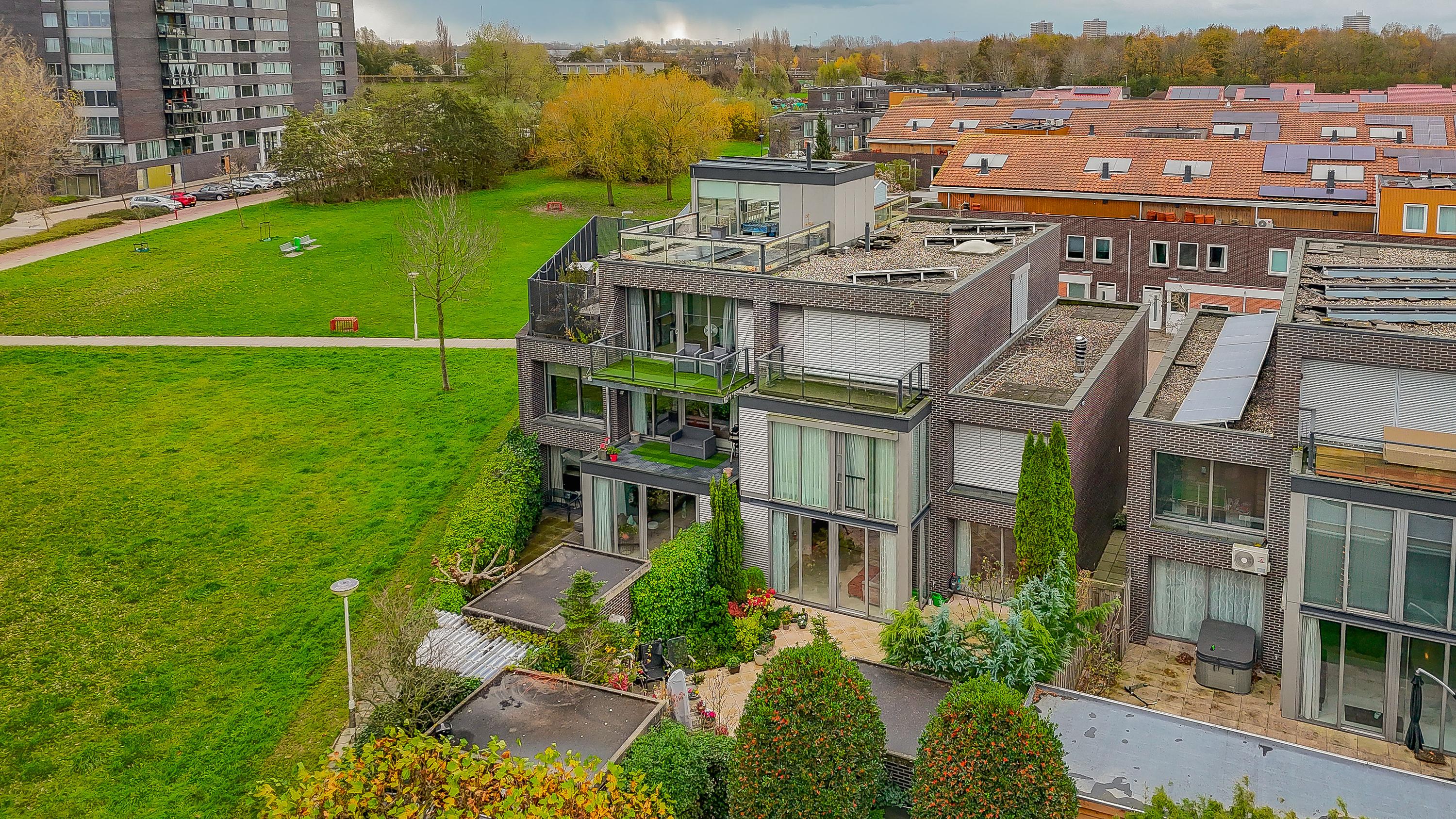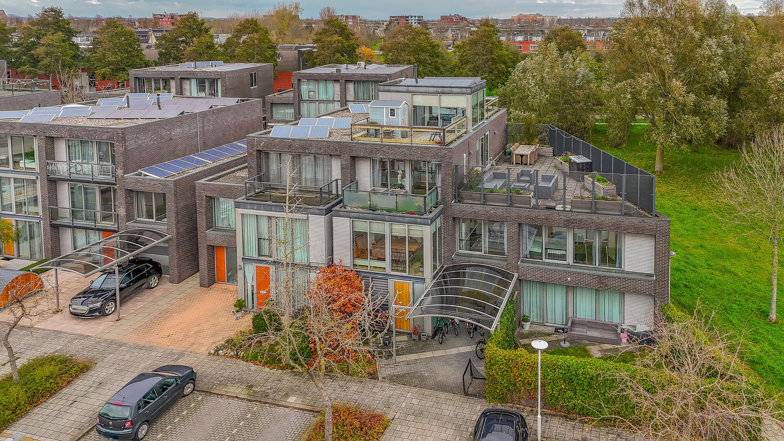 The outdoor space is just as impressive: a total of 168 m2 of outdoor area divided over a spacious front garden, back garden, 3 balconies and 3 roof terraces. This means you always have a spot in the sun as well as privacy. There is parking space on private property under the carport and there is even a private charging station available. The location in a green, quiet neighbourhood of Zoetermeer completes the living comfort. From the living room you have an unobstructed view over a green strip and mature trees – a rare combination of space, privacy and nature within easy reach.