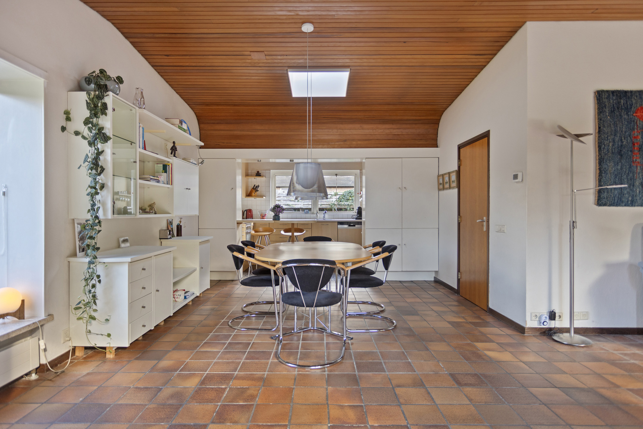 De royale woonkamer met grote raampartijen, schuifpui en open haard biedt een sfeervolle leefruimte met prachtig zicht op de tuin. Aansluitend de eetkamer en de halfopen keuken, uitgerust met onder andere een oven, vaatwasser, elektrische kookplaat en koelkast. De houten plafondafwerking zorgt voor een warme, karakteristieke uitstraling.
