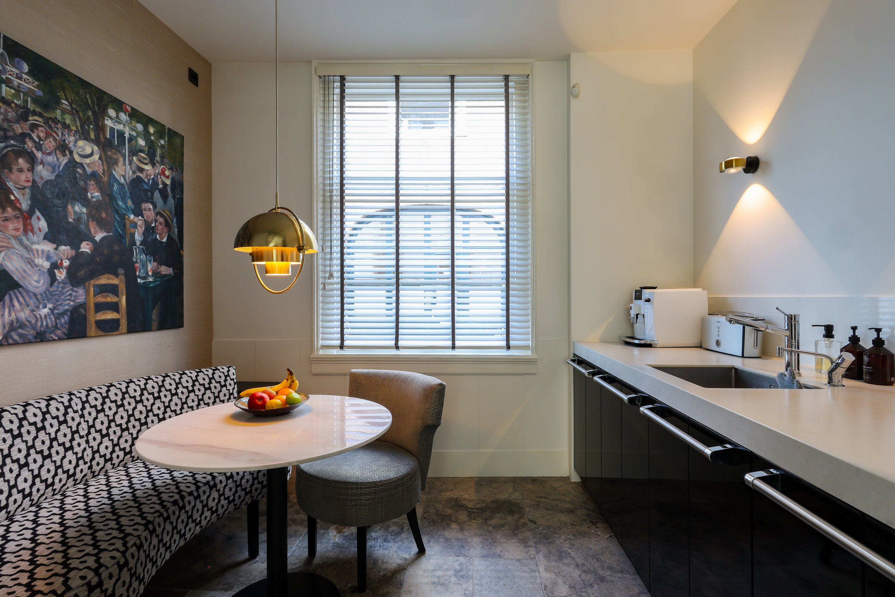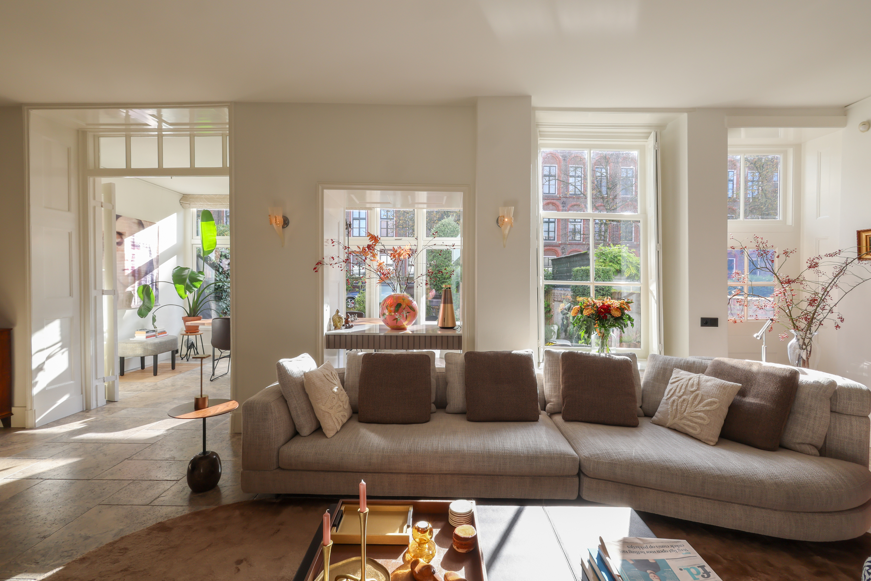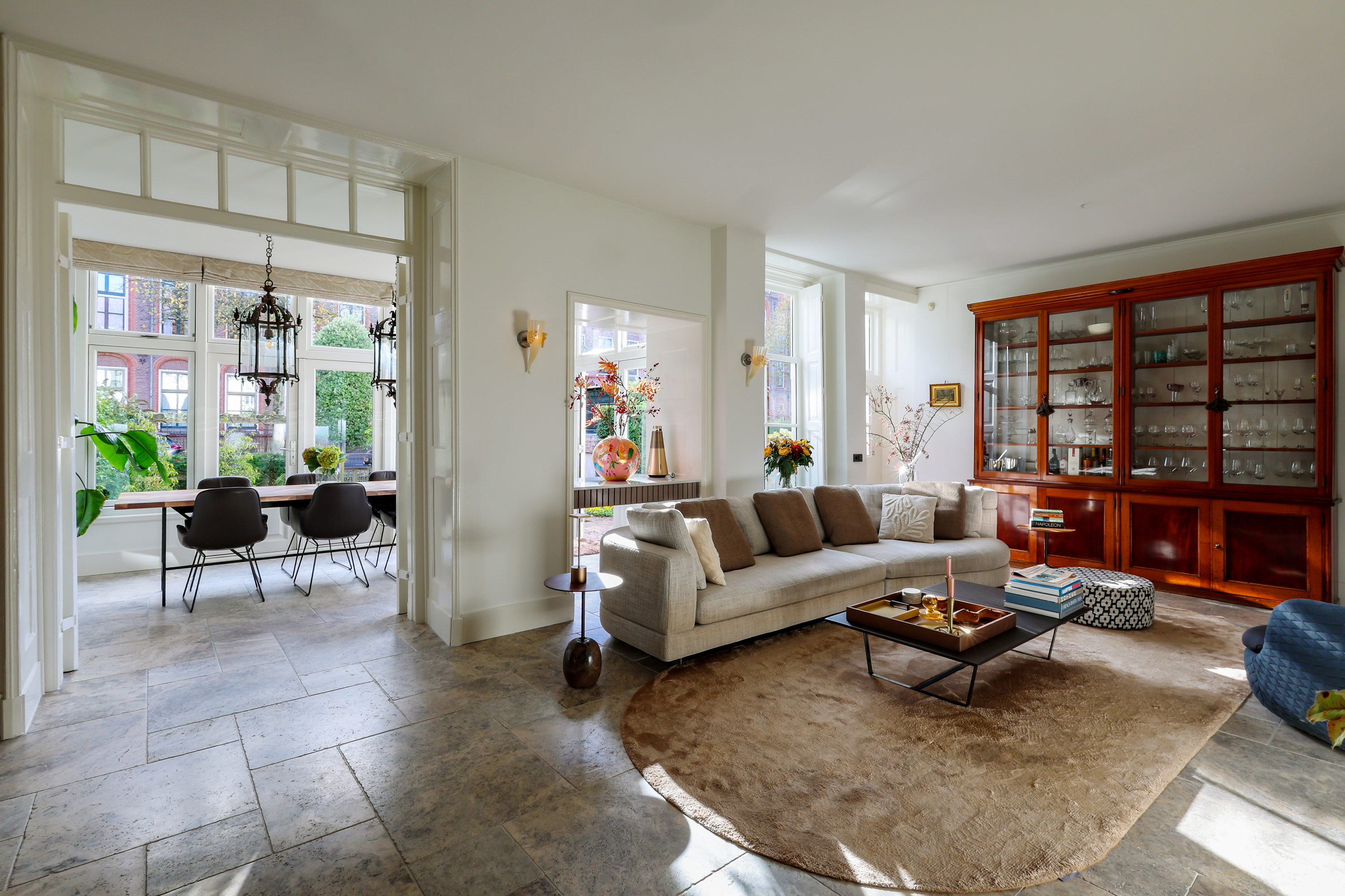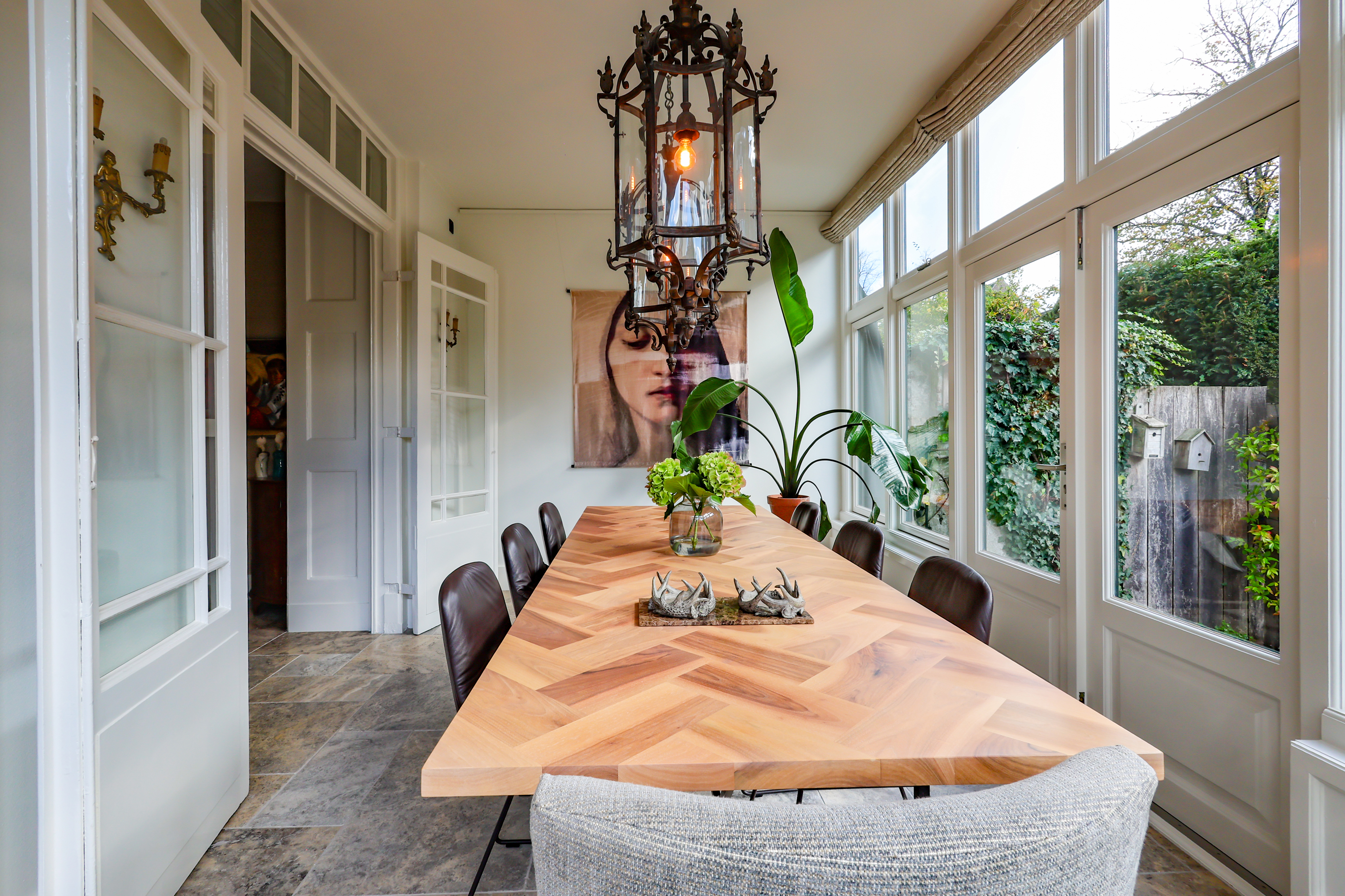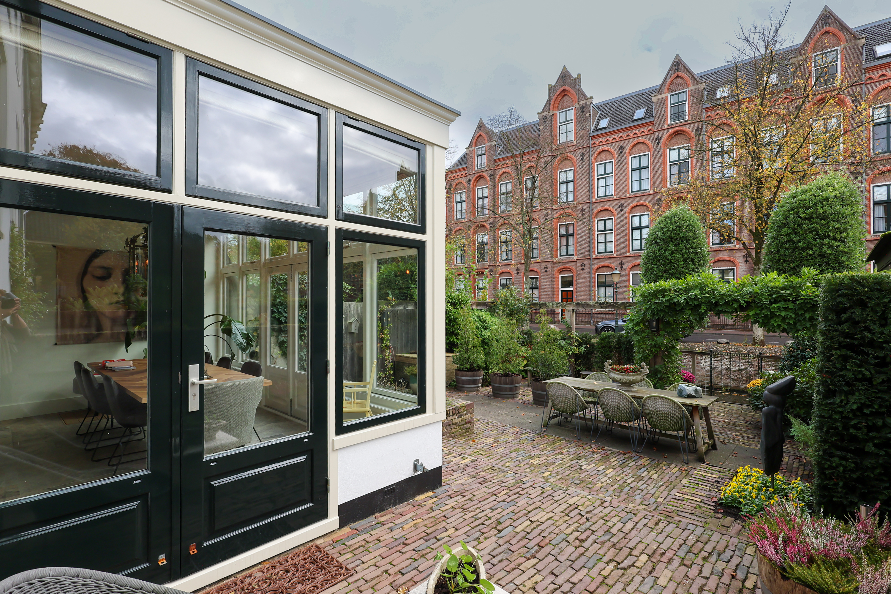 Al entrar, el ambiente destaca por su luminosidad, amplitud y detalles originales. La chimenea abierta y las ventanas tradicionales del salón enmarcan vistas a la ciudad, mientras que la cocina Lodder y el rincón de desayuno se orientan hacia la histórica avenida. Un espectacular invernadero conecta directamente con el jardín privado, donde una terraza se asoma sobre el canal Zuidsingel, generando un remanso de paz a pocos pasos del bullicio urbano.