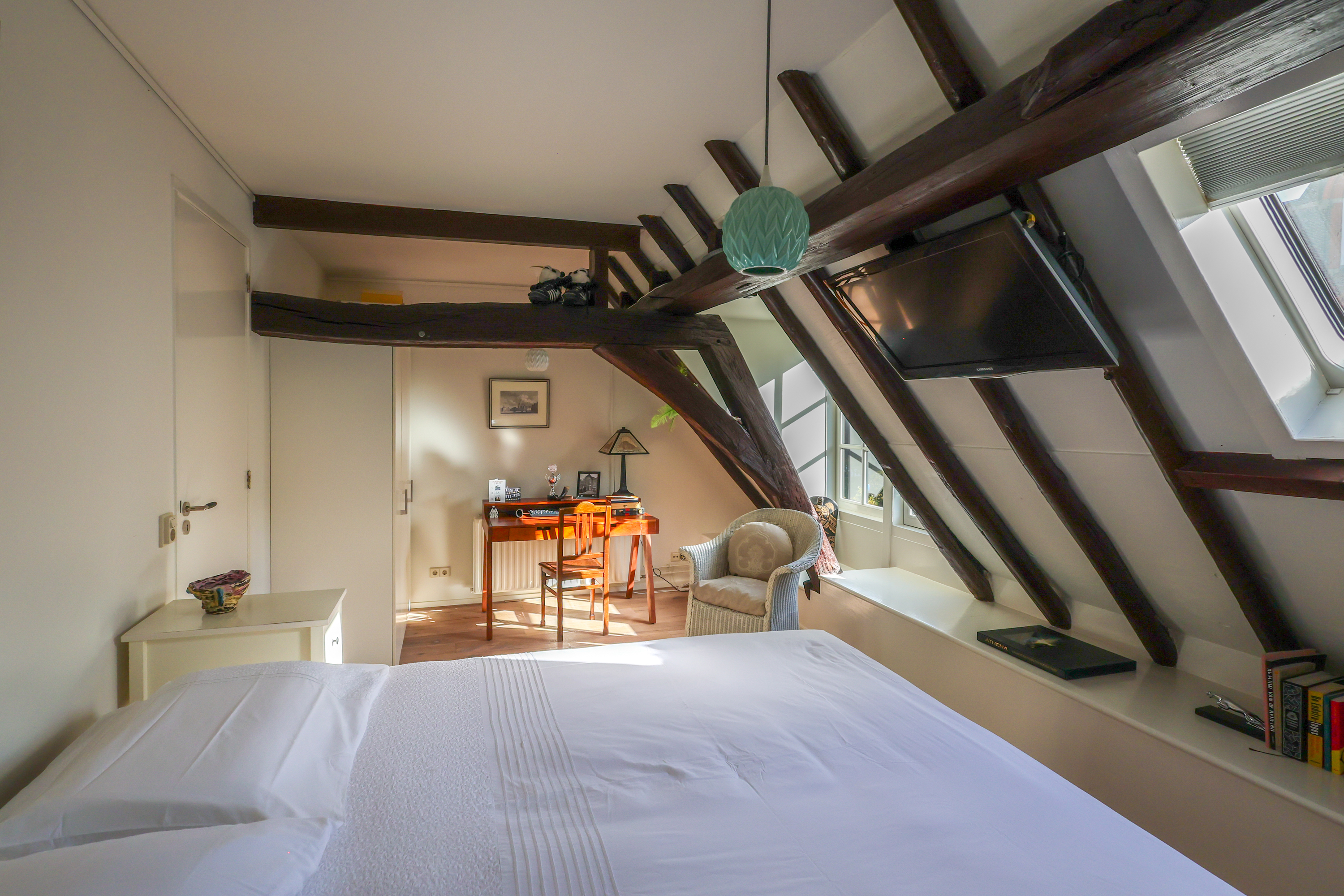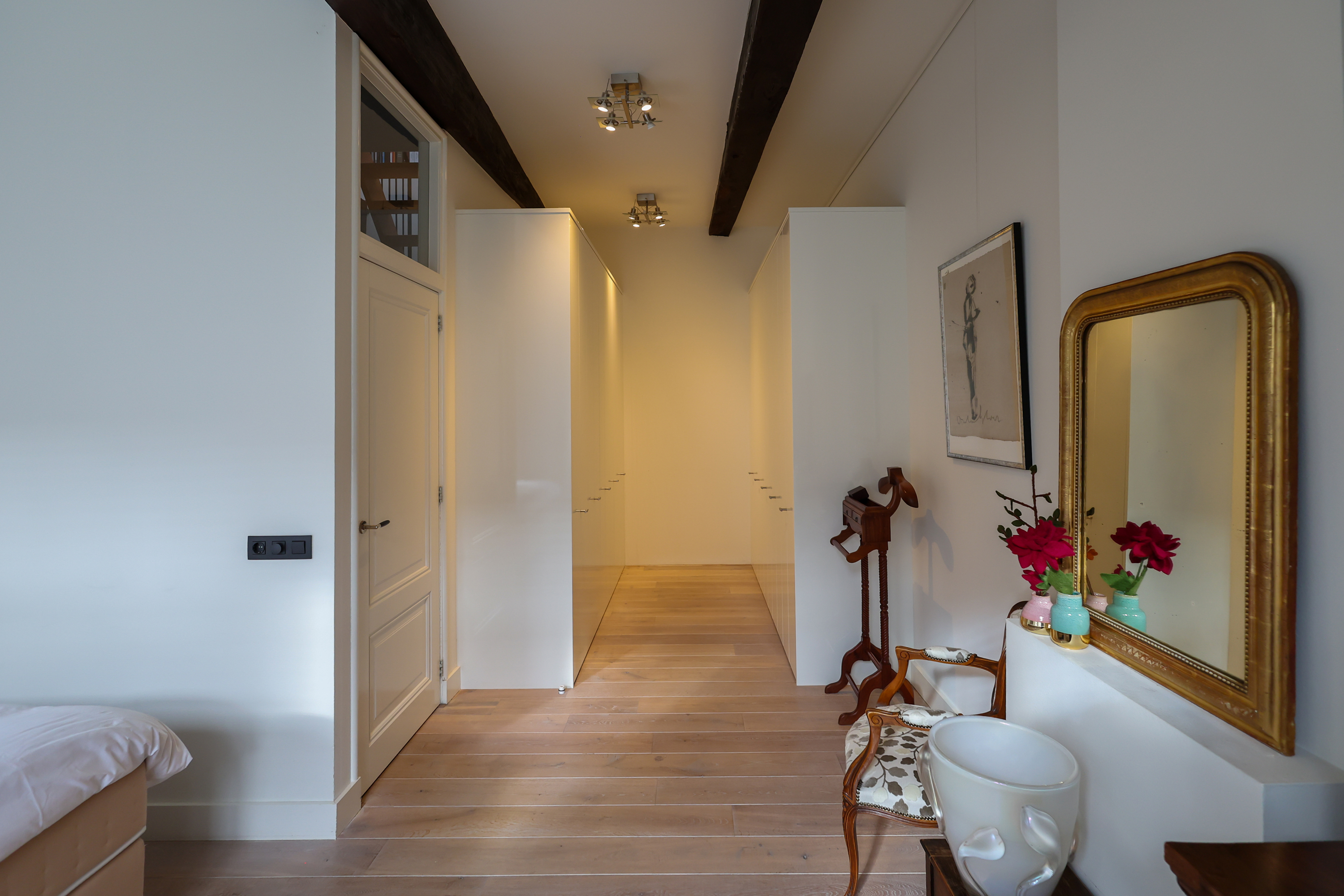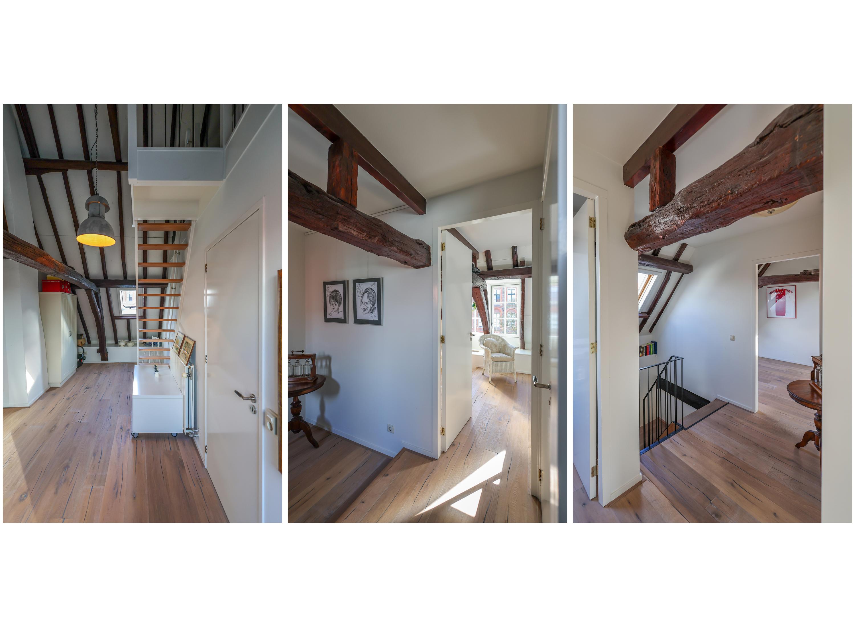 El dormitorio principal cuenta con vestidor con armarios a medida y un espacioso baño. En la planta superior, una sala versátil para trabajo o juego exhibe segmentos a la vista de la antigua muralla bajo generosas lucernarias, acentuando el vínculo con el rico pasado de Amersfoort. Tres dormitorios más y un segundo baño ofrecen opciones flexibles de alojamiento.