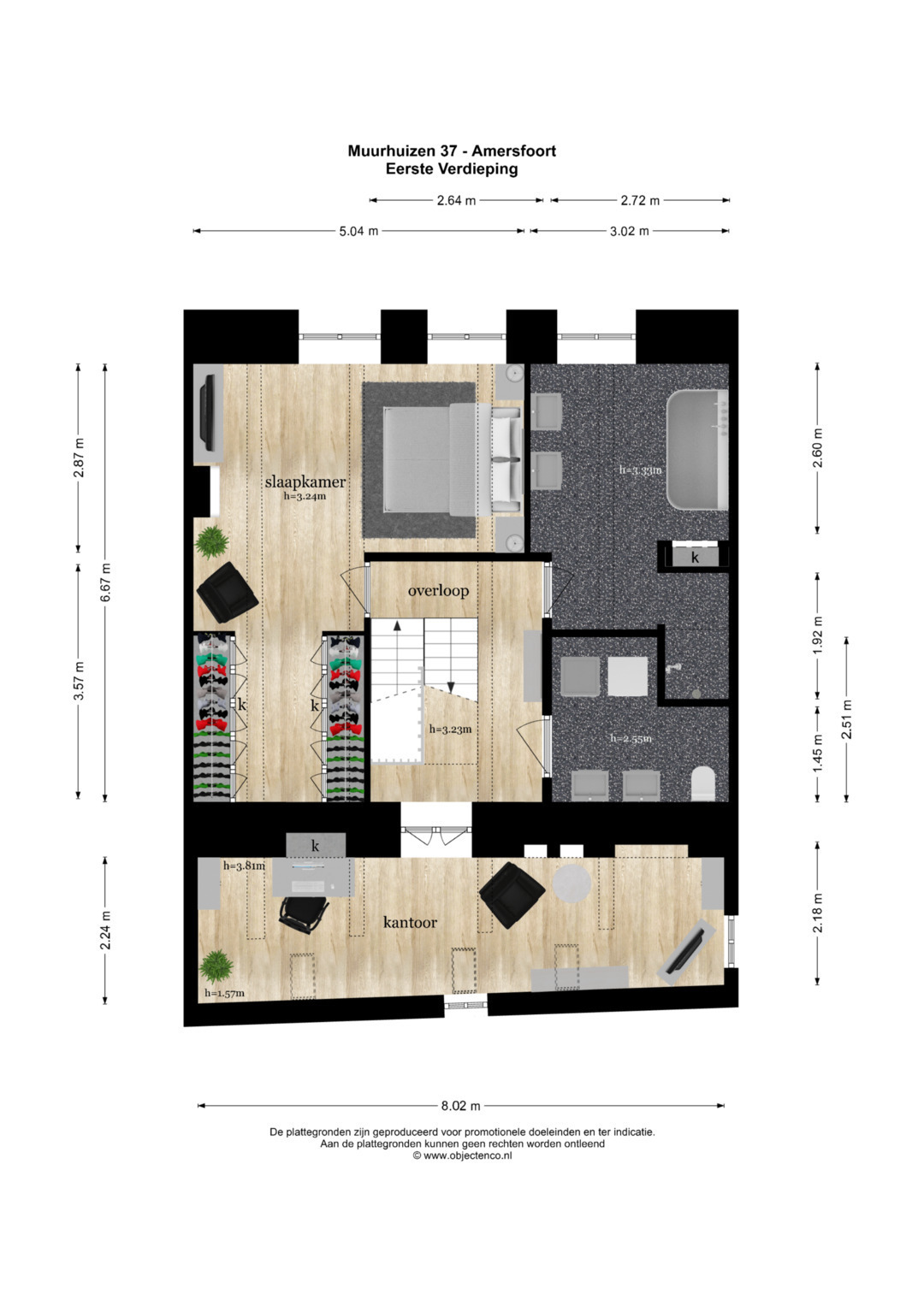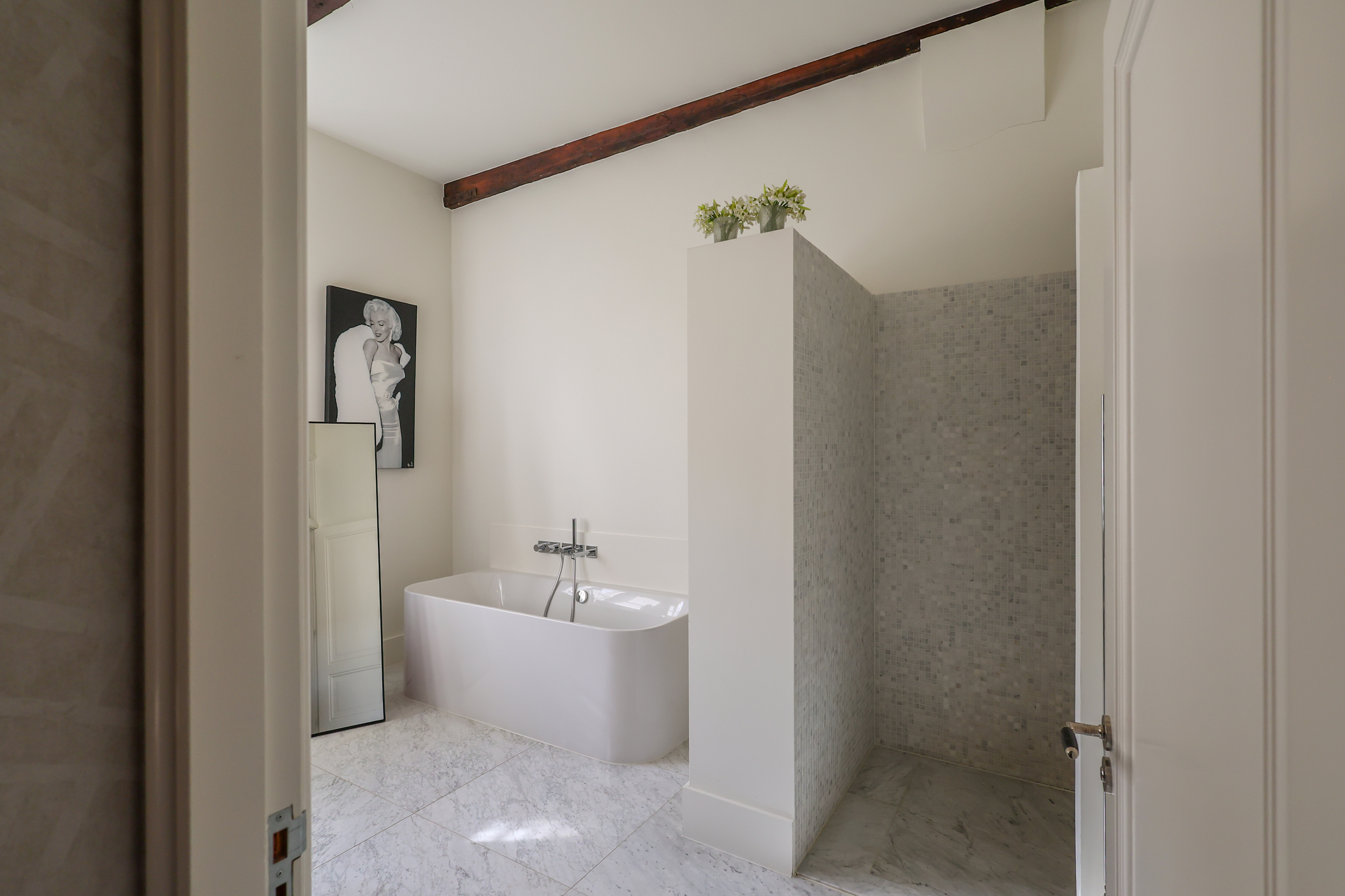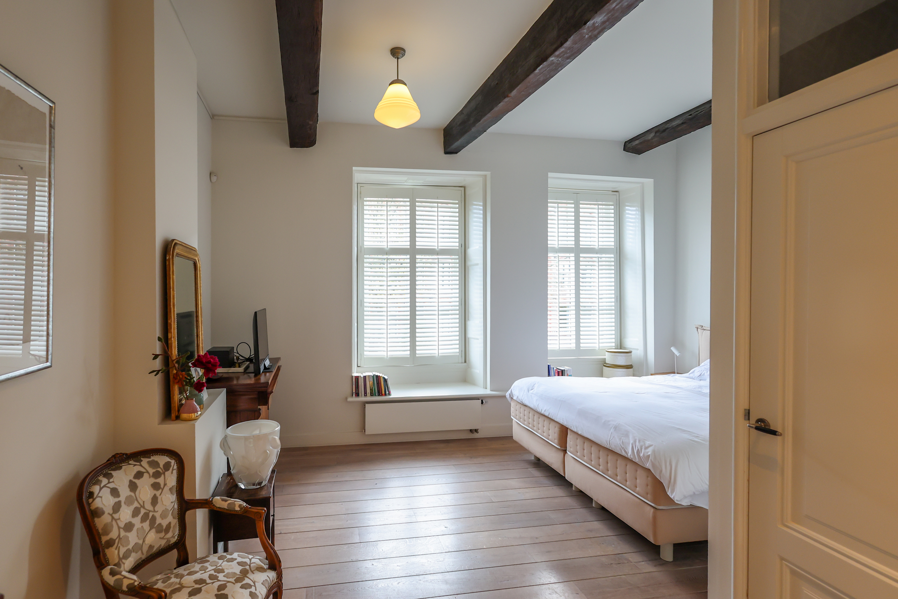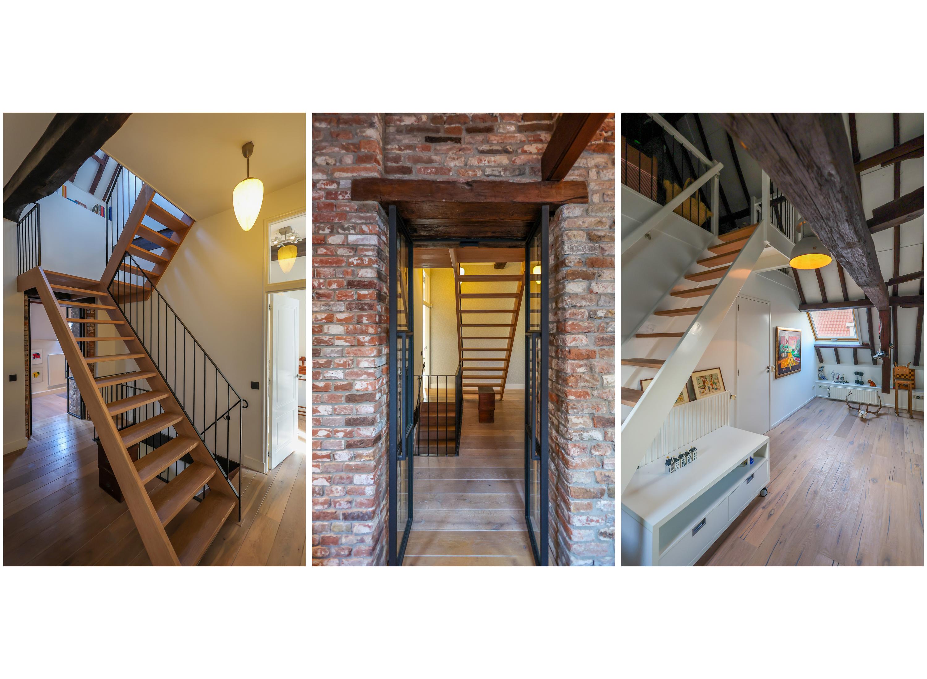 El dormitorio principal cuenta con vestidor con armarios a medida y un espacioso baño. En la planta superior, una sala versátil para trabajo o juego exhibe segmentos a la vista de la antigua muralla bajo generosas lucernarias, acentuando el vínculo con el rico pasado de Amersfoort. Tres dormitorios más y un segundo baño ofrecen opciones flexibles de alojamiento.
