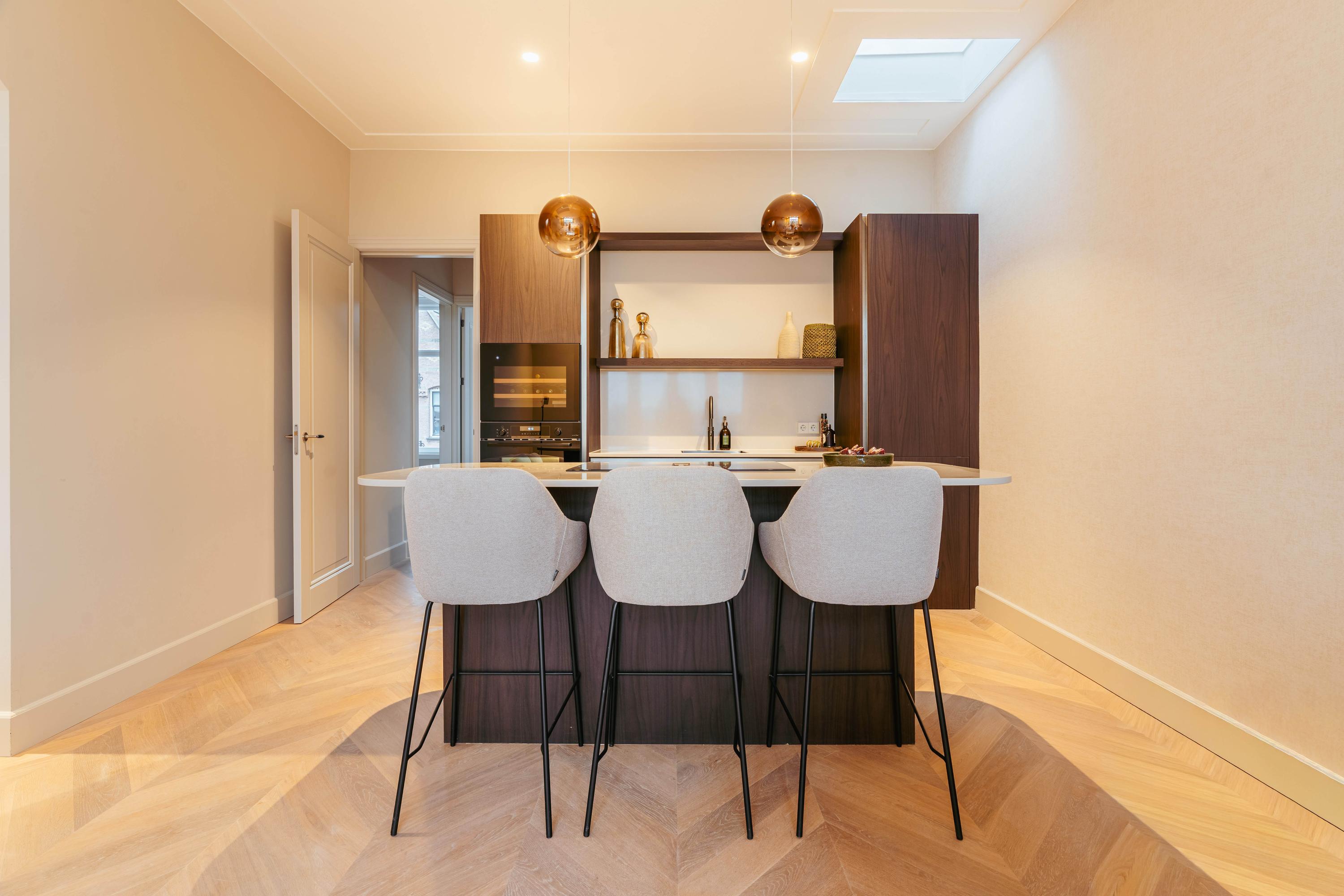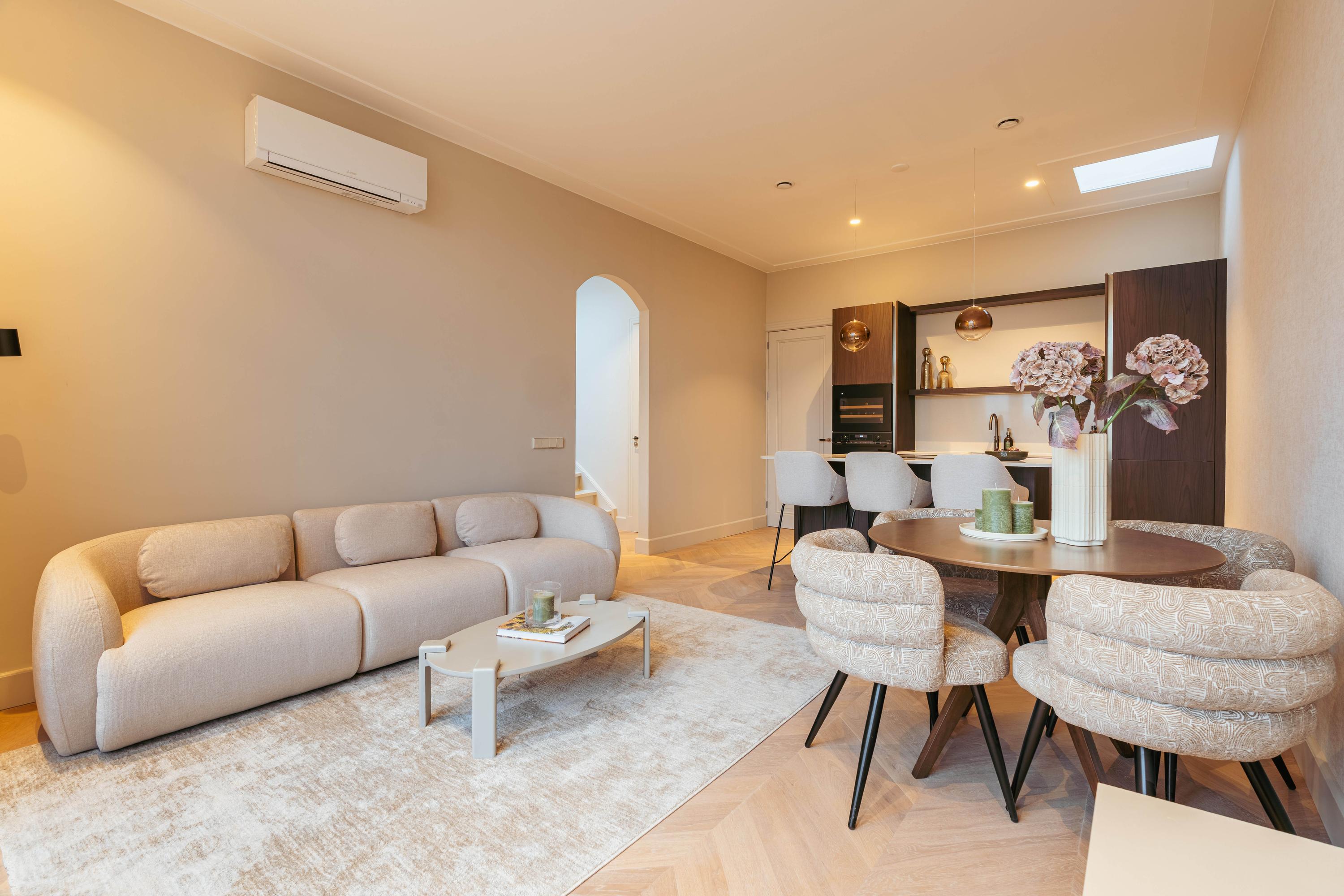 Al entrar, la sensación de amplitud es inmediata. El salón de planta abierta conduce a unas puertas francesas que dan acceso a un amplio balcón desde el que se disfruta de una vista ininterrumpida sobre el estanque de Sophialaan. Los suelos de roble en espiga, el aire acondicionado y el acristalamiento doble aportan bienestar y silencio en todo el espacio. La cocina a medida cuenta con una isla para cuatro o cinco comensales, equipada con electrodomésticos de última generación y amplias vistas al exterior. Tres dormitorios bien dimensionados permiten una vida flexible y cada uno refleja la tranquilidad del entorno.