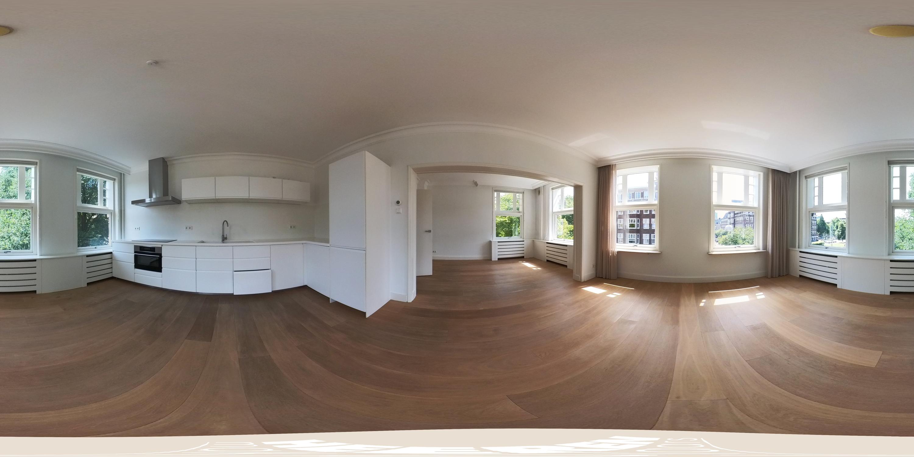La entrada se realiza a través de un espacio comunitario bien mantenido, con acceso por ascensor y vigilancia integral mediante cámaras. En el interior, el apartamento recibe con un luminoso salón comedor en dos ambientes, rodeado por elegantes ventanales en tres lados con vistas a Minervaplein. La cocina abierta está equipada con electrodomésticos integrados, incluyendo placa de inducción, horno combinado, lavavajillas, nevera y congelador, aunando funcionalidad con líneas contemporáneas y discretas.