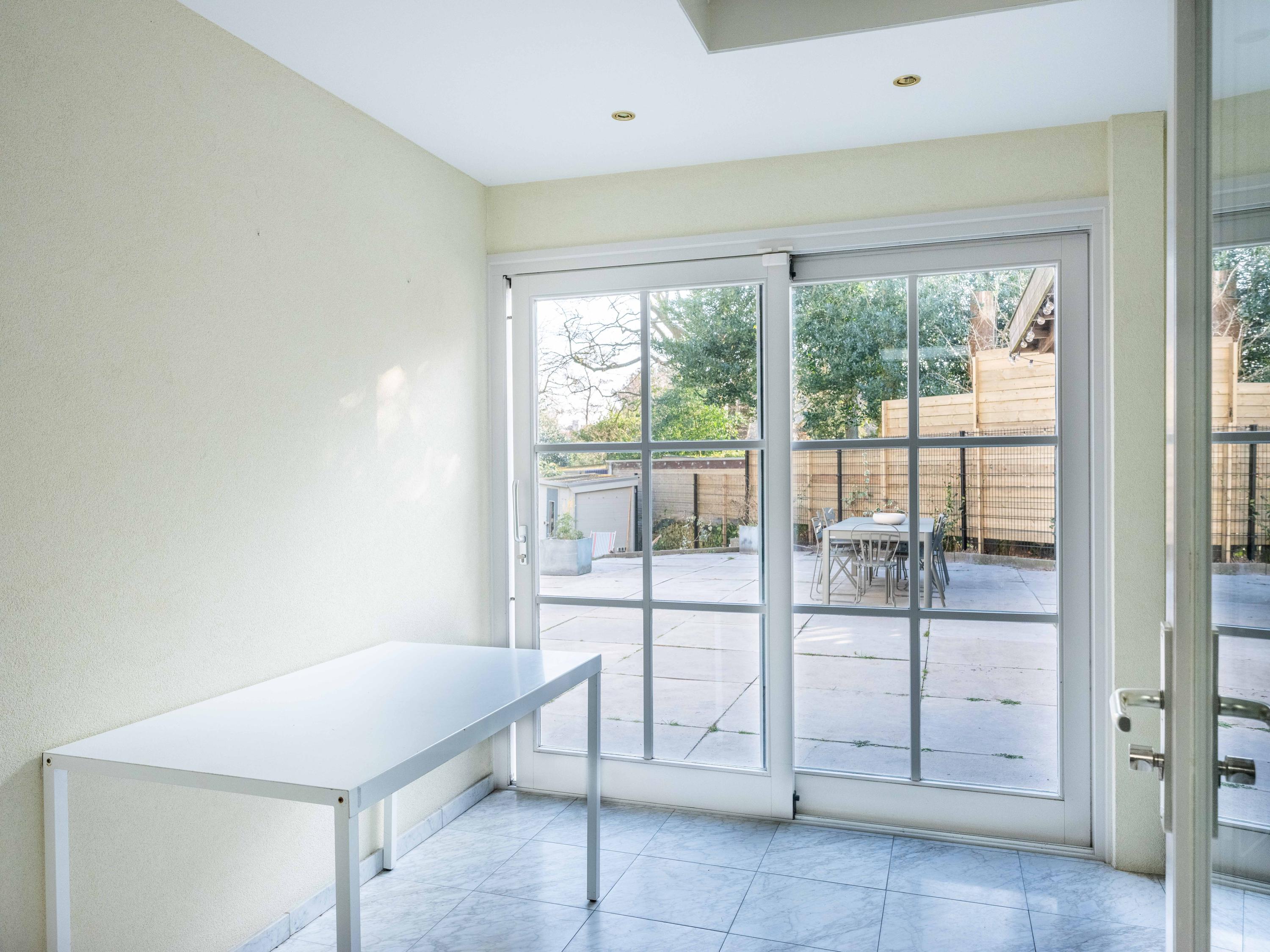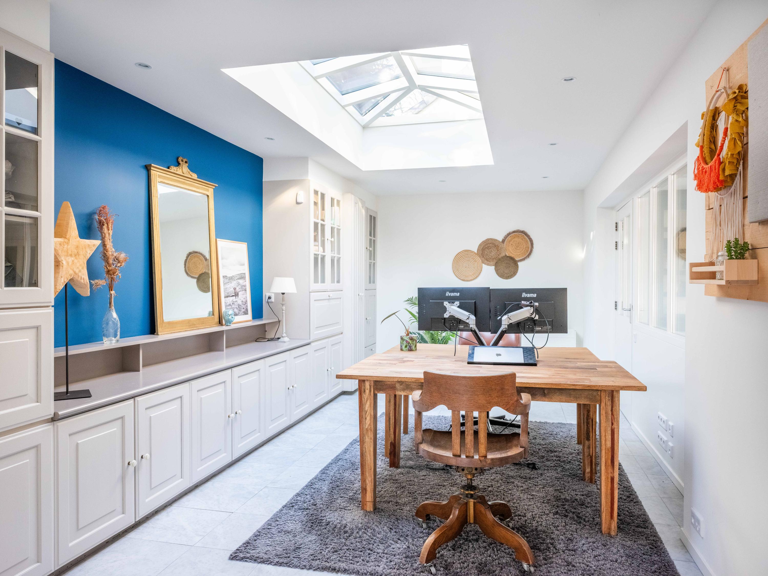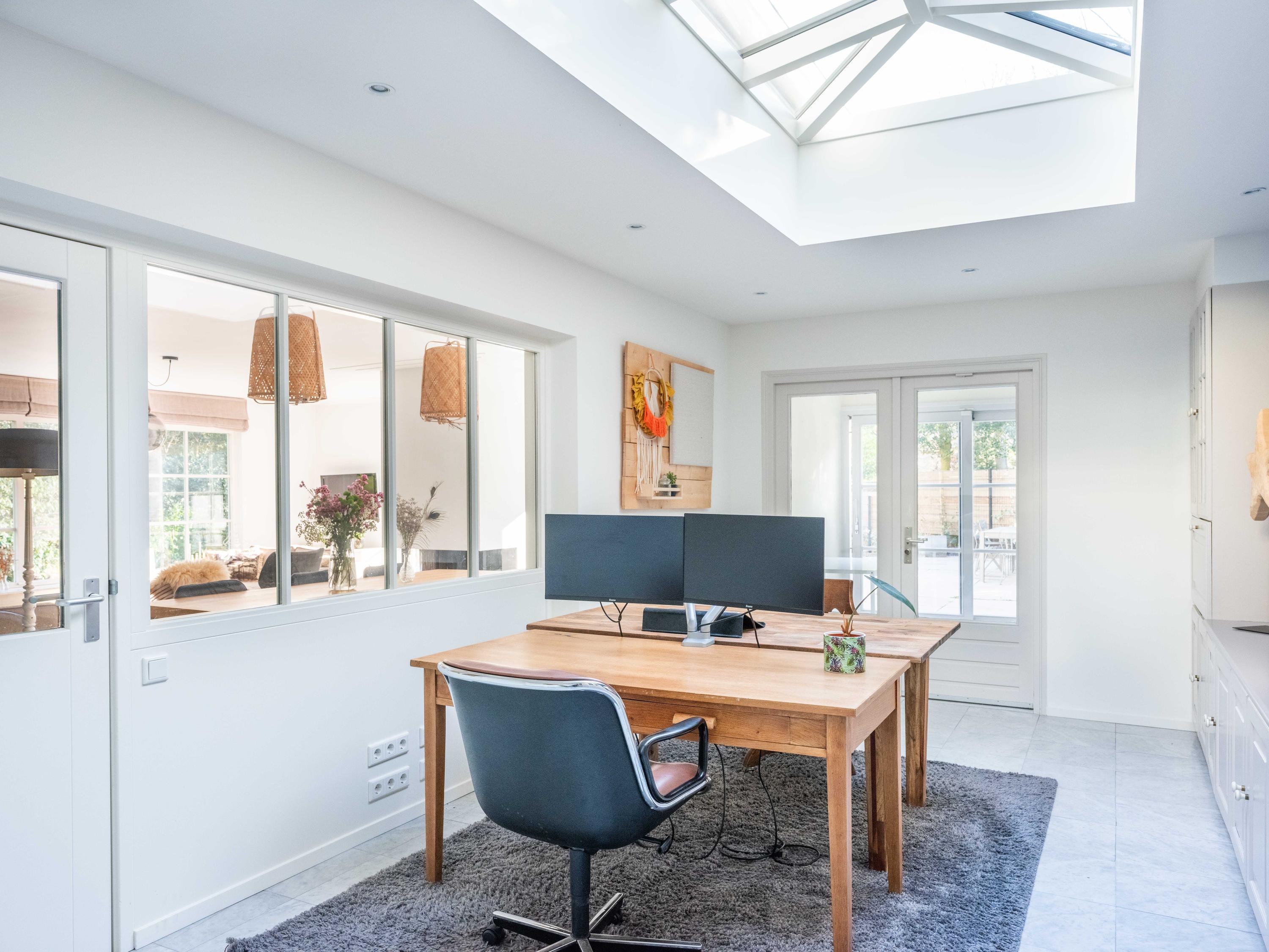 Al entrar al vestíbulo, se atraviesan la escalera y el guardarropa para llegar a una cocina diseñada para la excelencia culinaria, equipada con una placa de inducción de cinco fuegos, grifo Quooker, vaporizador y dos hornos combinados. La luz natural llena el salón, que cuenta con chimenea y puertas correderas que dan acceso a una terraza orientada al jardín cerrado con esmero. En la misma planta, una oficina versátil y un área de lavandería conectan directamente con el exterior, invitando a una transición fluida entre el trabajo, el ocio y la privacidad del hogar.