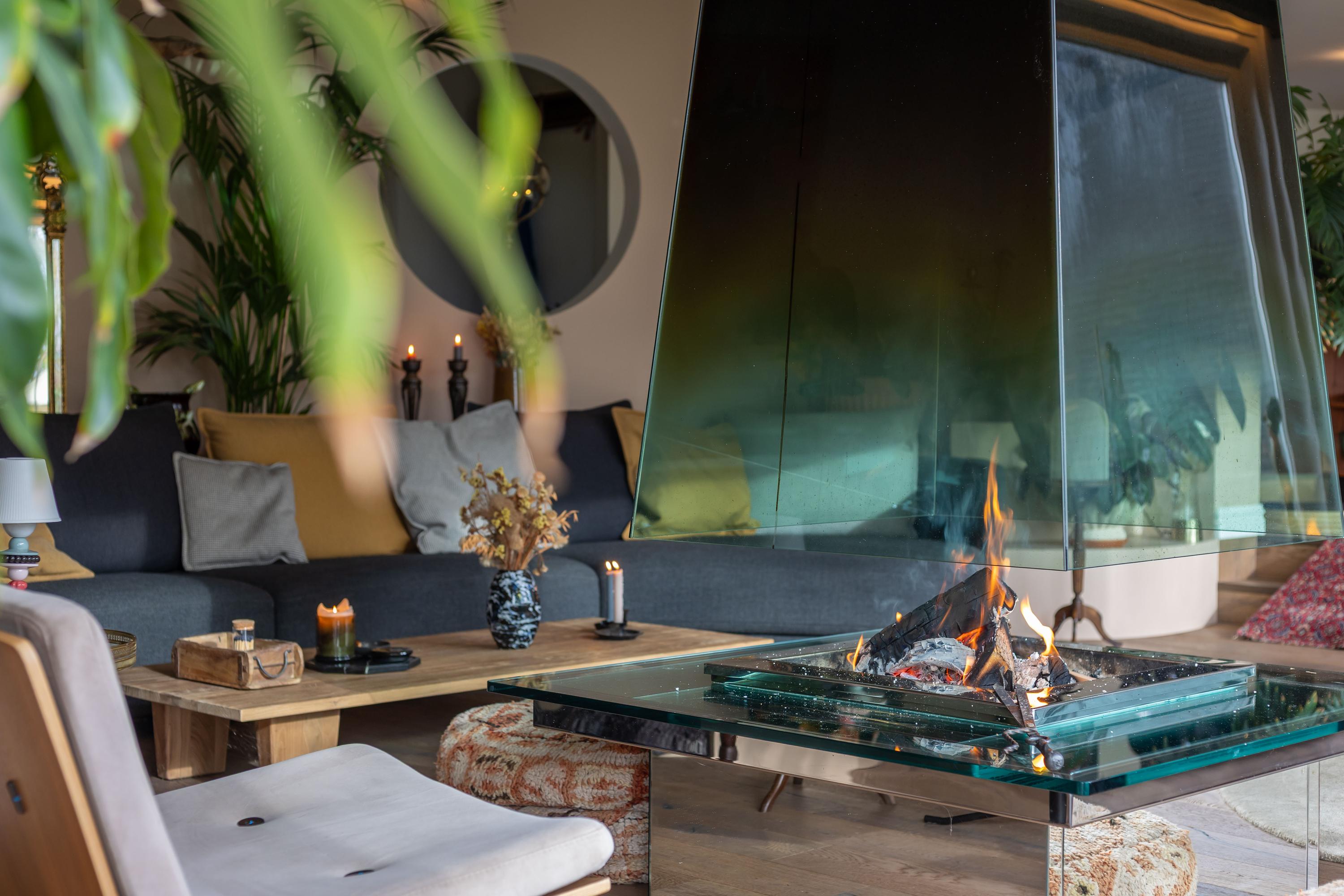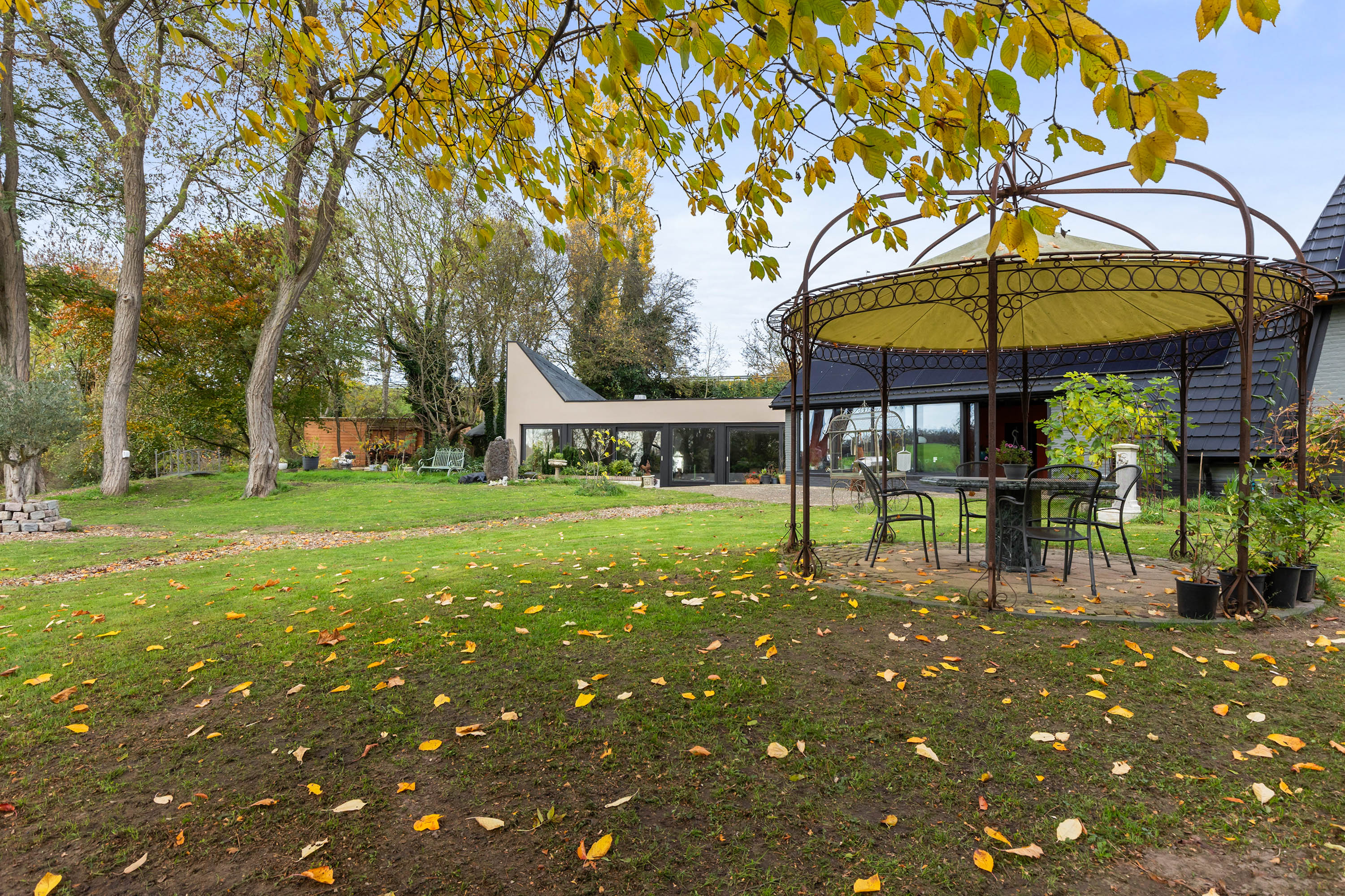 El espacio comercial adyacente ofrece aún más posibilidades para atelier, showroom o alojamiento para invitados, con vigas de madera negra y amplios ventanales que exhiben su artesanía y presencia. En el exterior, el jardín se funde con la naturaleza agrícola e incluye un pabellón, una terraza flotante y una plataforma privada, generando un refugio de intimidad. Árboles maduros y un diseño paisajístico pensado completan la sensación de serenidad.