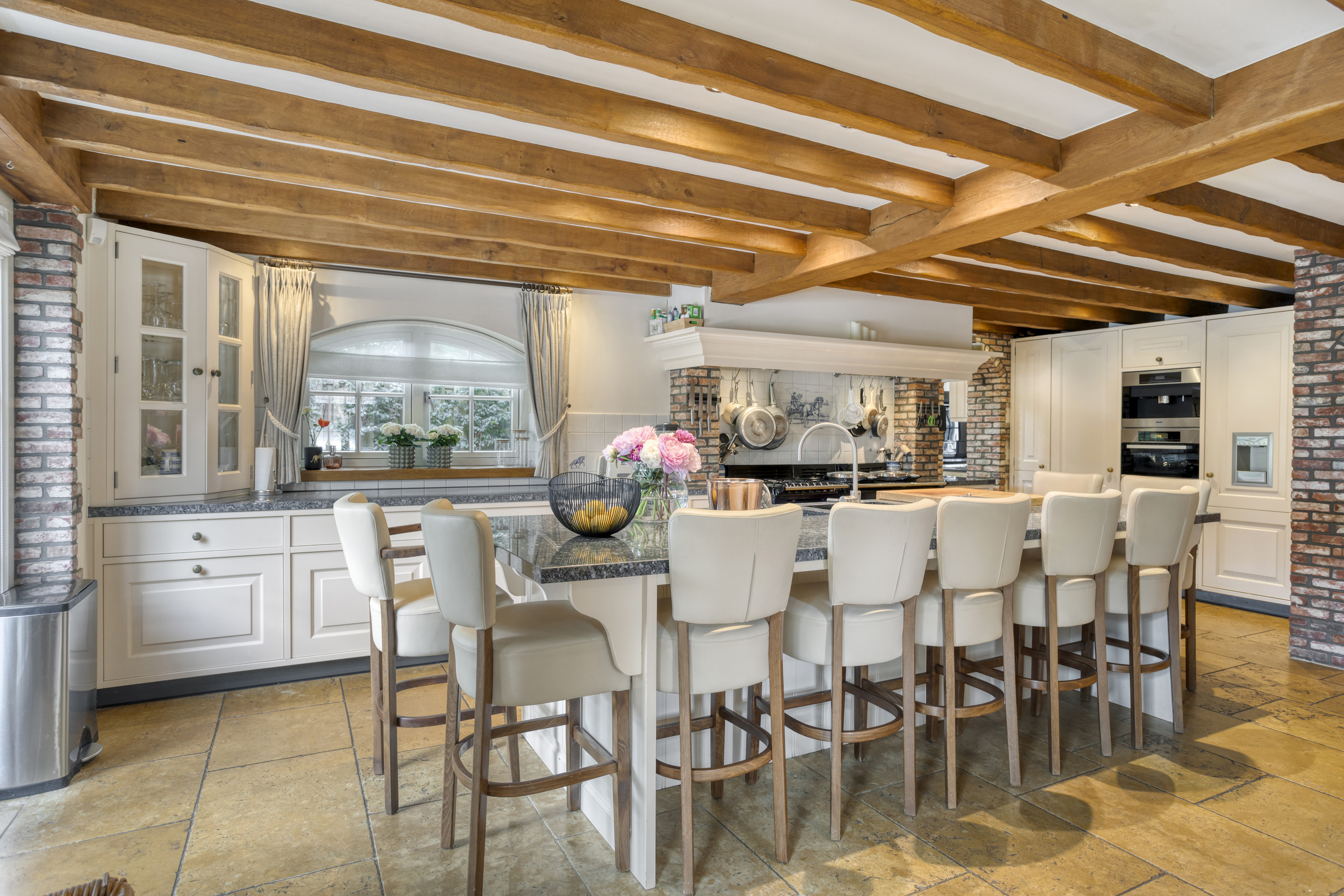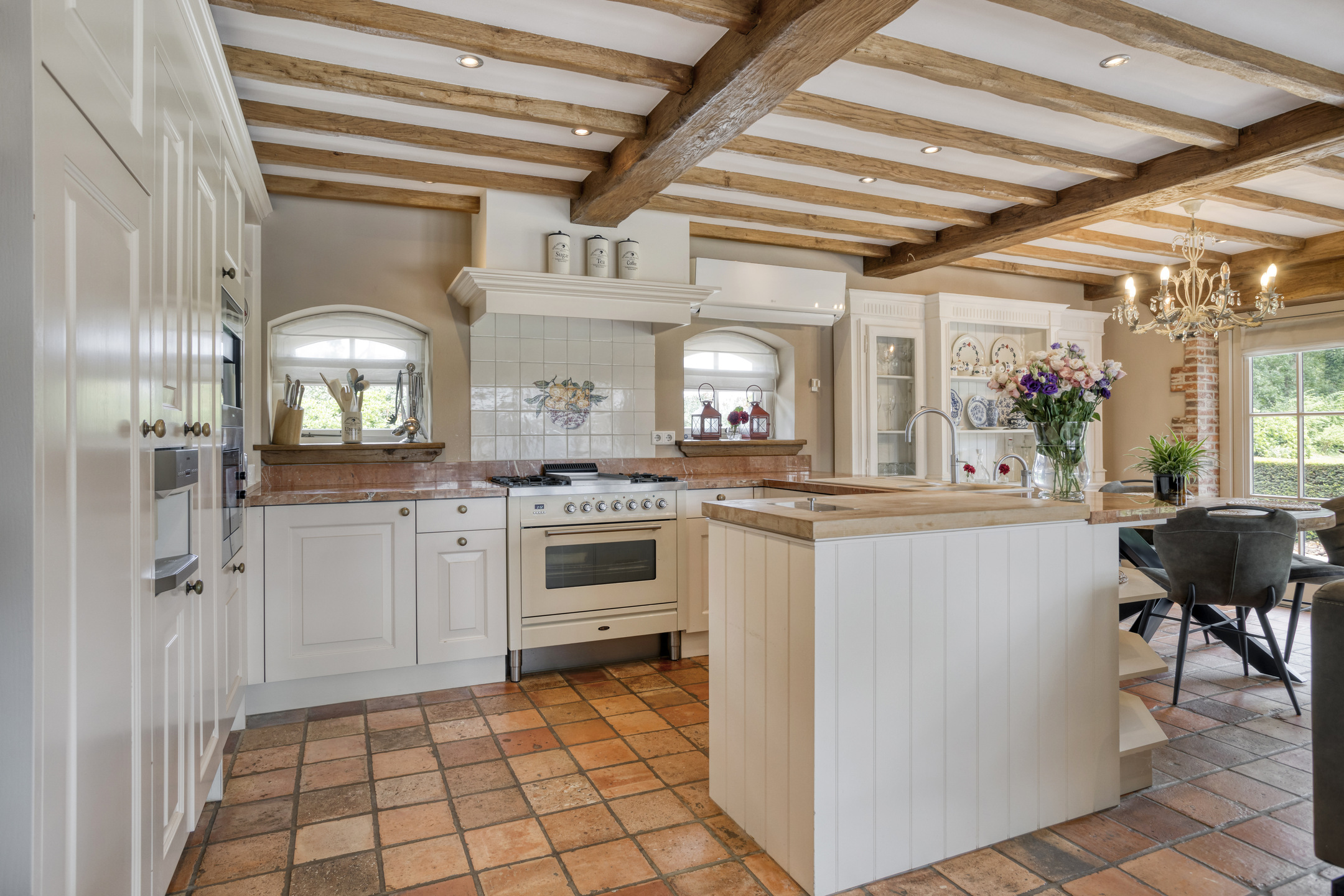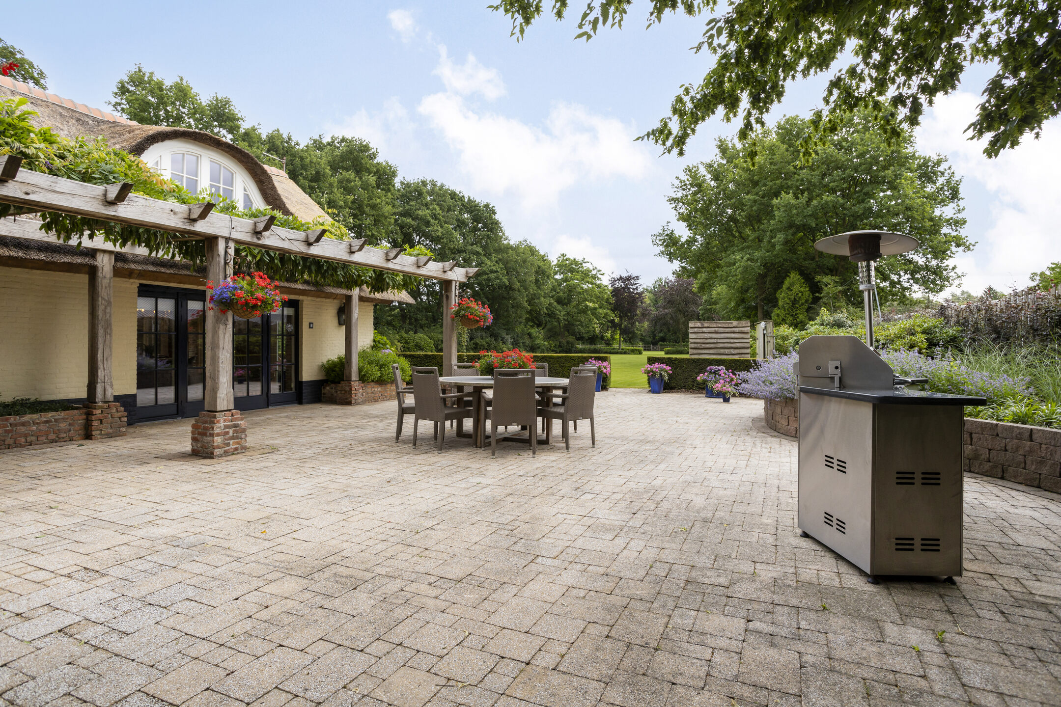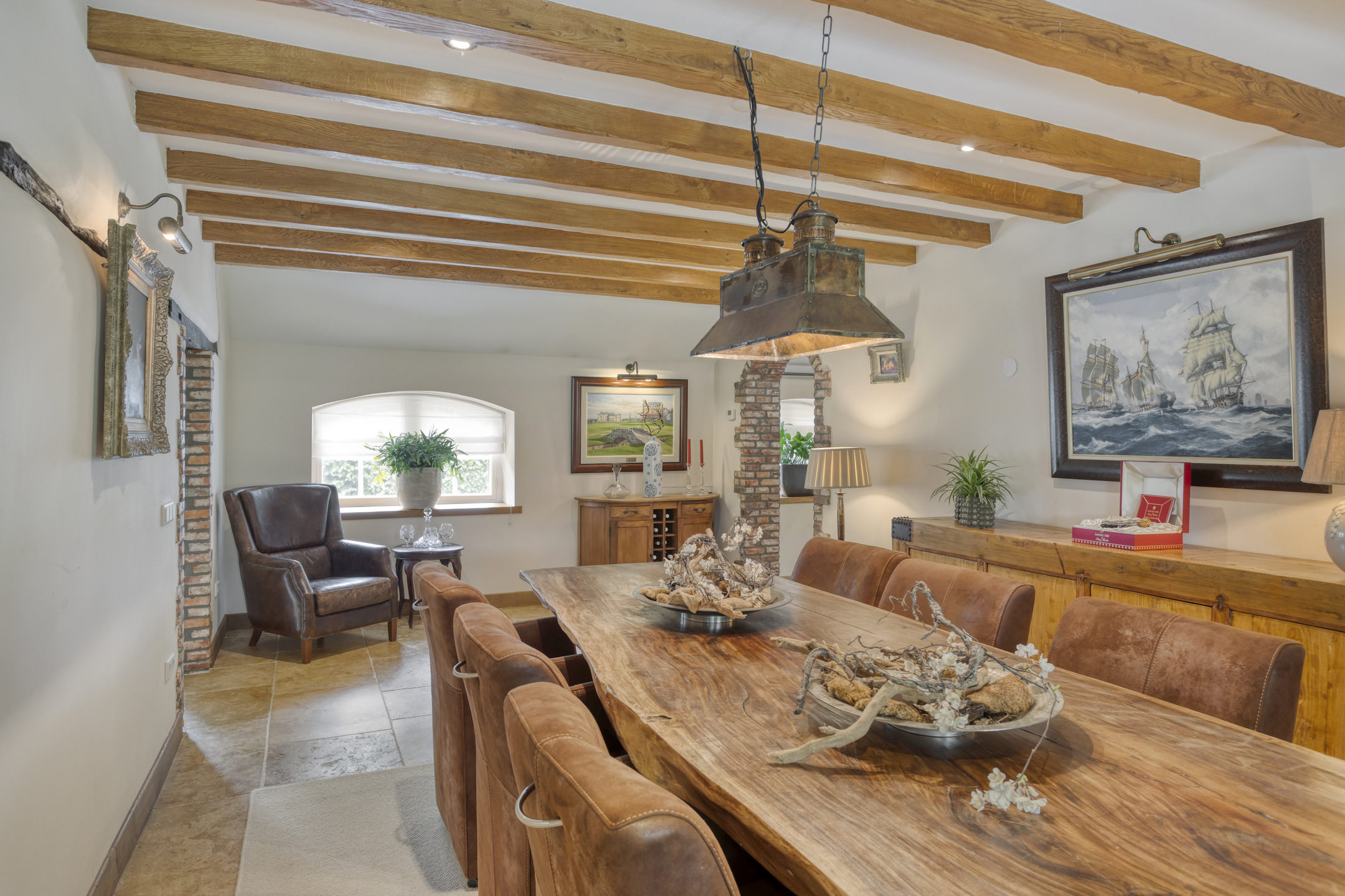 La finca rústica Riethoven ofrece una sensación de privacidad y herencia en una tranquila calle a las afueras de Riethoven, Países Bajos. Esta residencia totalmente renovada ocupa una magnífica parcela de 6.755 m², con 484 m² de espacio habitable que equilibra el carácter restaurado con el confort contemporáneo, e incluye una casa de invitados independiente y un amplio anexo. La finca se realza mediante un techo de paja y detalles cuidadosamente seleccionados, desde la entrada con suelo de mármol y las escaleras de madera tallada hasta las elegantes vigas y los amplios interiores llenos de luz.