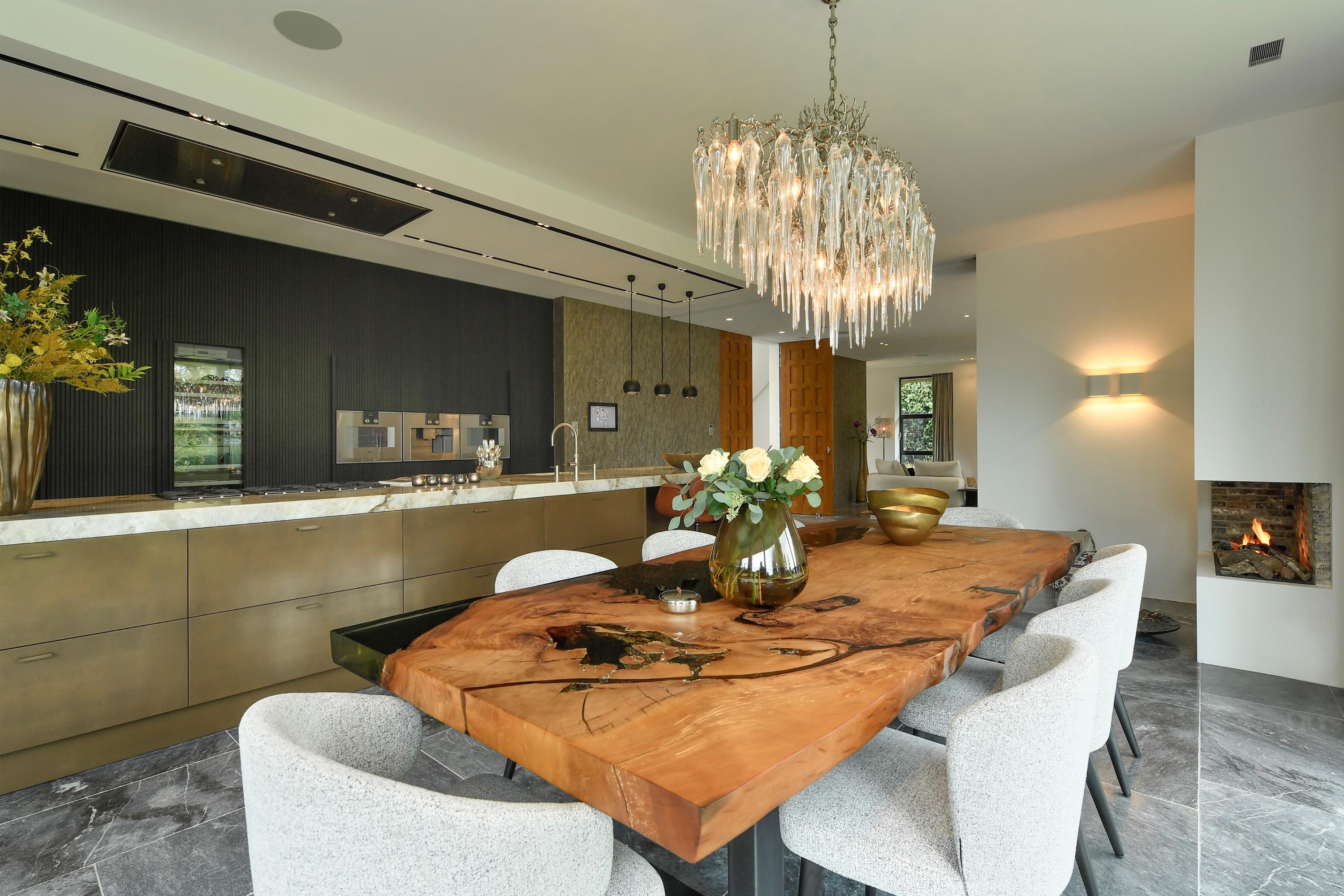Al entrar, un majestuoso vestíbulo con una escalera curva y altas puertas dobles da la bienvenida, conduciendo a estancias donde la luz define cada ambiente. El salón, con una elegante chimenea como centro, se conecta perfectamente con las terrazas y el jardín, mientras que las puertas correderas de madera permiten adaptar los ambientes entre sala de estar y comedor. La cocina está equipada con una isla de cuarcita Patagonia, electrodomésticos Gaggenau, y se integra con una zona de servicio con acceso directo al garaje doble con puertas eléctricas.
