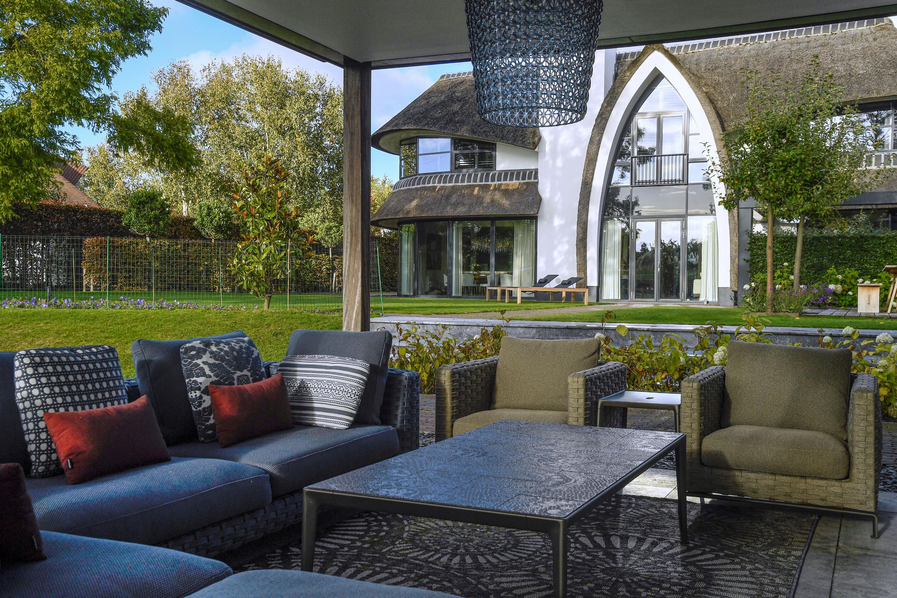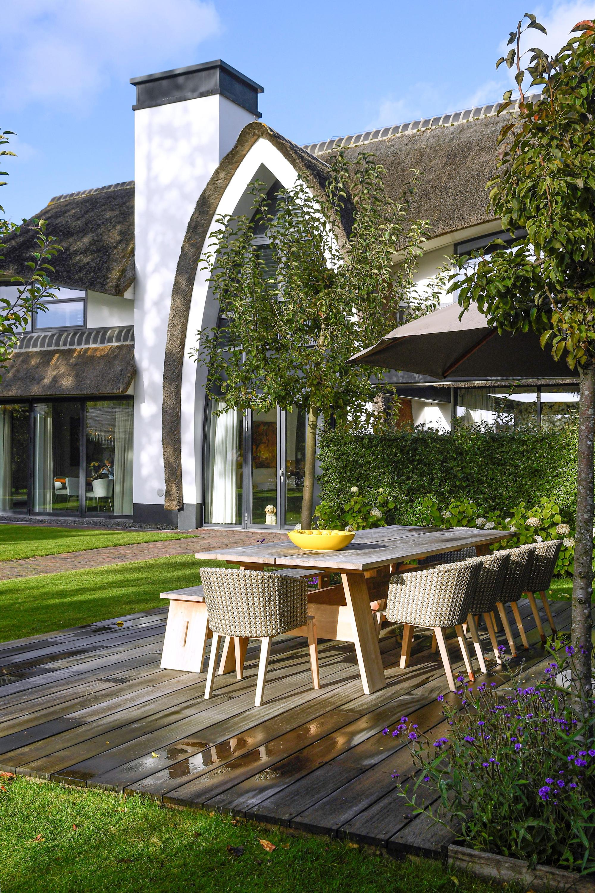 Los jardines, diseñados por un paisajista, enmarcan las terrazas y una casa-barco de 53 m² con elevador controlado por mando a distancia, ofreciendo acceso privado a las vías navegables holandesas. Una veranda cubierta adyacente, equipada con chimenea de leña, permite disfrutar del aire libre todo el año.