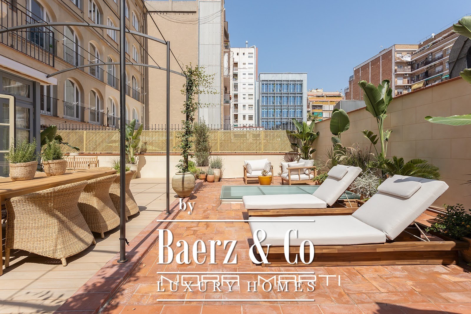 Chacune des trois chambres, orientées vers l’extérieur, dispose d’un lit double, de placards sur mesure et de salles d’eau attenantes dotées de robinetterie en laiton vieilli d’un fabricant catalan de renom. L’éclairage décoratif, en provenance de Catalogne et d’Angleterre, mélange pièces vintage et antiques, enrichissant l’atmosphère. La terrasse végétalisée, particulièrement accueillante, offre une rare tranquillité sur le Passeig de Sant Joan, propice à la détente, la convivialité et un sentiment d’espace unique au centre de Barcelone. Cet appartement de prestige à vendre au Passeig de Sant Joan conjugue matériaux intemporels et confort contemporain dans une adresse urbaine d’exception.