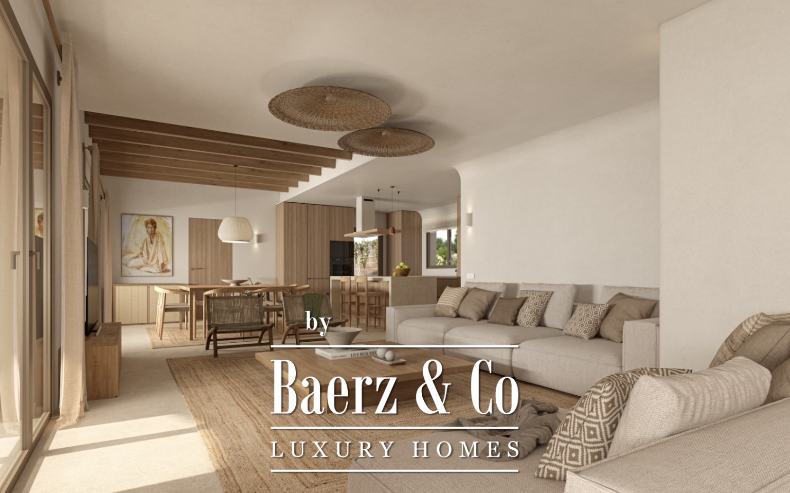 Un parking couvert vous accueille, bordé de bougainvilliers et de claustras. À l’intérieur, le séjour, la salle à manger et la cuisine ouverts dévoilent poutres apparentes et enduit à la chaux, baignés de teintes naturelles douces. La cuisine comprend un îlot central et des équipements Bosch, facilitant le rythme quotidien et la convivialité, tandis que les grandes fenêtres invitent la lumière naturelle et offrent un accès fluide à la véranda couverte et à la terrasse piscine.