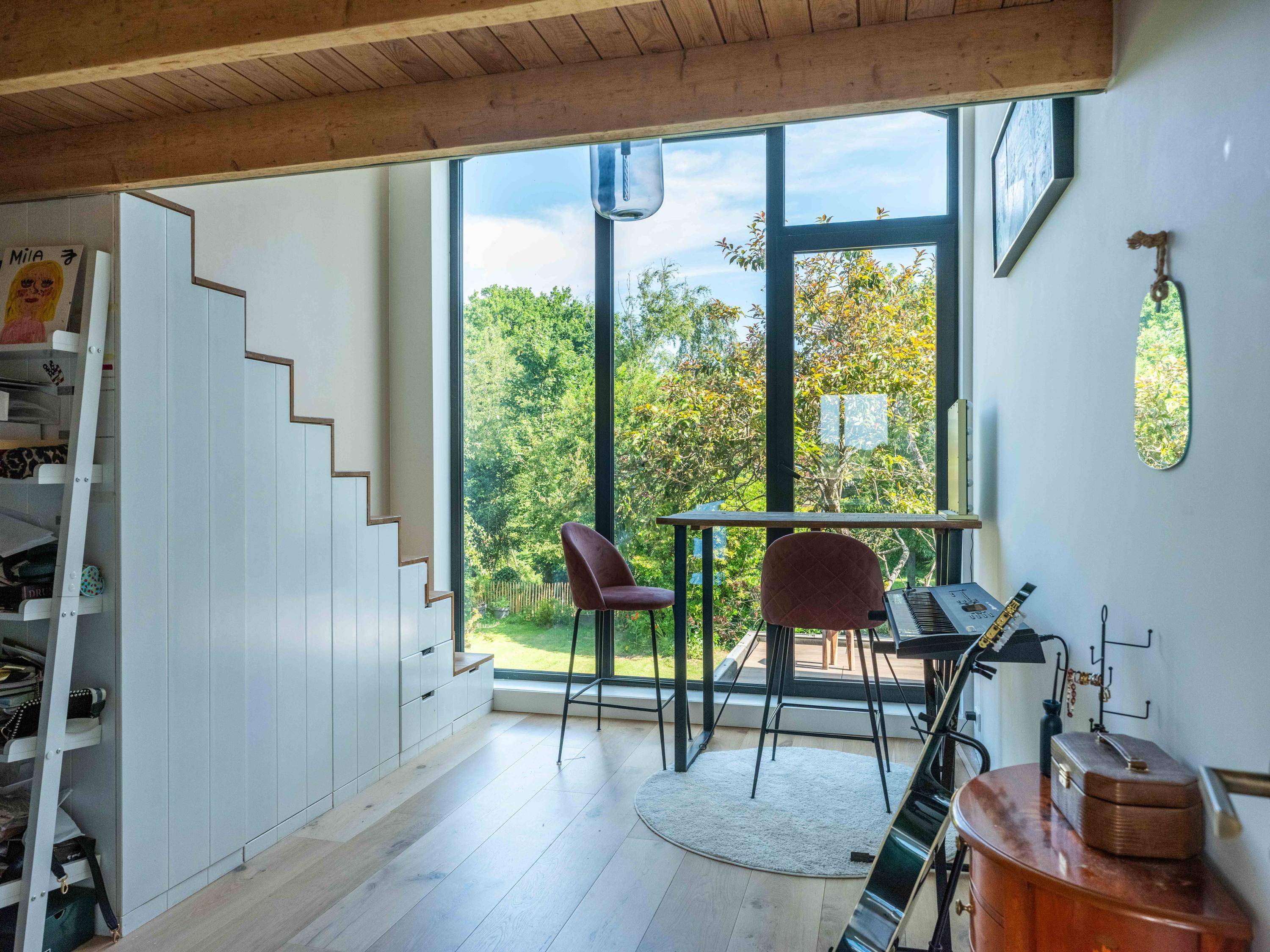 À l’étage, trois chambres, un bureau polyvalent avec vue panoramique, une salle de yoga et une mezzanine à la conception ludique répondent à la fois à la vie de famille et aux projets créatifs. Une seconde salle de bain complète, une buanderie séparée et un soin du détail constant offrent un confort réfléchi.