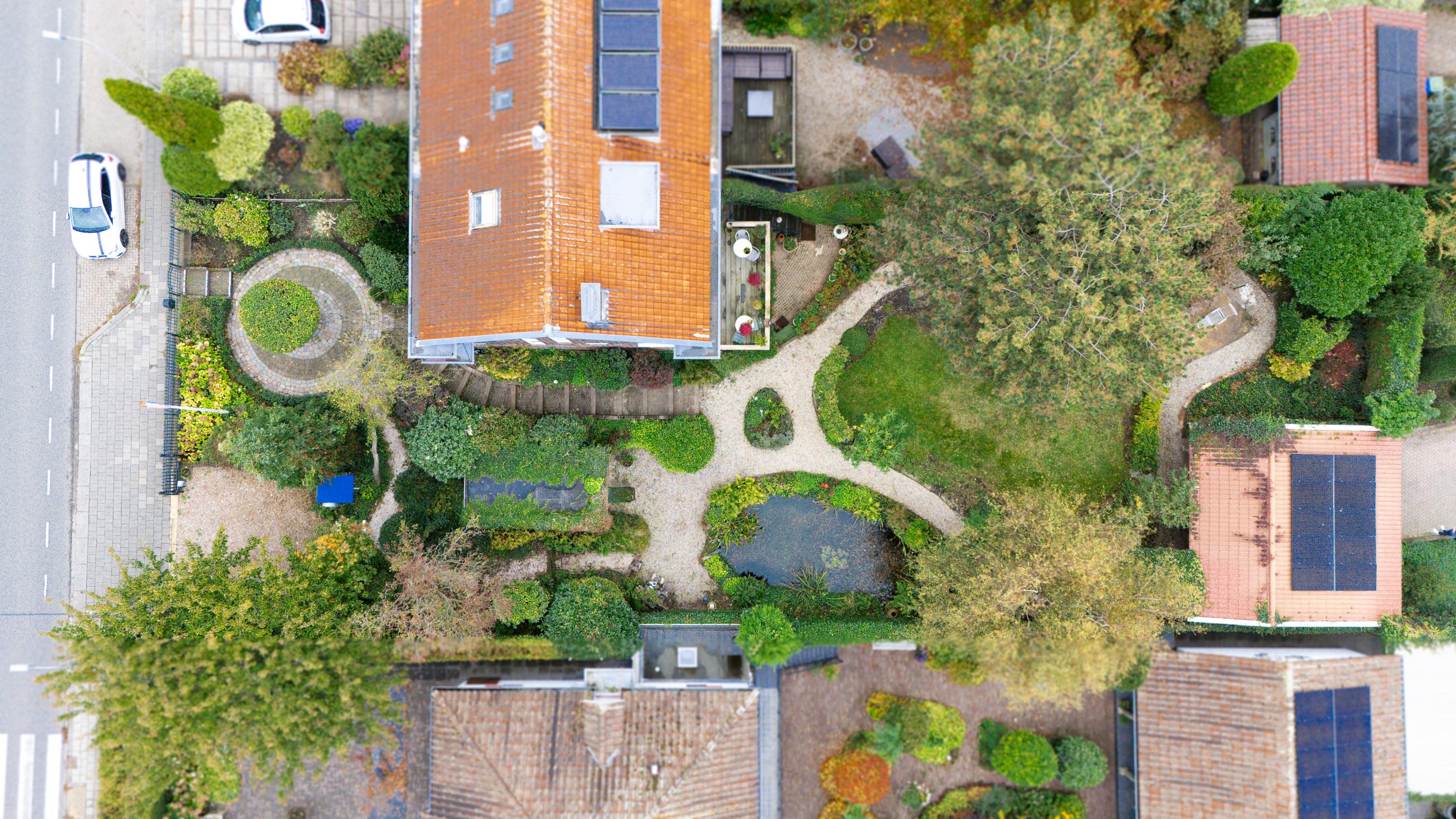 À l’intérieur, le parquet d’origine et une cheminée pleine d’atmosphère instaurent une ambiance apaisante dans le séjour. La cuisine dispose d’équipements modernes : réfrigérateur, lave-vaisselle, four et plaque à induction. Le rez-de-chaussée s’ouvre harmonieusement sur le jardin, invitant la nature à l’intérieur. À l’étage, deux grandes chambres—anciennement subdivisées, avec possibilité de les séparer à nouveau—offrent un espace de repos, agrémentées de balcons donnant sur la verdure et de la climatisation pour un confort optimal. La première salle de bains comprend une douche, un lavabo et un sèche-serviettes.