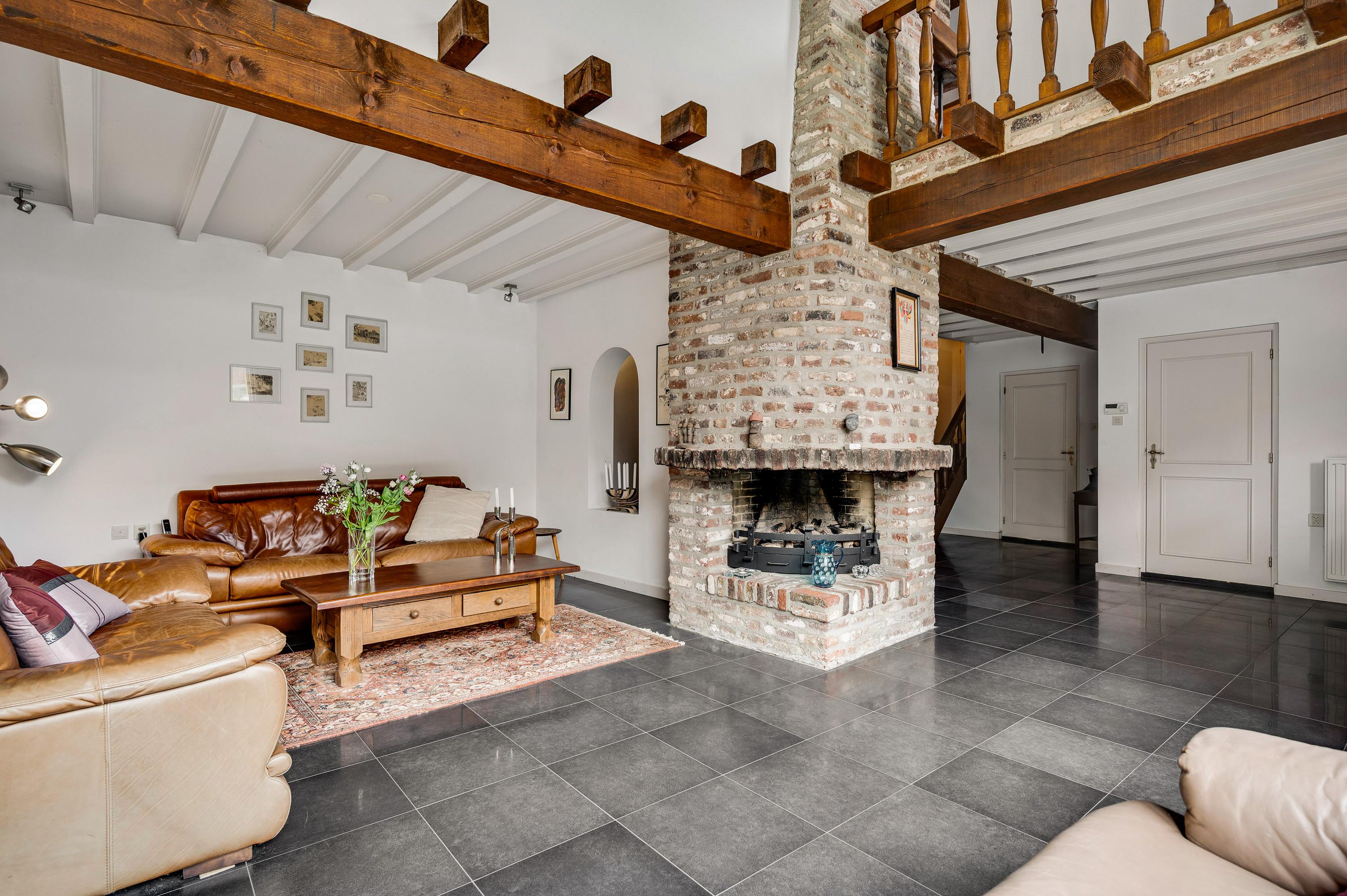L’entrée traversante mène à un vaste hall puis à un séjour modulable d’environ 56 m², dont de larges baies vitrées et portes doubles s’ouvrent sur le jardin paysager, ainsi qu’à une cuisine de 21 m² parfaitement équipée pour un usage moderne. Certaines pièces bénéficient d’un chauffage au sol, de murs soigneusement enduits et de planchers bois harmonisés aux éléments authentiques comme la cheminée centrale. À l’étage, trois chambres s’associent à un salon et une salle de bains contemporaine, accessibles via des escaliers distincts, favorisant la confidentialité des résidents ou invités.