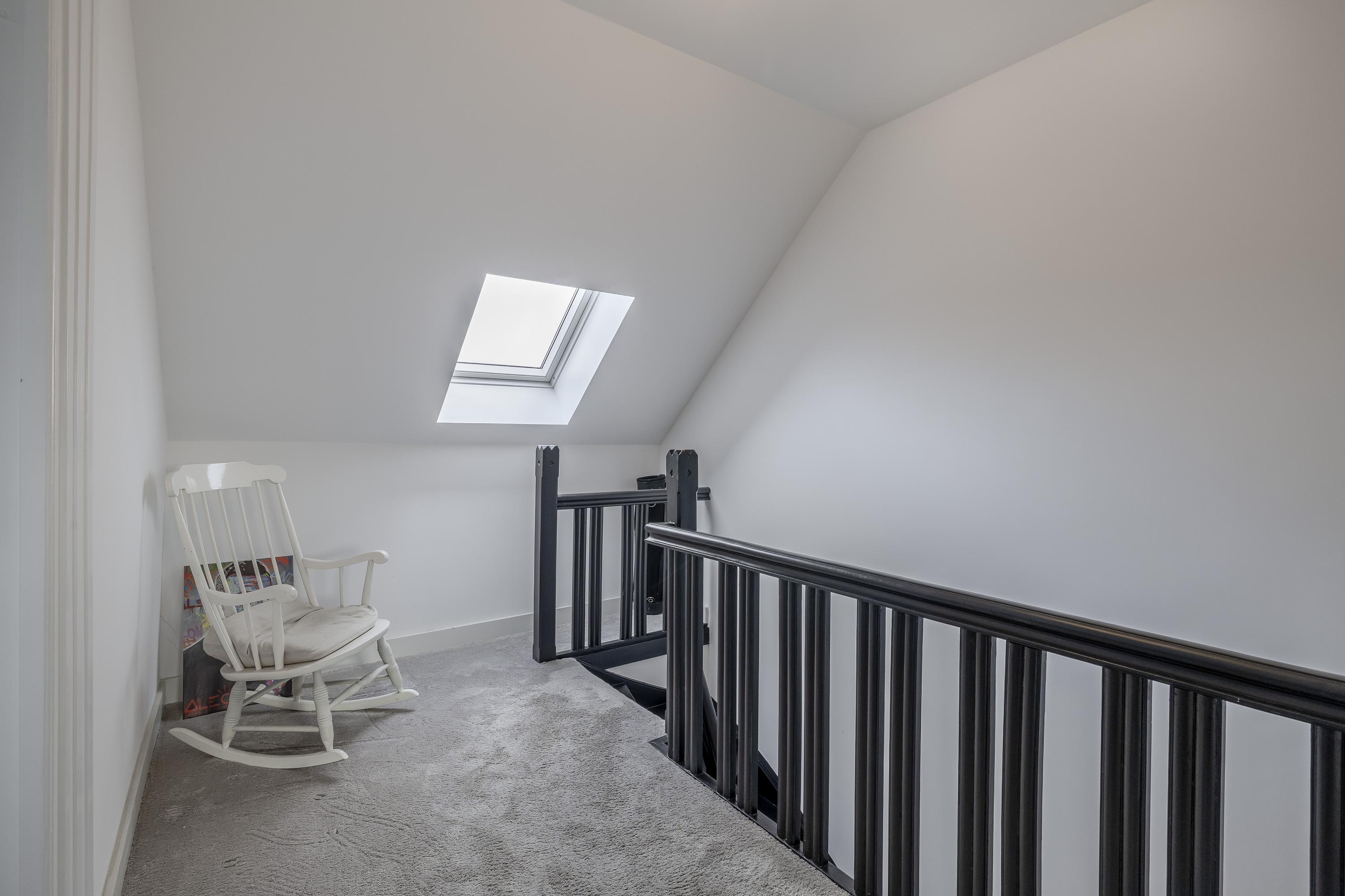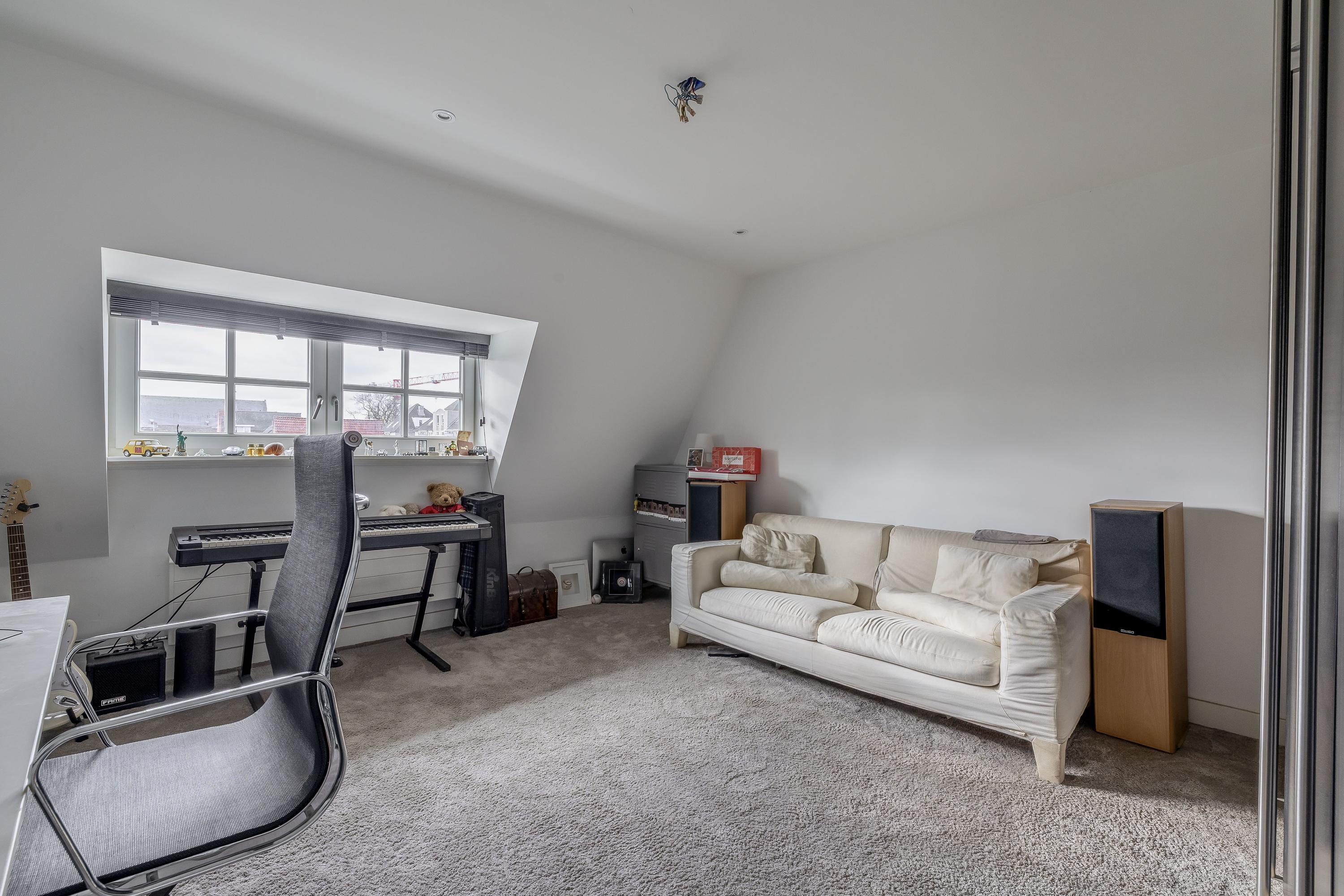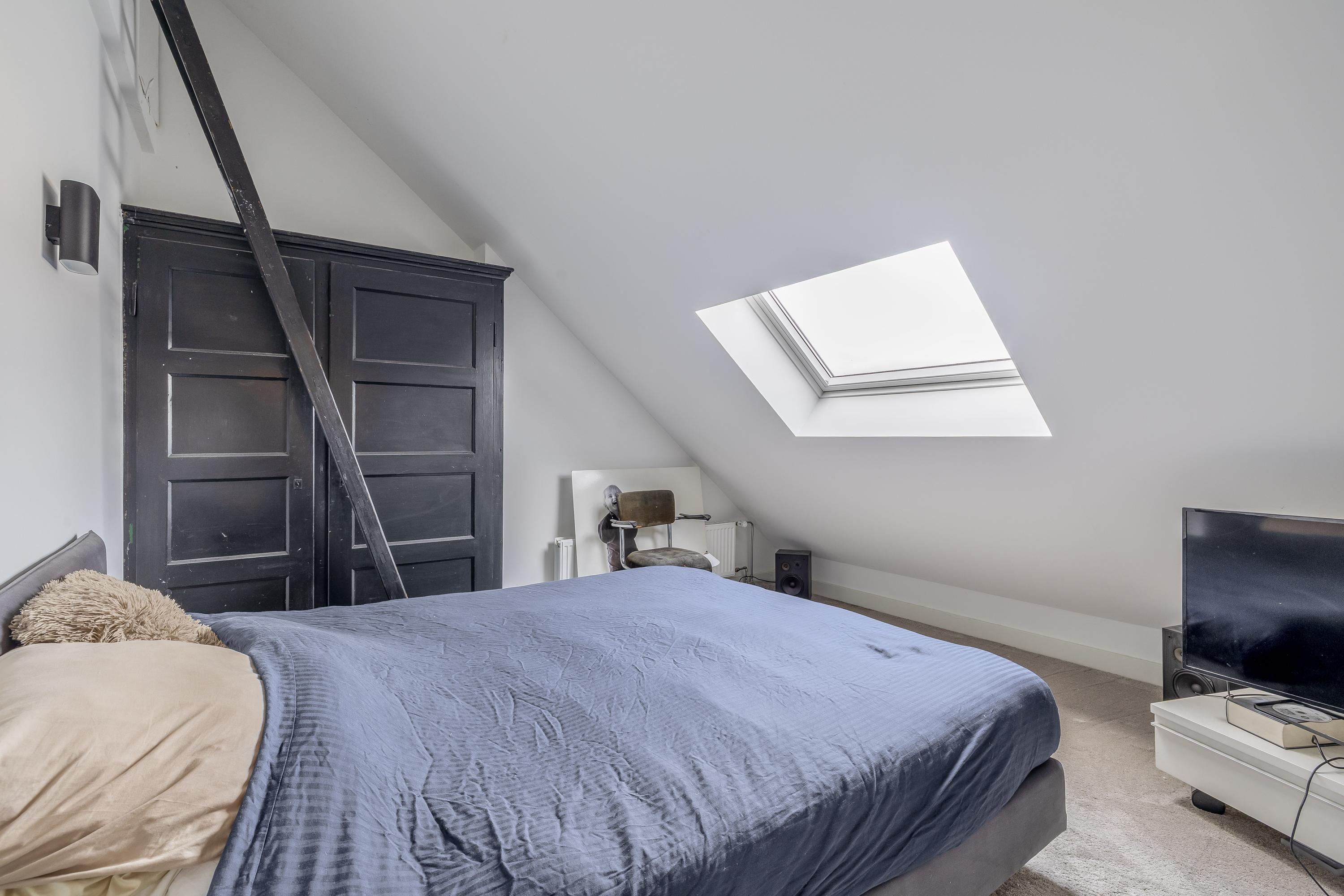 À l’étage, la suite parentale généreuse donne sur un balcon dominant les jardins urbains, tandis que les espaces modulables peuvent accueillir des chambres supplémentaires ou un bureau. Les salles de bains, rénovées avec plancher chauffant et équipements haut de gamme, créent une atmosphère de luxe discret. La performance énergétique est assurée par un label A++, quinze panneaux solaires produisant 6 000 kWh, une pompe à chaleur et un triple vitrage, rare pour une propriété de ce standing.