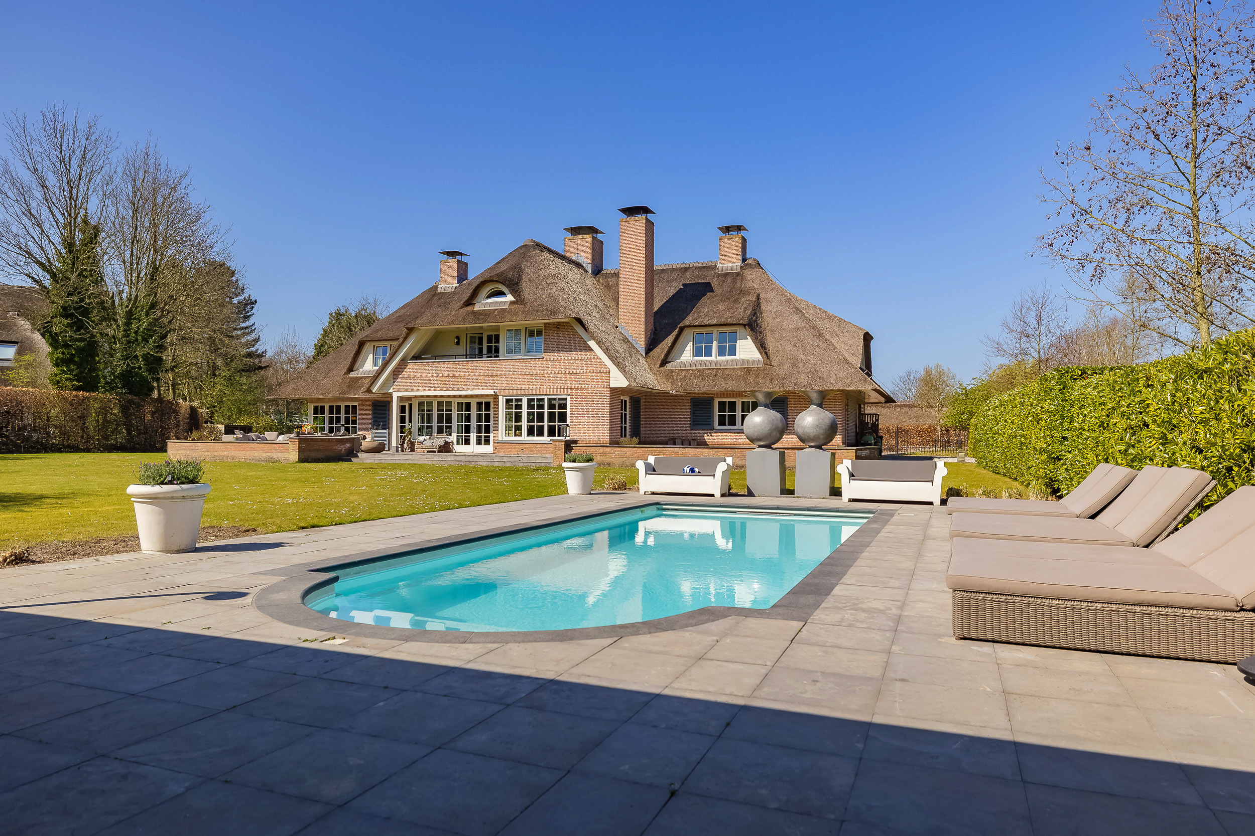 Villa Warmond Exclusive Waterfront Living s’impose comme une propriété d’exception pour ceux qui recherchent la discrétion, le prestige architectural et un cadre paisible. Cette villa à Warmond offre 491 m² d’espaces intérieurs sur un terrain généreux de 4 330 m², réalisée en 2006 sous la direction des architectes Van Egmond. Elle séduit par son élégance sobre, son toit de chaume, ses sols en béton massif au rez-de-chaussée, ses menuiseries sur mesure et ses portes d’acier raffinées. Chacune des pièces se distingue par sa lumière, son volume et sa circulation fluide.