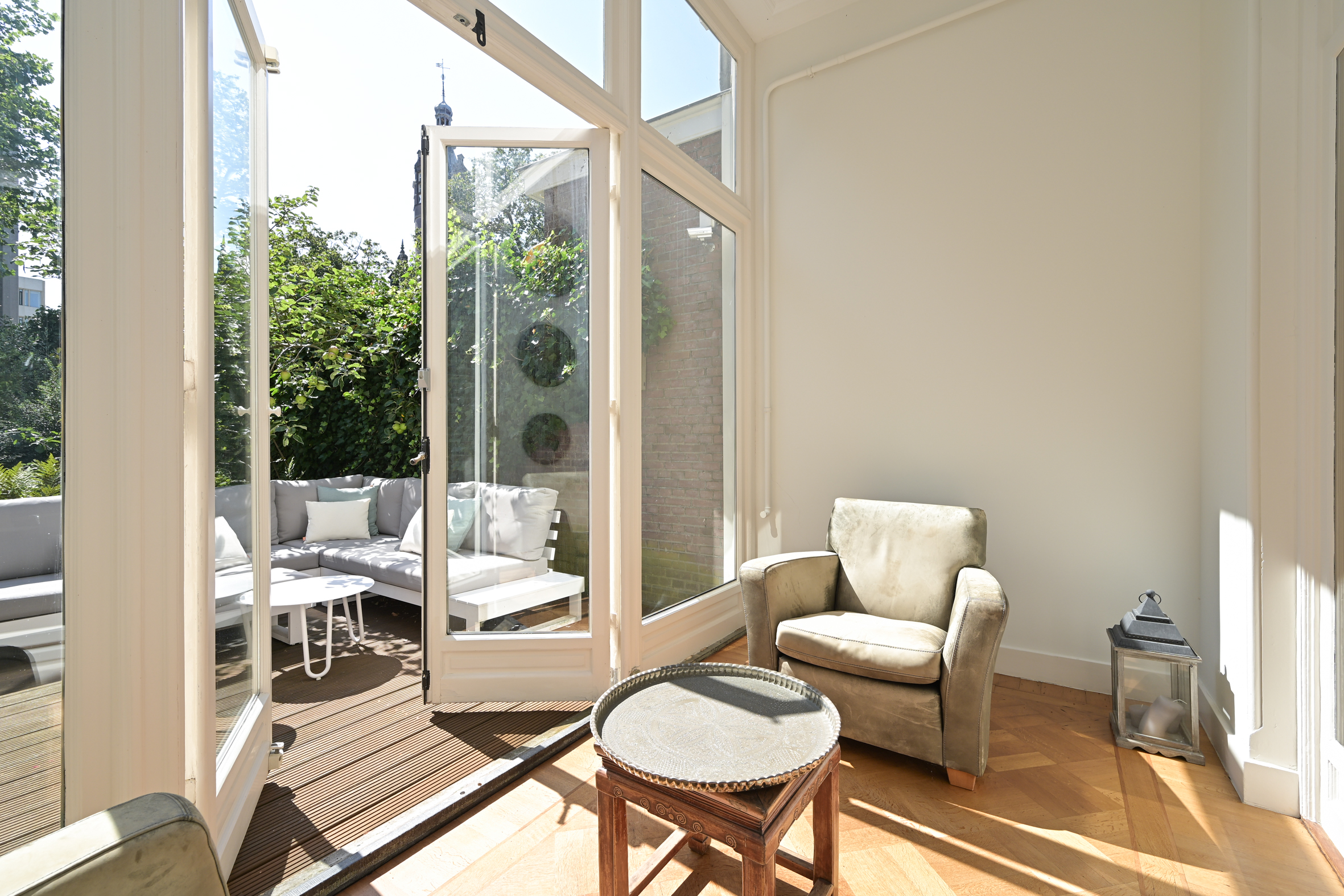 Indeling: entree, ruime hal met marmeren vloeren, tochtseparatie, brede gang met marmeren vloerdelen, fraai trappenhuis met spijltjes, open ruimte onder de trap, moderne wc met fonteintje. Royale brede kamers met marmeren schouwen (met in de voorkamer een houthaard), hoge geornamenteerde plafonds, suite separatie met schuifdeuren en vaste kasten en fraaie parketvloeren. De achterkamer heeft dubbele deuren naar de serrekamer en is eveneens in verbinding met de royale moderne keuken voorzien van (inbouw)apparatuur aan de ene zijde en een prachtige originele ingebouwde servieskast aan de andere zijde. Zowel de keuken als de serrekamer bieden toegang tot de ruime zonnige achtertuin met diverse schuurtjes en een achteringang (afsluitbare toegangsdeur aan de straat). Onder de keuken ligt een praktische kelderruimte van ca. 14 m2 en 1,81m hoog.